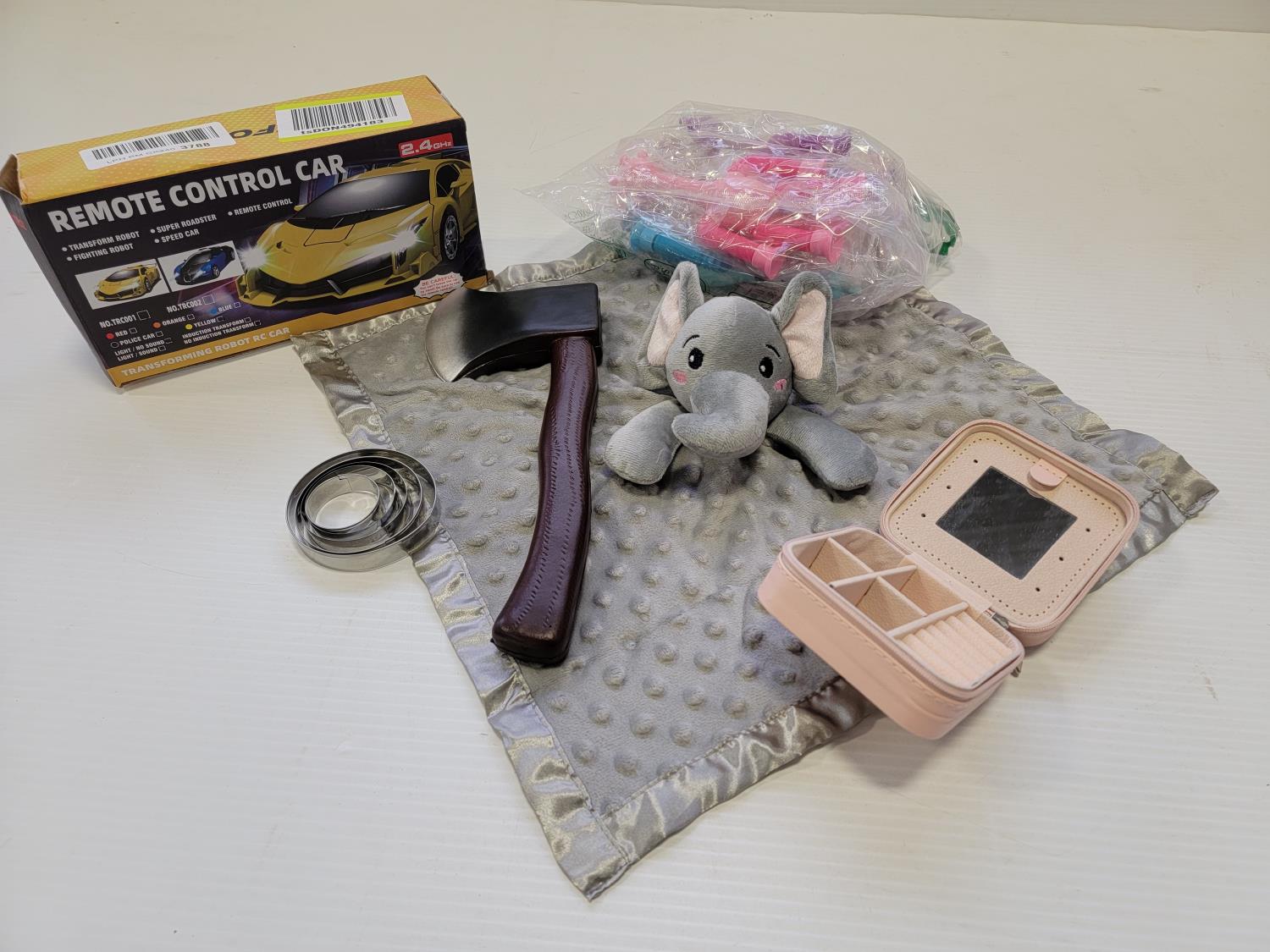 remote control car, baby blanket, jewelry box, plastic axe