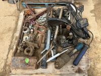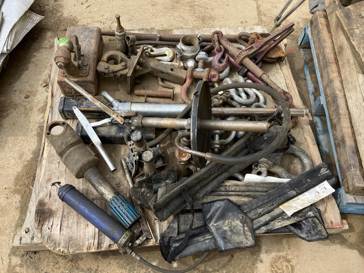 qty of shackles, (2) ratchet load binders, (2) truck hitches, (2) pry bars, grease gun, PTO attachment, vehicle jack handles and extension