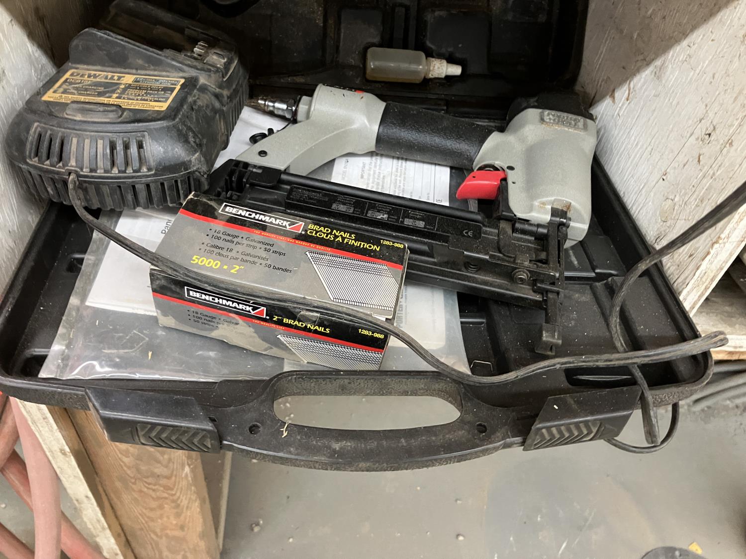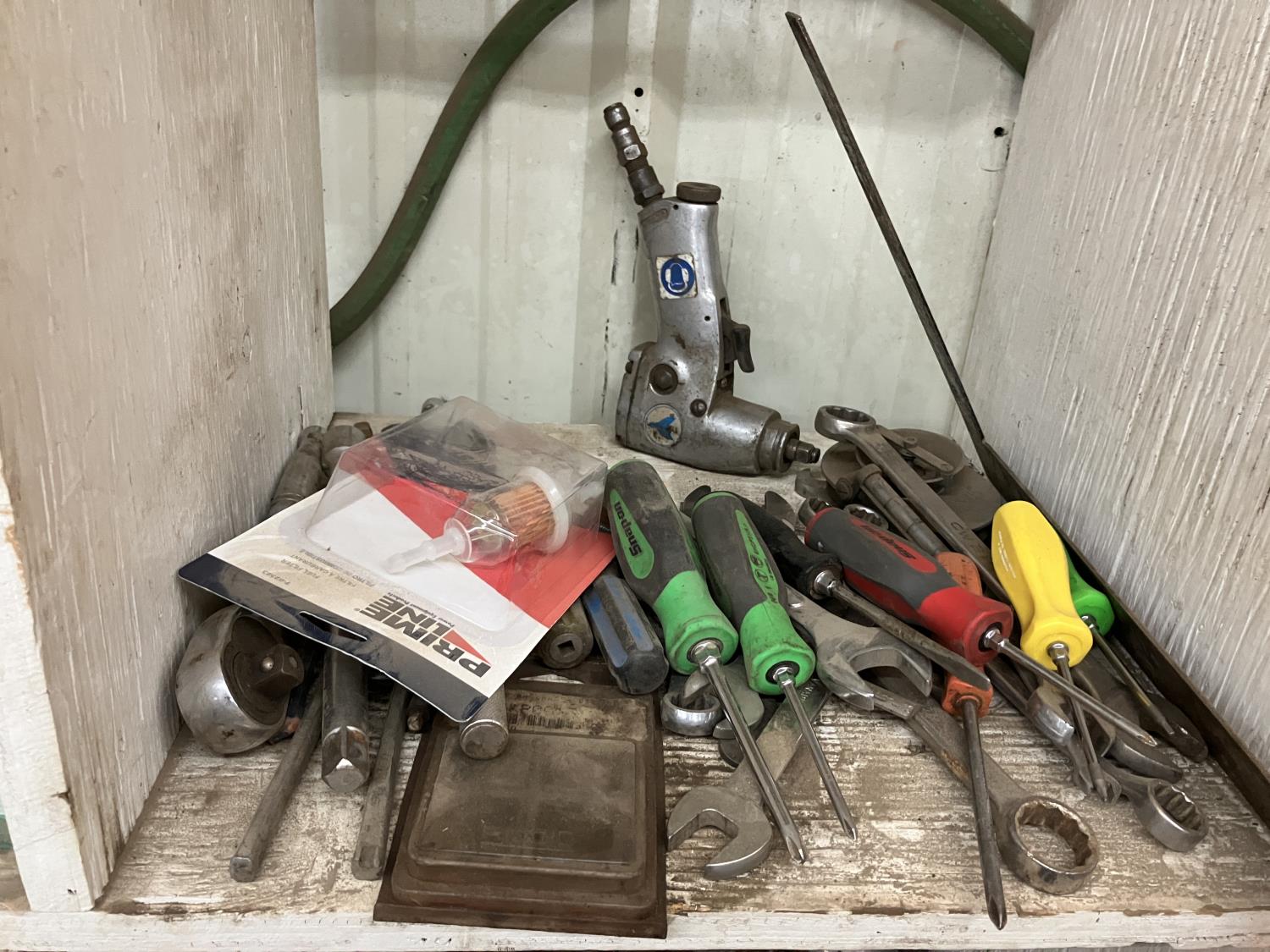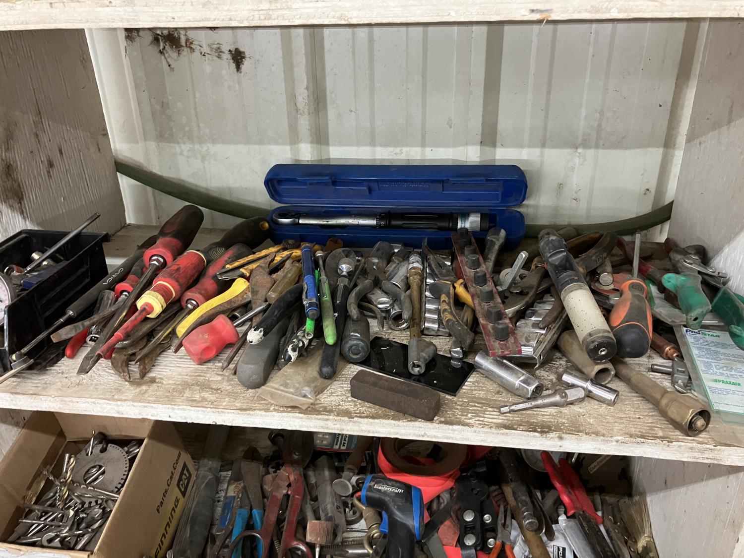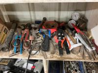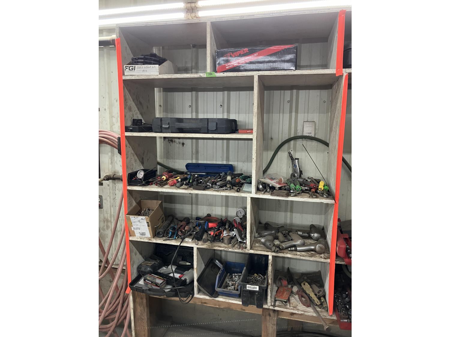 Air tools, screwdrivers, nail gun, sockets, pliers, tin snips, (16) piece new metric combination wrench set, torque wrench, miscellaneous hardware