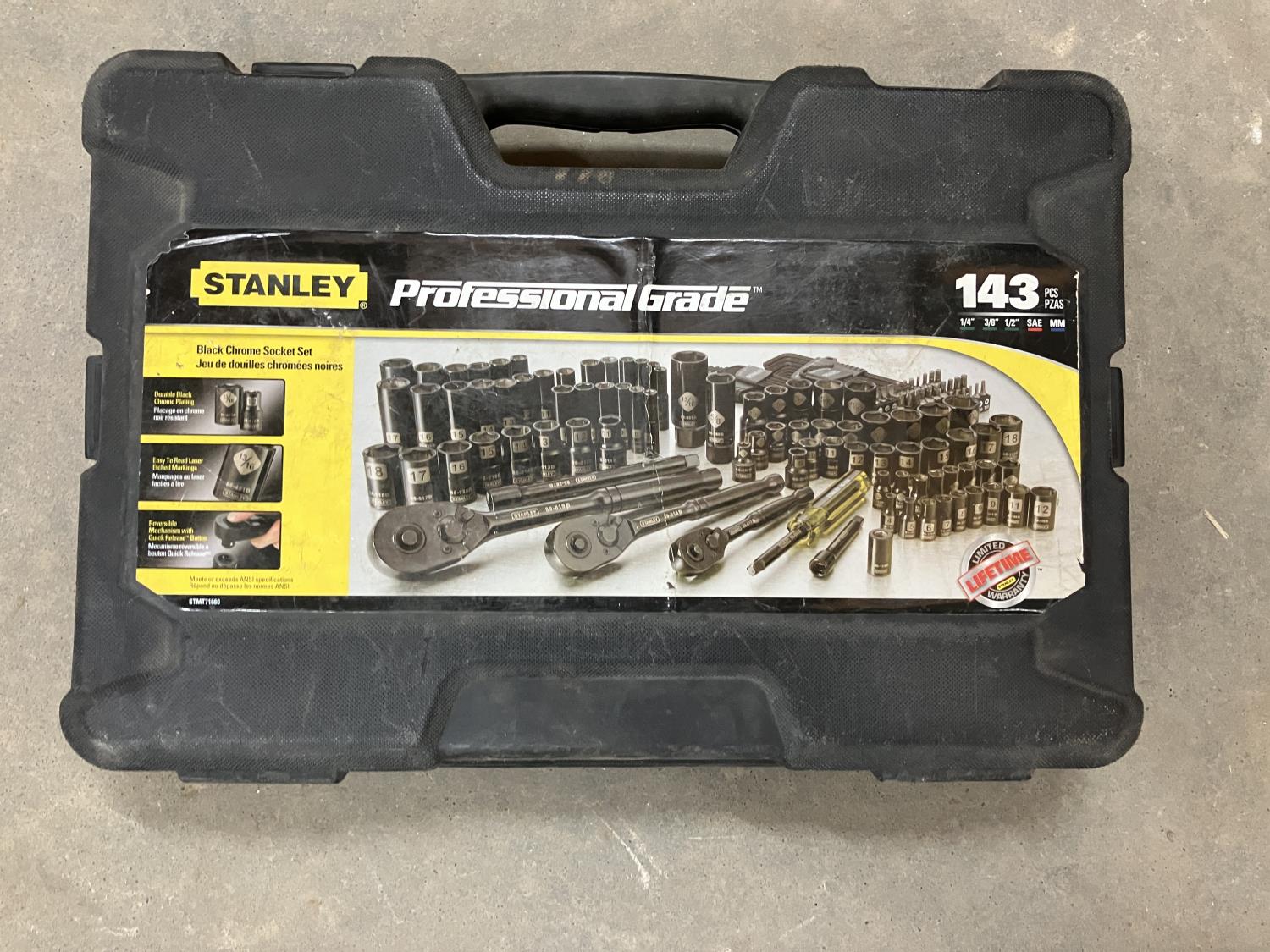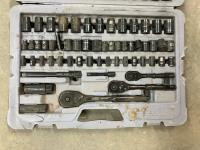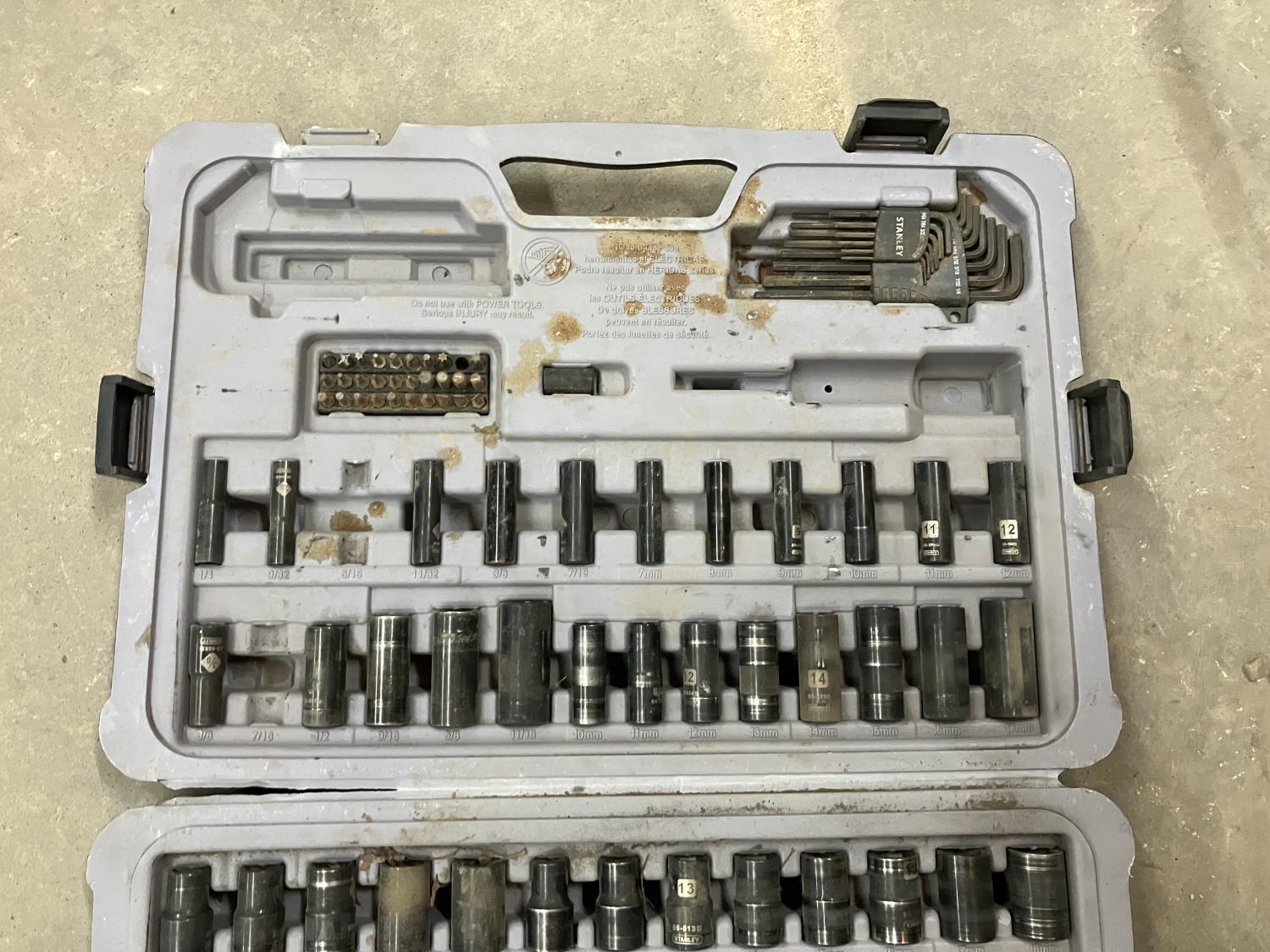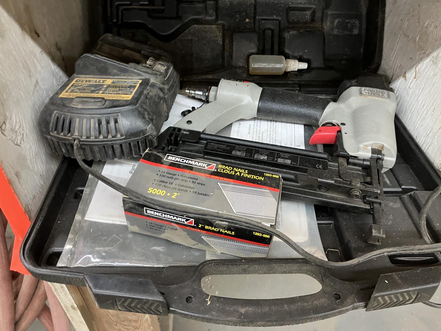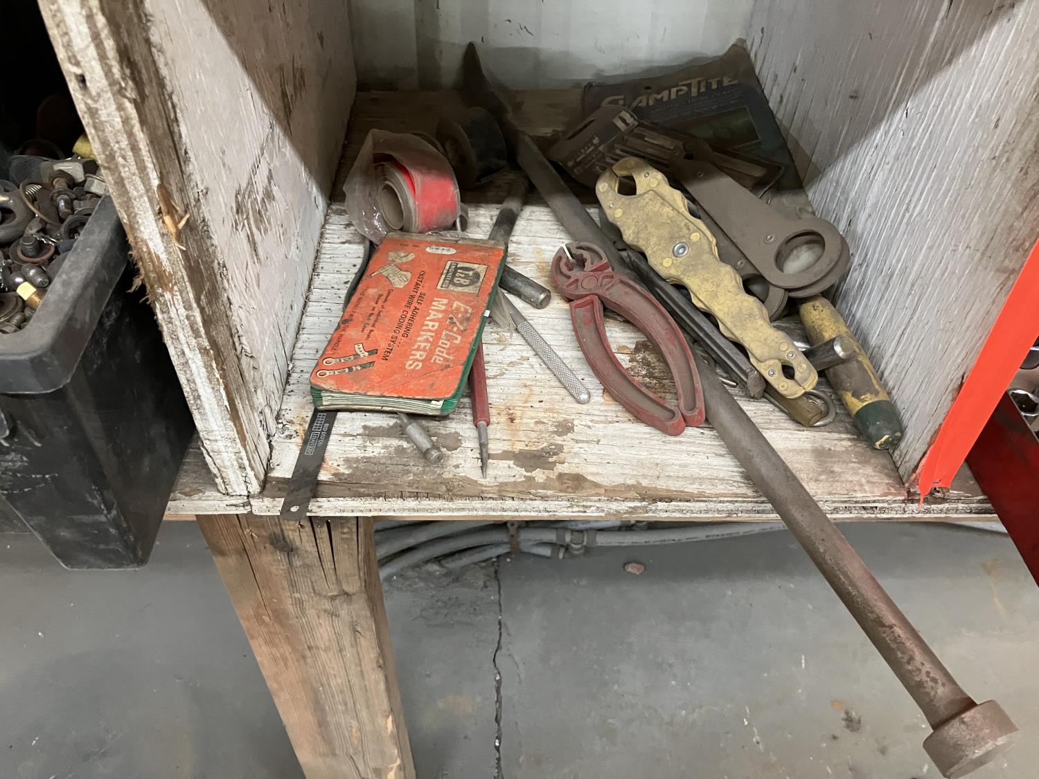 Air tools, screwdrivers, nail gun, sockets, pliers, tin snips, (16) piece new metric combination wrench set, torque wrench, miscellaneous hardware