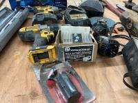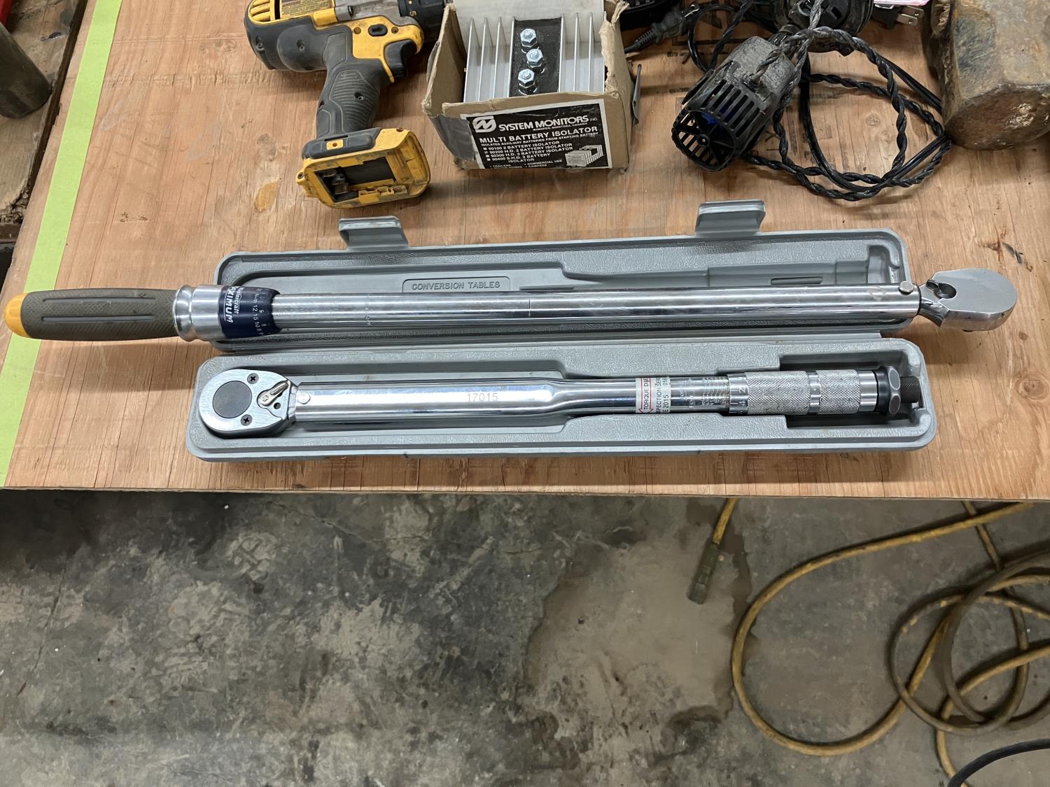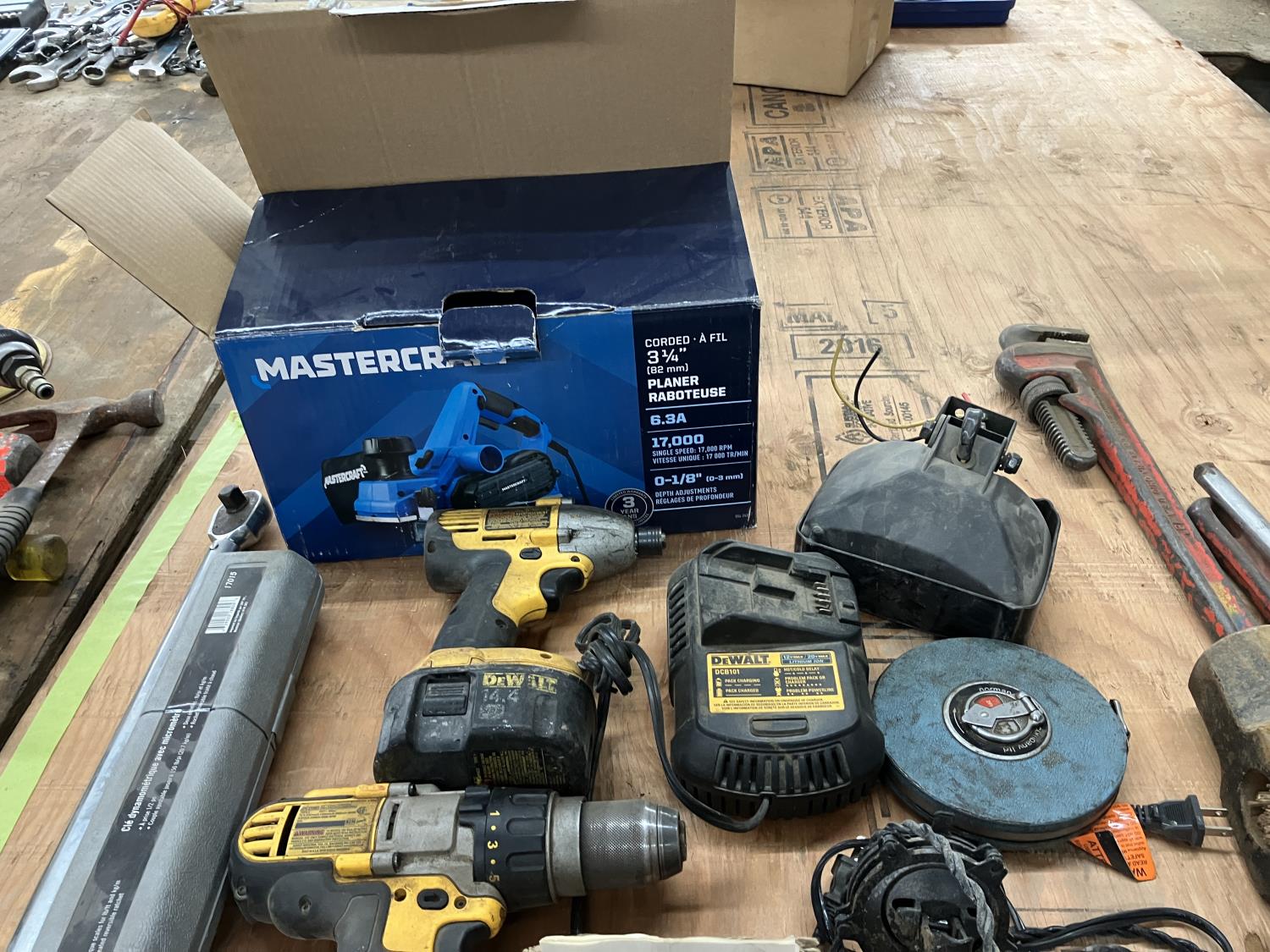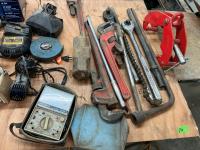 (4) Pipe wrenches, (2) 1 inch drive ratchets, (2) 1/2 " torque wrenches, Multi Battery isolator, 3 inch corded planer, (2) cordless DeWalt with charger, miscellaneous tools