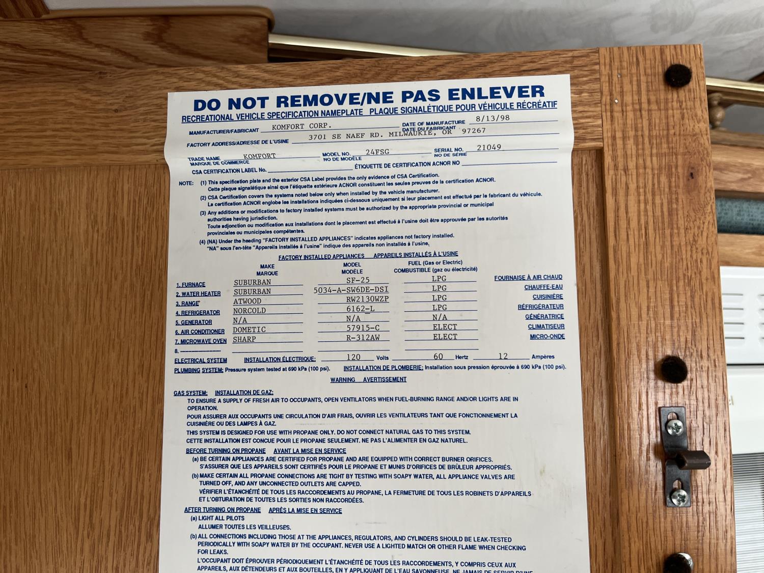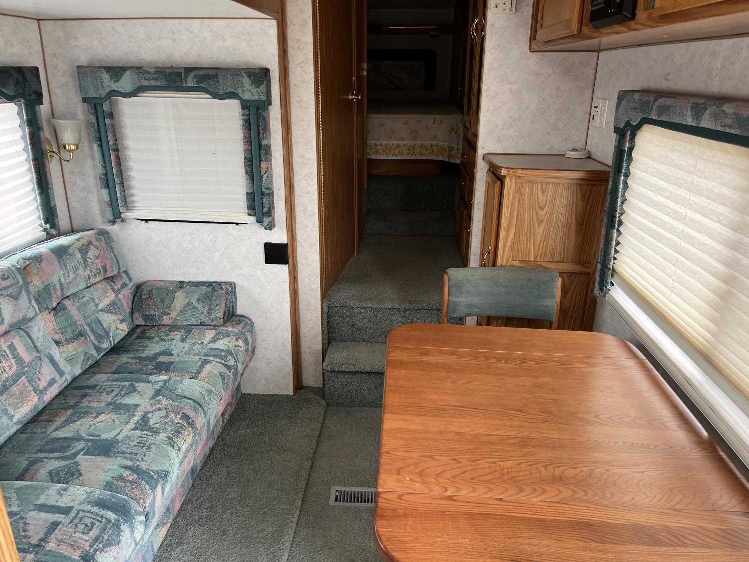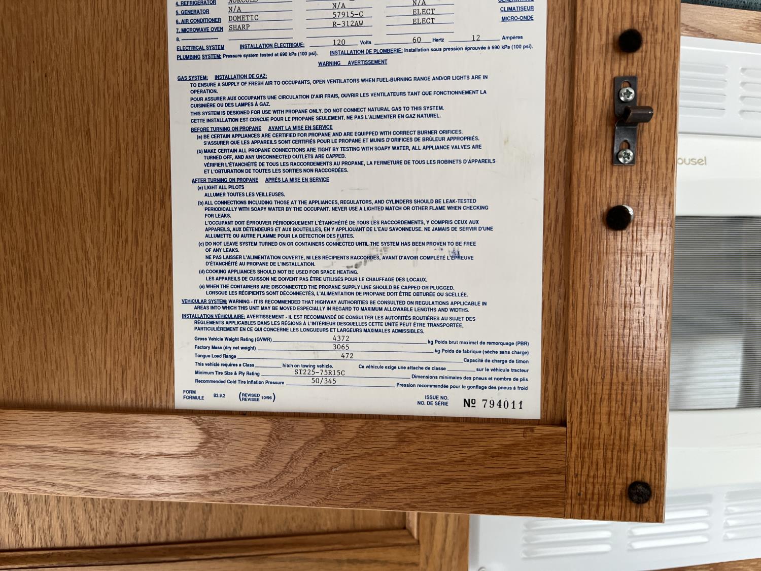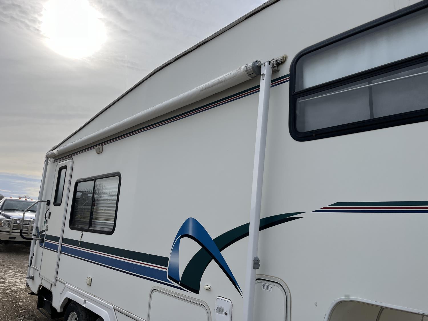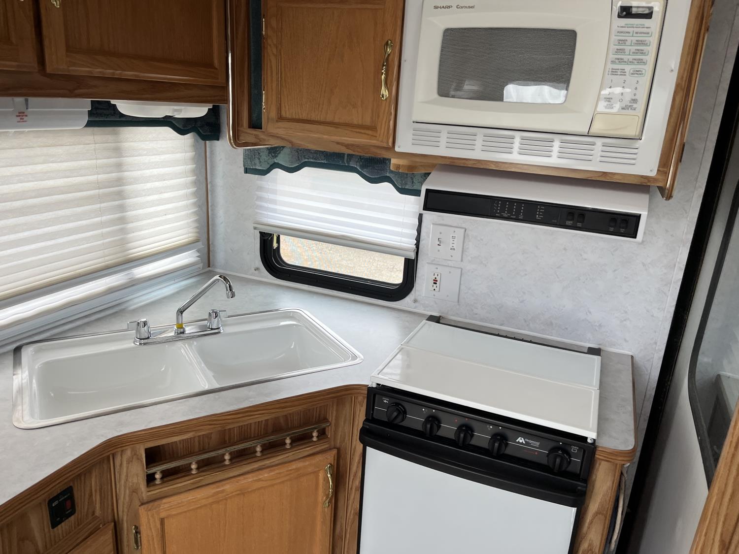 stove, fridge, microwave, full bath, A/C, 1 slide, manual awning, 225/75R15 tires