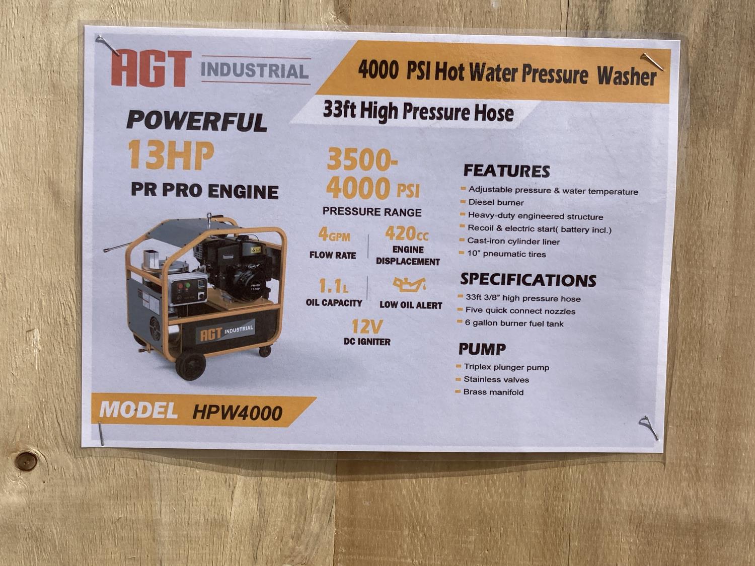 56 2024 AGT HPW4000 4000 PSI Hot Water Pressure Washer (Unused)