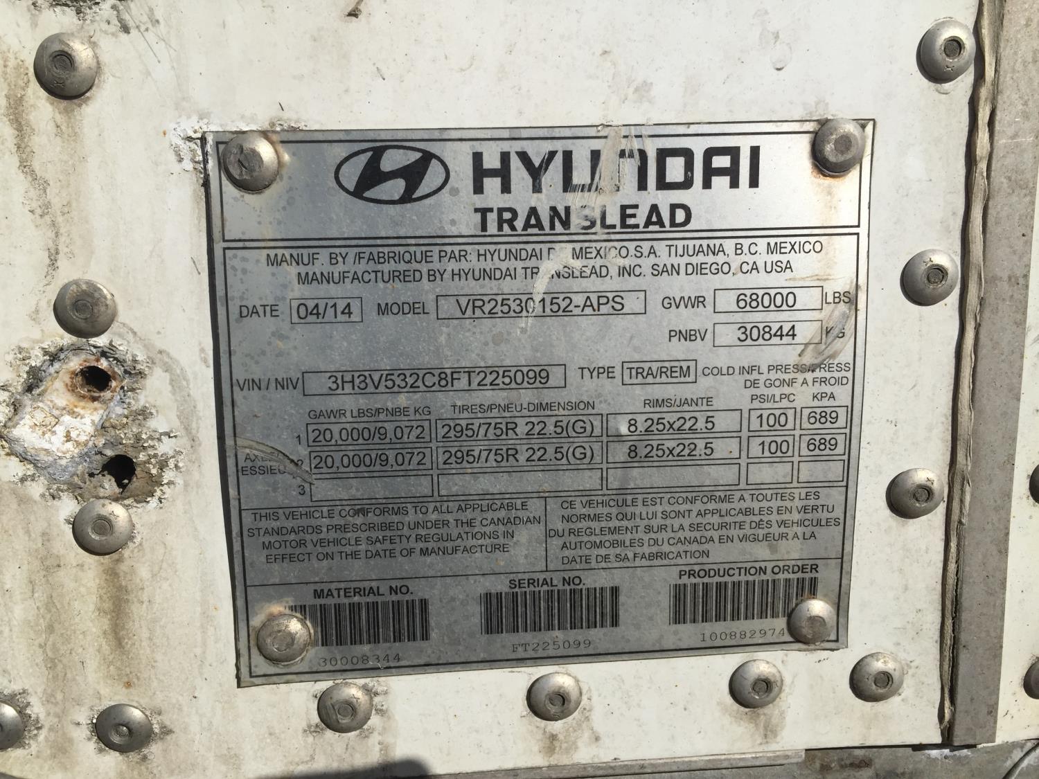 315 2015 Hyundai VR2530152-APS 53 Ft T/A Reefer Van Trailer