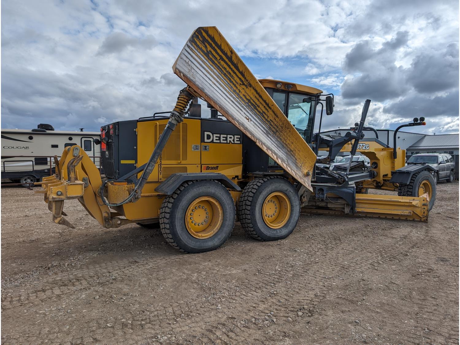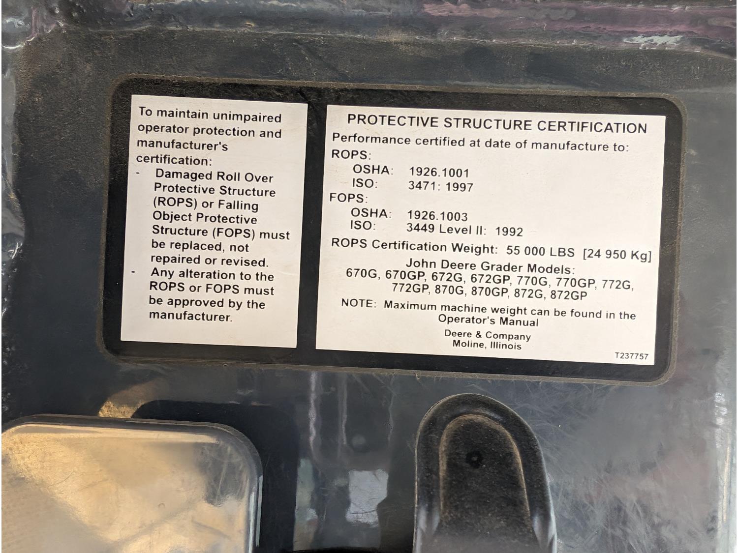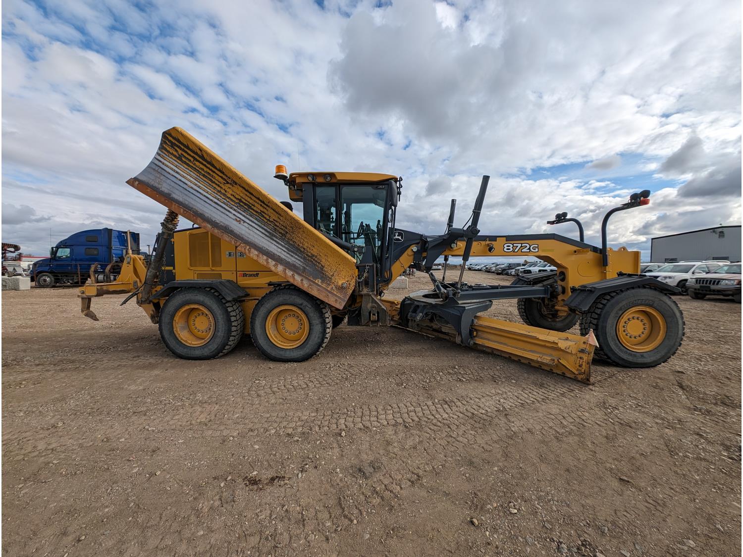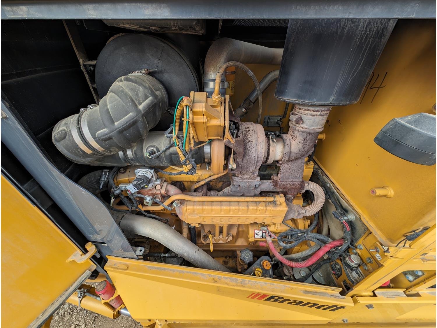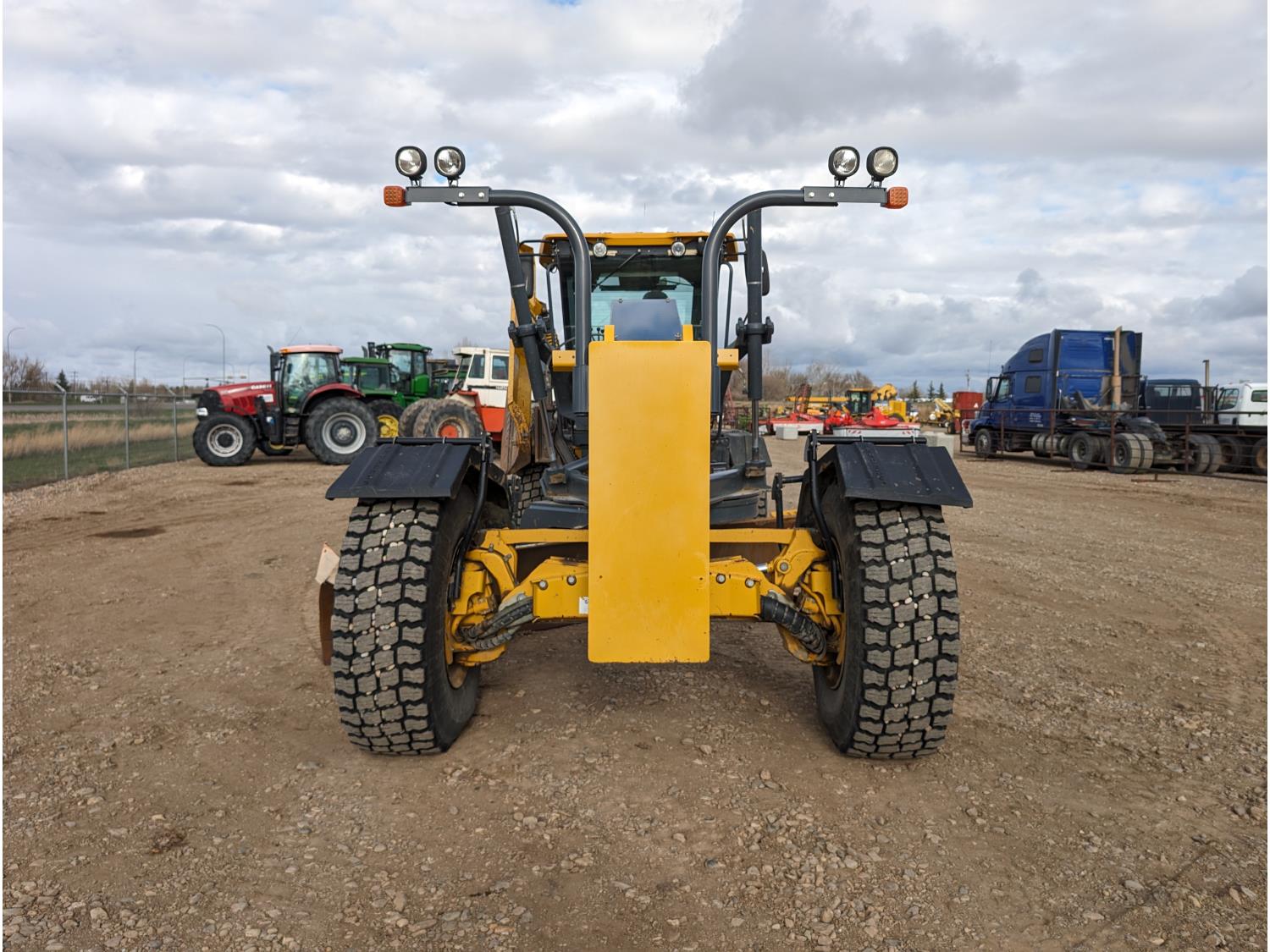 Enclosed cab, A/C, air ride seat, differential lock, 14 Ft moldboard, 2 Ft moldboard extensions, rear ripper / scarifier, front auxiliary hydraulics, snow wing, 17.5R25 tires