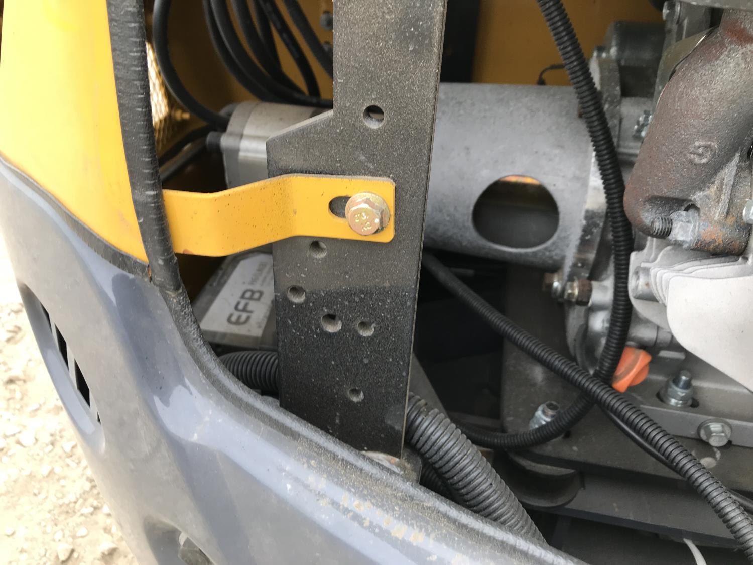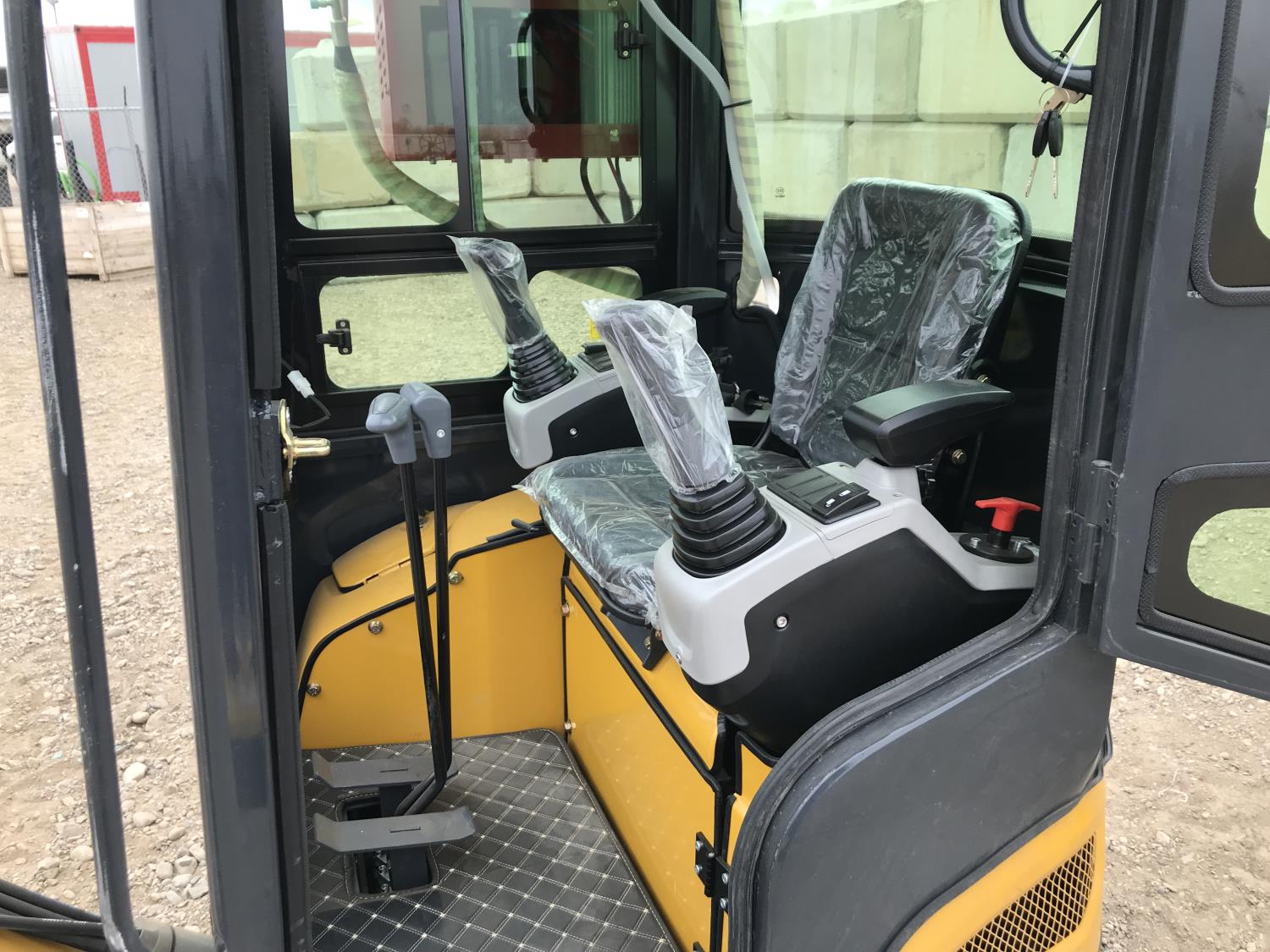 Enclosed cab, A/C, 17 inch dig bucket, manual coupler, manual thumb, 28 inch stick, backfill blade, 7 inch rubber tracks