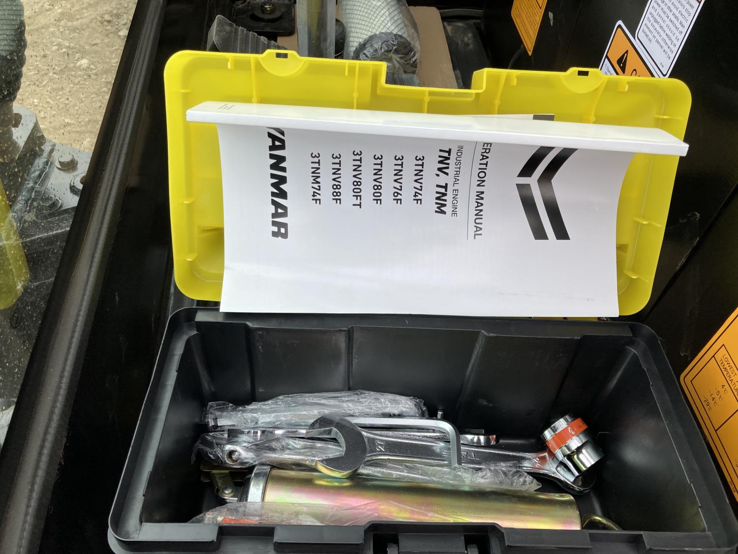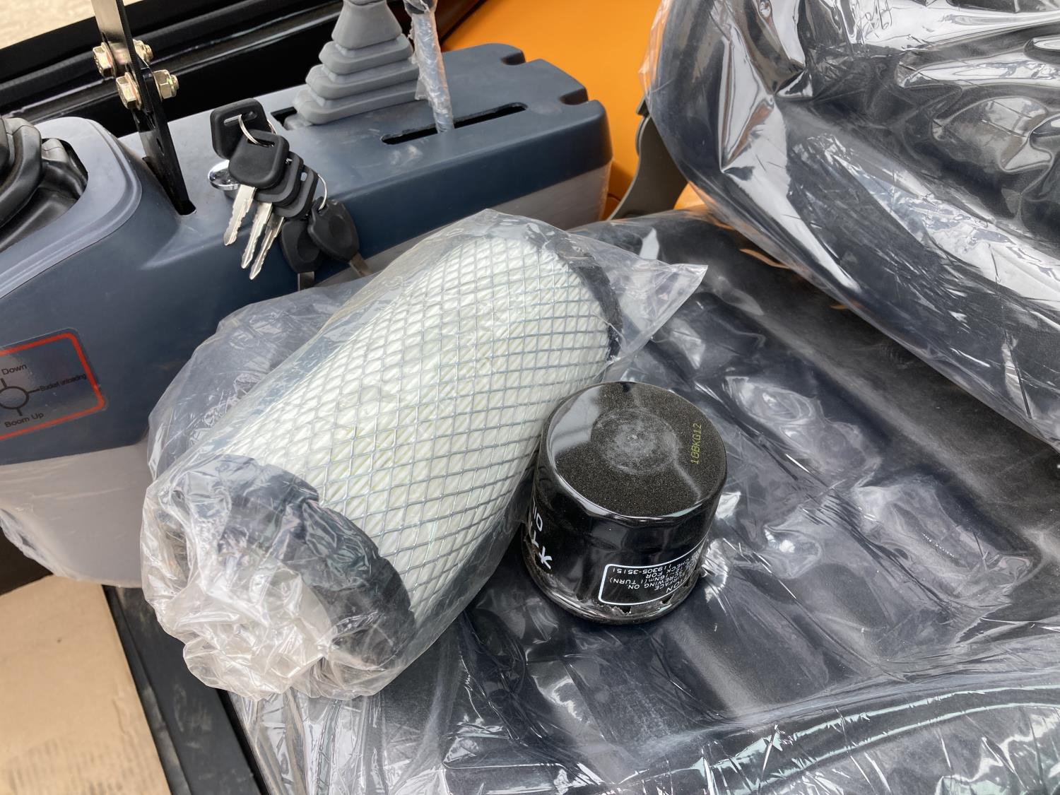 Enclosed cab, 20 inch dig bucket, manual coupler, hydraulic thumb, 46 inch stick, backfill blade, 9 inch rubber tracks