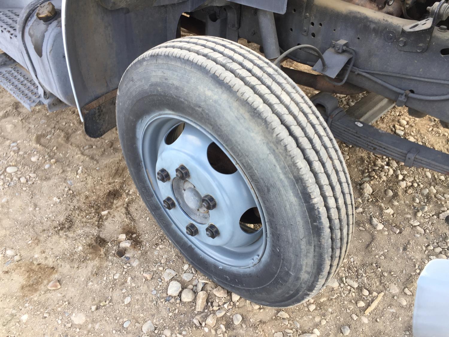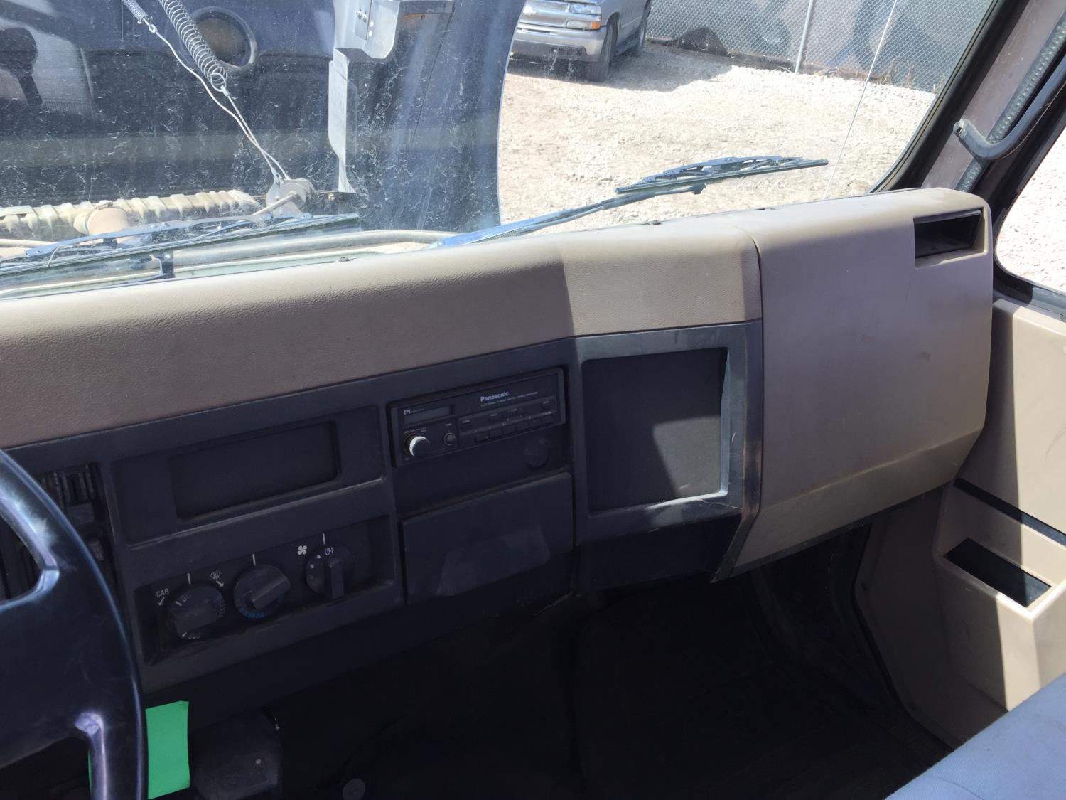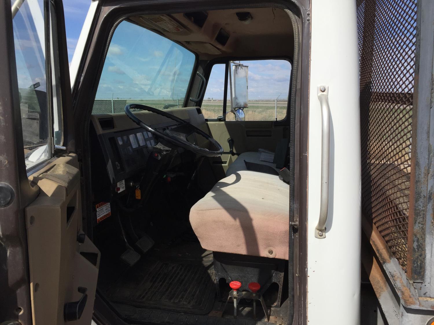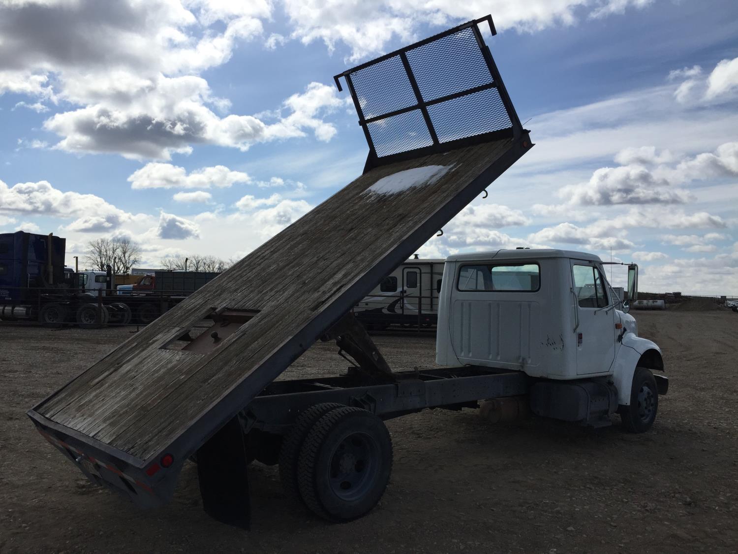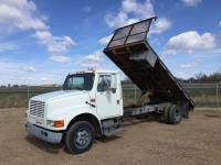International 7.3 L V8 diesel engine, electric engine block heater, 5 speed manual transmission, radio, hydraulic wet kit, steel headache rack, steel tool boxes, 16 ft x 92 inch deck, hoist, spring suspension, 4.33 ratio, 199 inch WB, 6000 lb front axle, 15500 lb rear axle, 8R19.5 tires