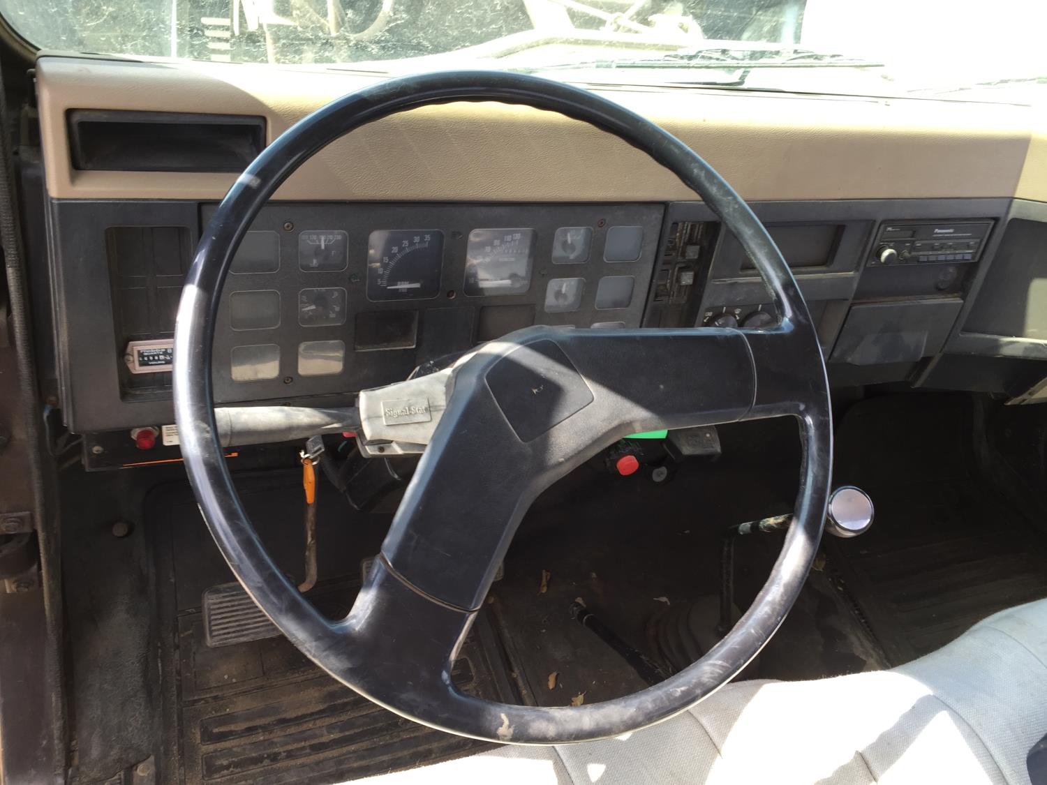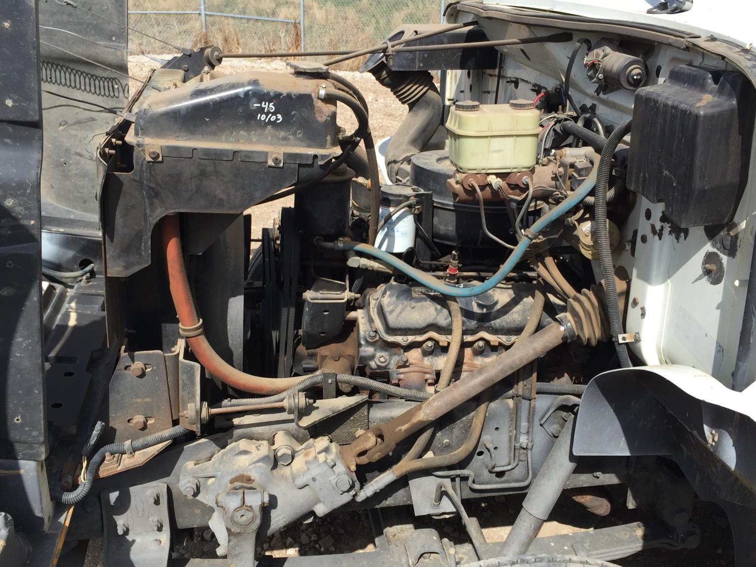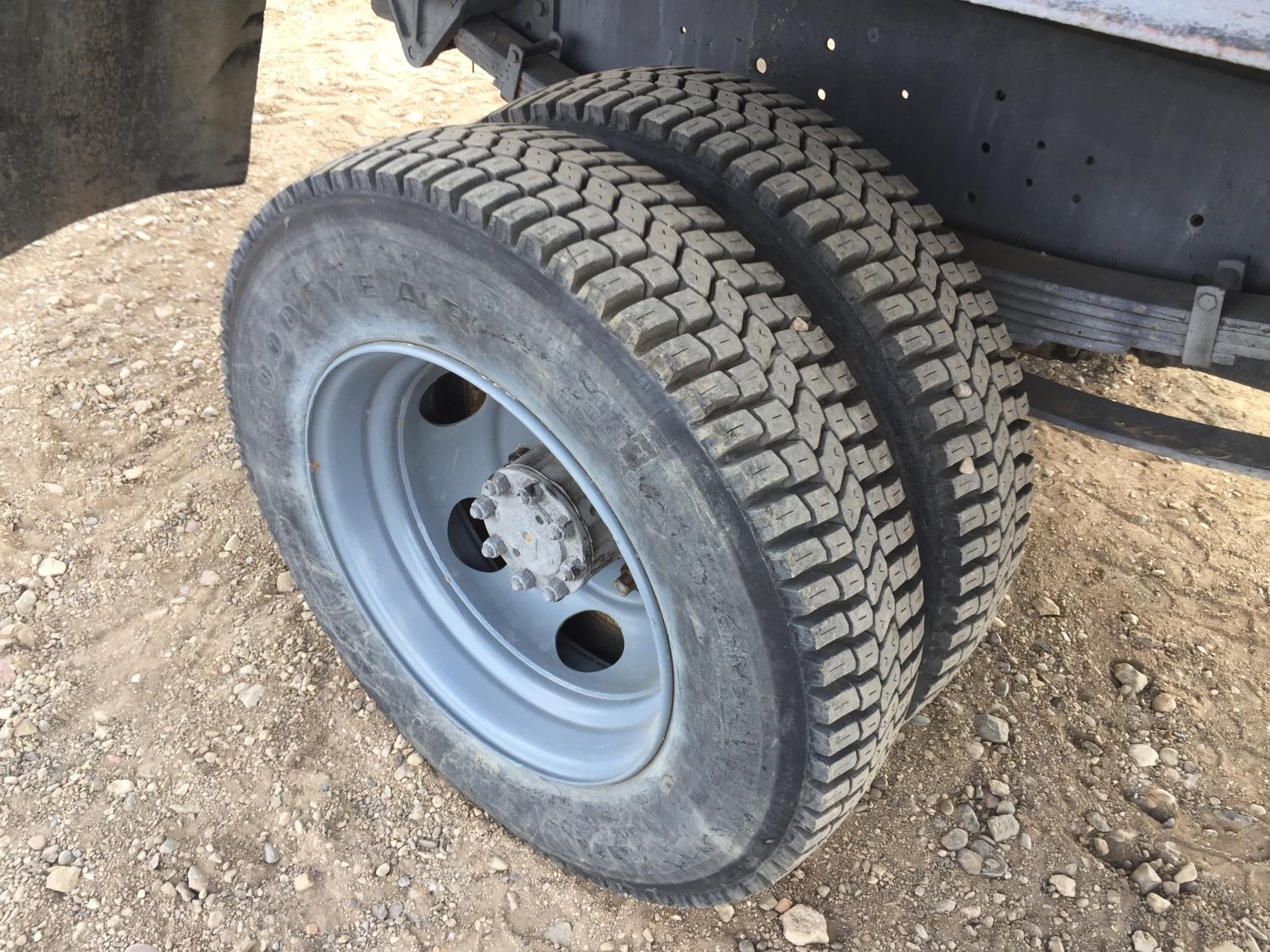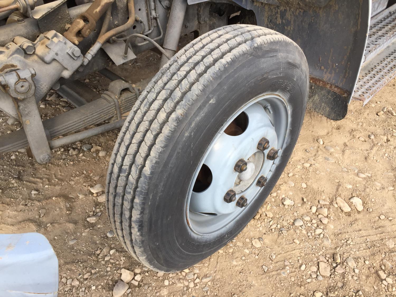 International 7.3 L V8 diesel engine, electric engine block heater, 5 speed manual transmission, radio, hydraulic wet kit, steel headache rack, steel tool boxes, 16 ft x 92 inch deck, hoist, spring suspension, 4.33 ratio, 199 inch WB, 6000 lb front axle, 15500 lb rear axle, 8R19.5 tires