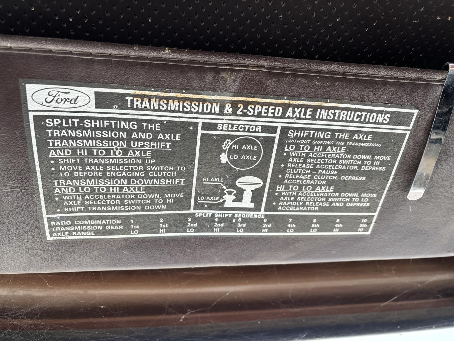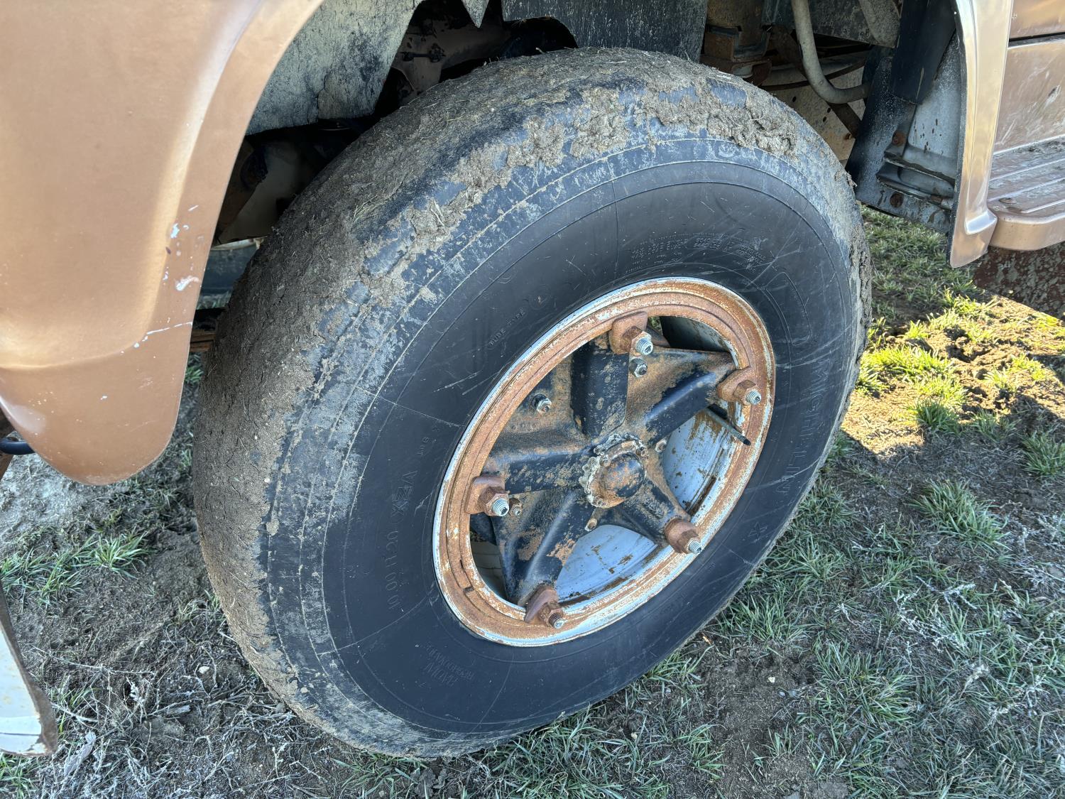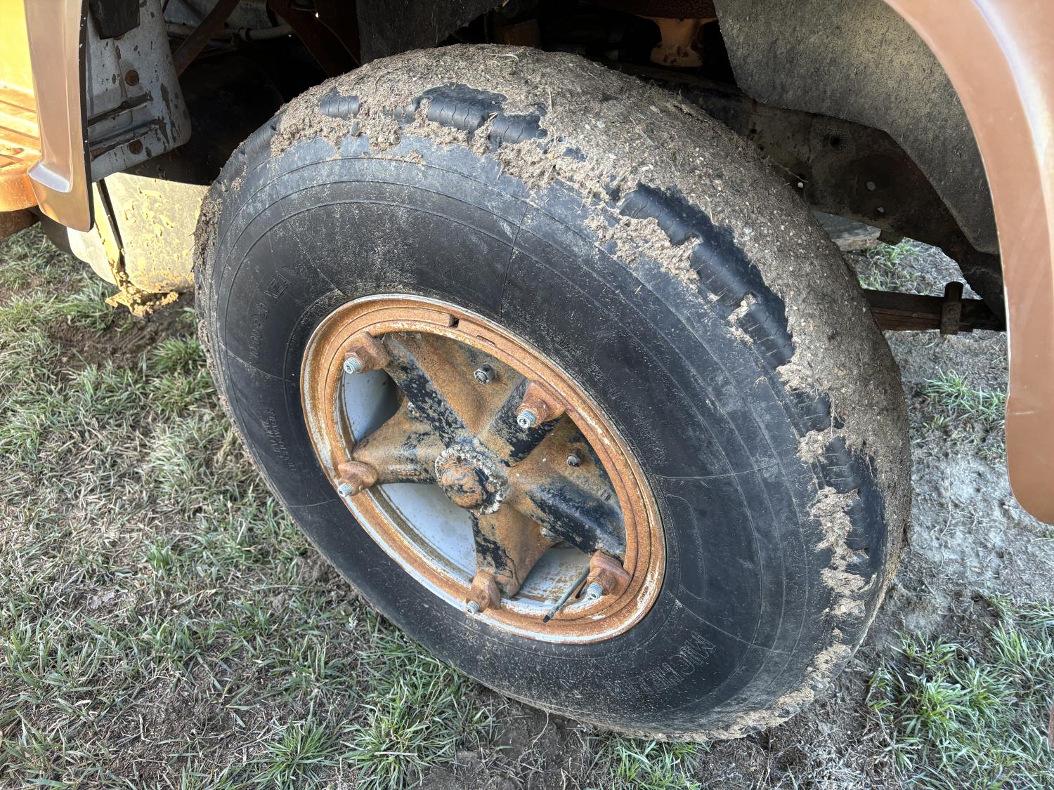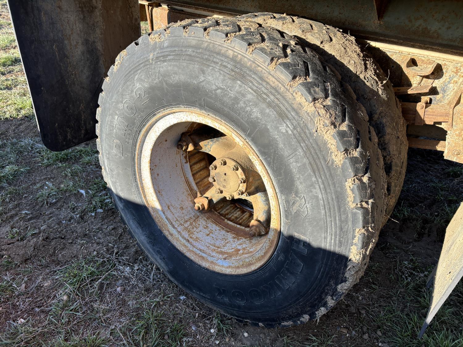 Ford 361 cu in V8 gas engine, manual transmission, 5 speed transmission with 2 speed diff, hydraulic wet kit, 16 ft box, hoist, roll tarp, spring suspension, 7,000 lb front axle, 16,244 lb rear axles, 184 inch WB, 10.00R20 tires