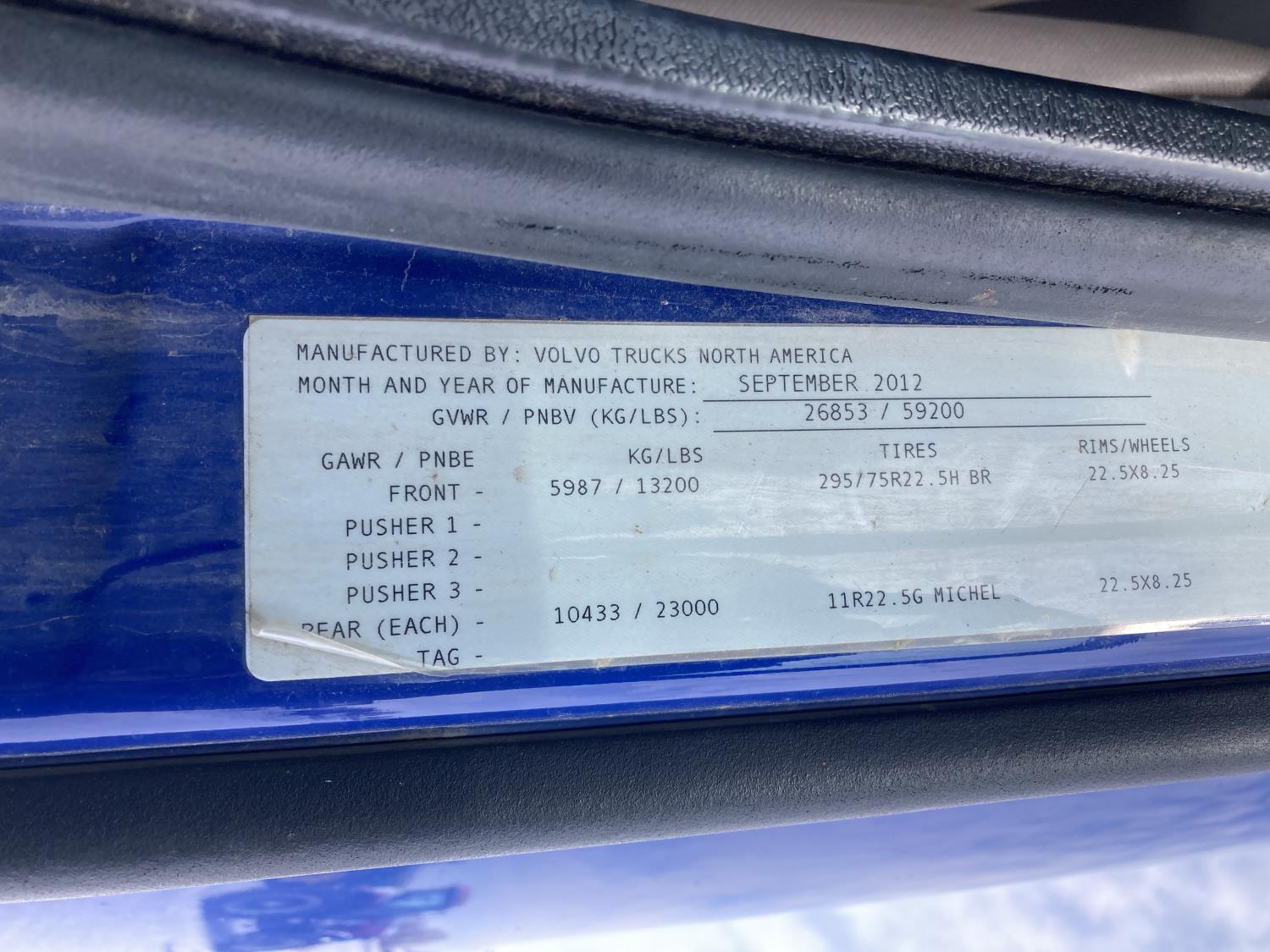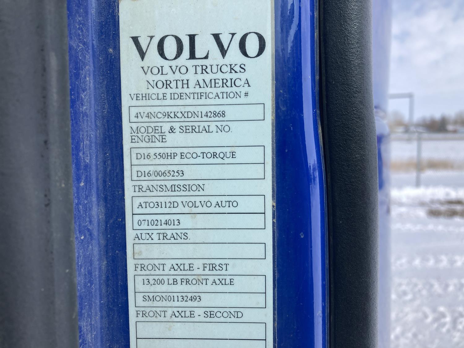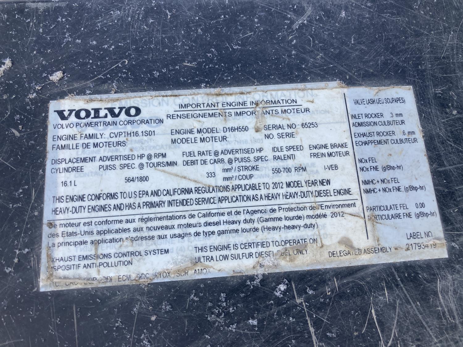 Volvo D16H550 16.1 L 6 cylinder 564 HP diesel engine, engine brake, engine block heater, Volvo automatic transmission, cab heater, high rise 77 inch sleeper, bunk beds, A/C, cruise control, leather interior, air ride driver seat, radio, CB radio, stereo, aluminum moose bumper, air ride suspension, 13,200 lb front axle, 46,000 lb rear axles, diff lock, 3.42 ratio, 254 inch WB, all aluminum wheels, 11R22.5 tires