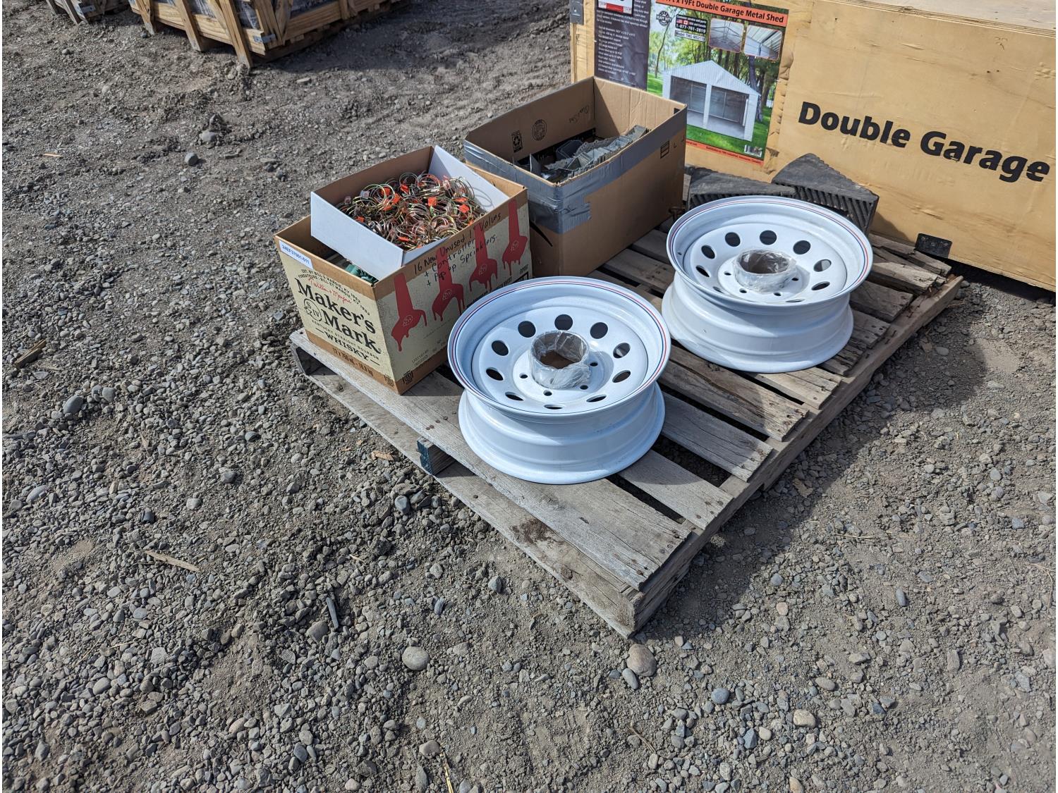 470 (2) 16 Inch Trailer Wheels, Irrigation Parts, Joist Hangers & Hose Clamps