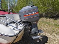 Mariner 200 HP outboard engine, walk through open bow, (2) pedestal seats, bench seat, windshield wiper, swim ladder, Shorlander trailer, Carlisle 185/80R13 tires, driving cover