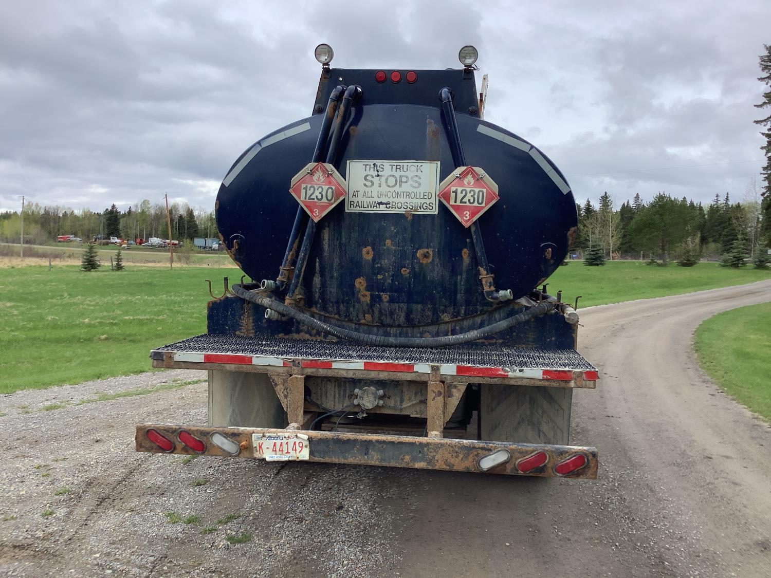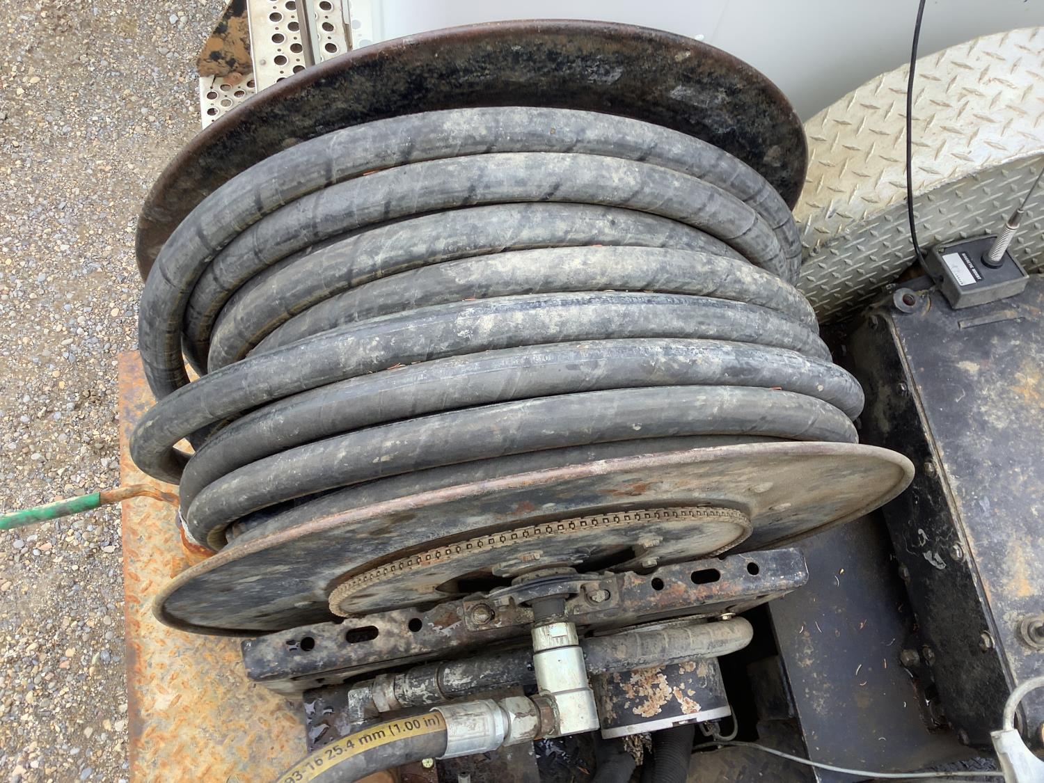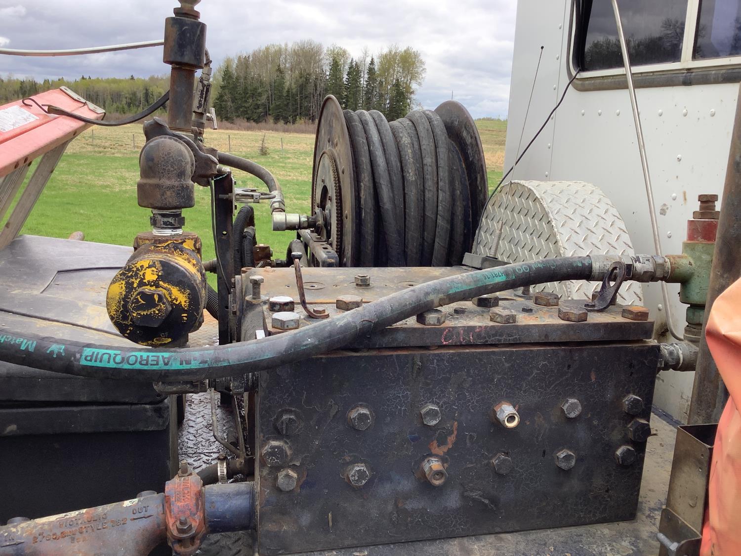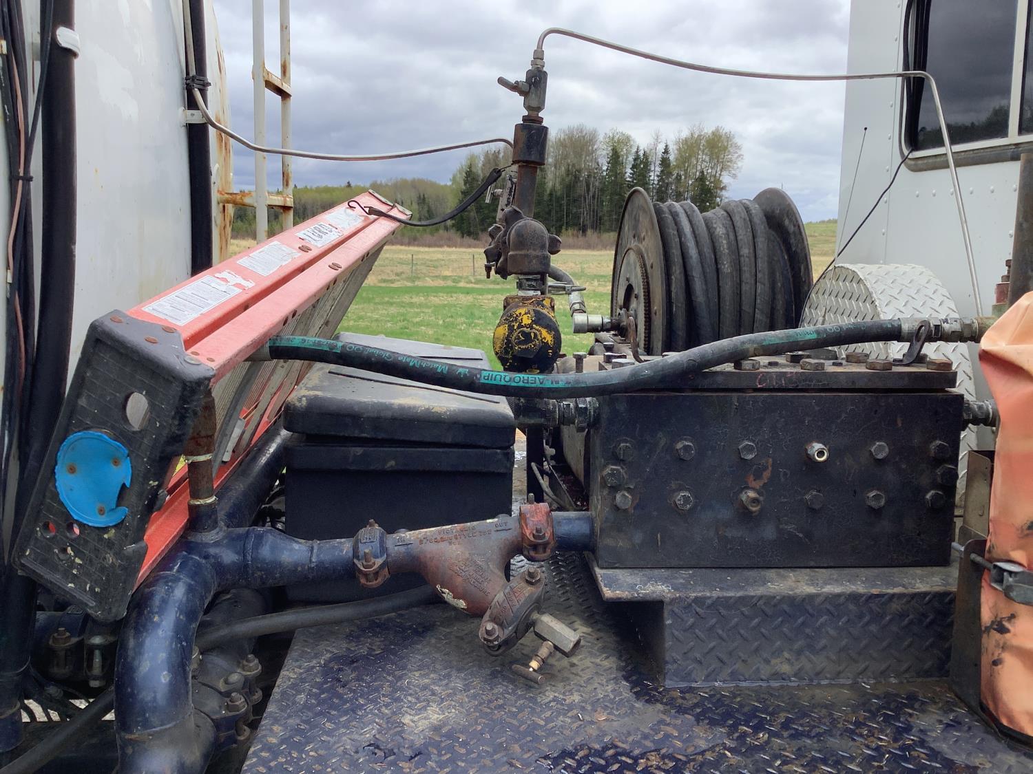 Cummins 8.3 liter diesel engine, engine brake, 10 speed manual transmission, AC, 12000 lb front axle, 23000 lb rear axle, differential lock, air ride suspension, Jasper 3 compartment 8200 liter tank with auto shut off belly valves and vents, electric hose reel, 5000 PSI 5 plunger pump, aluminum rims, 11R22.5 tires