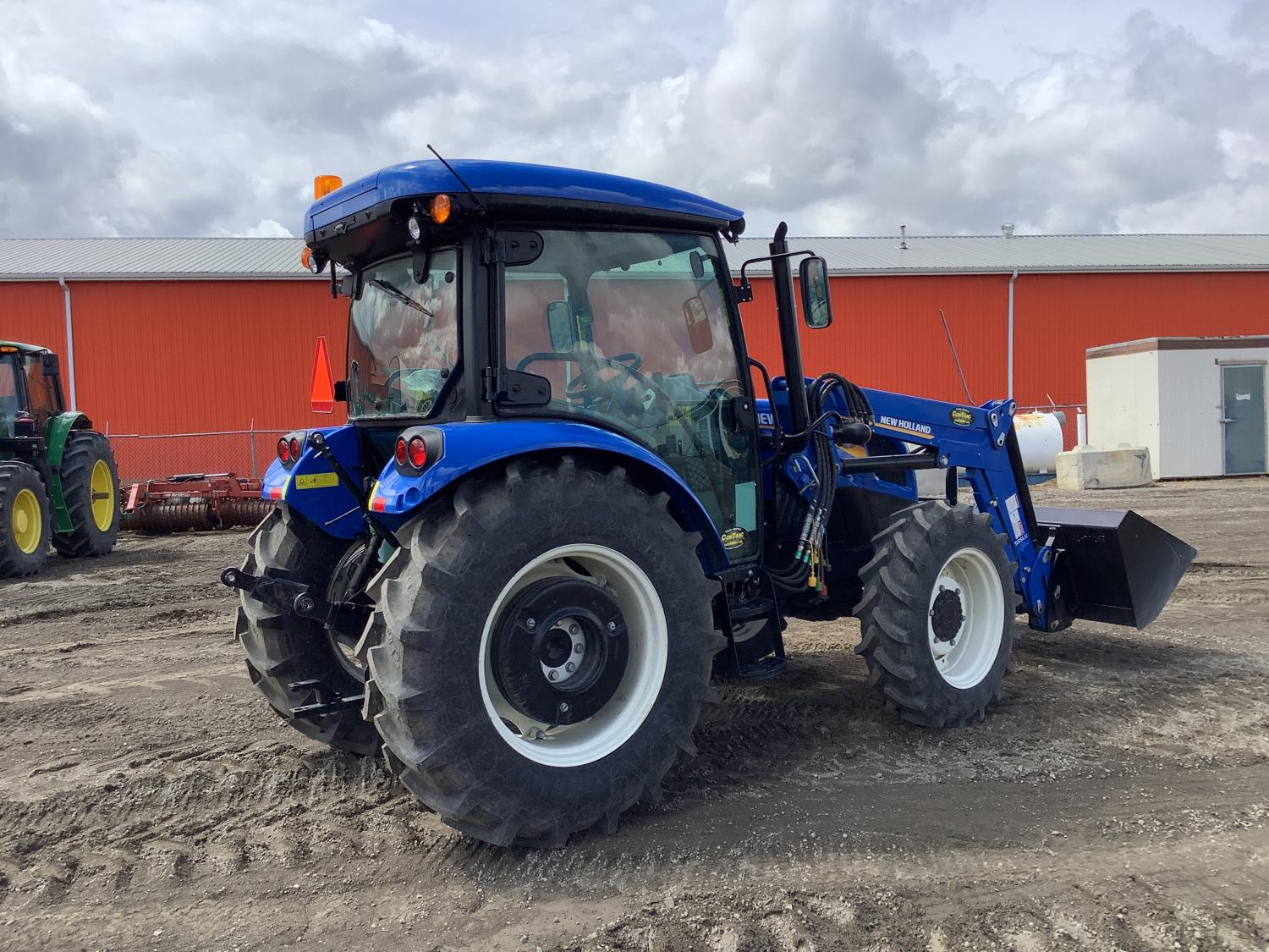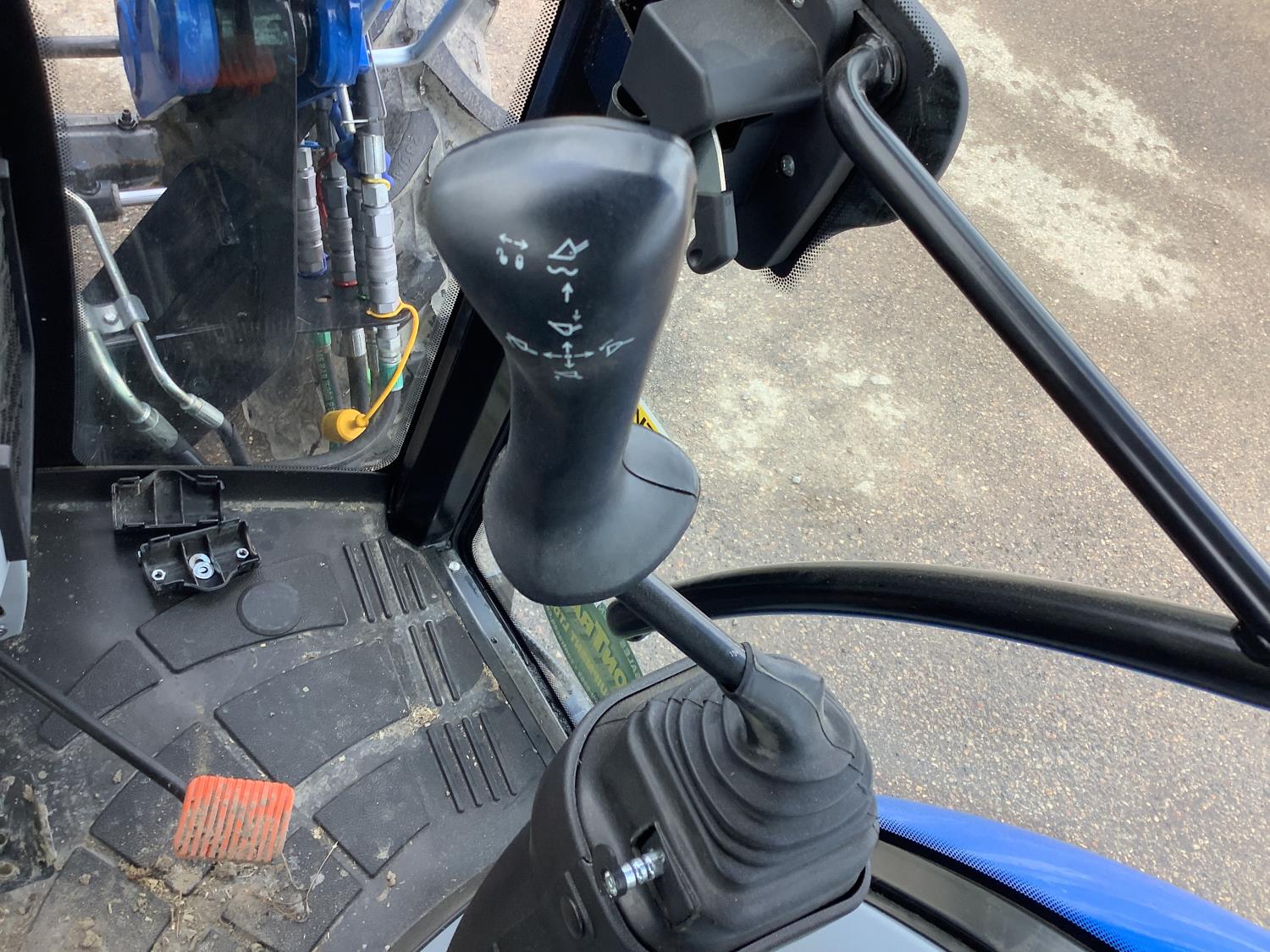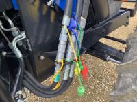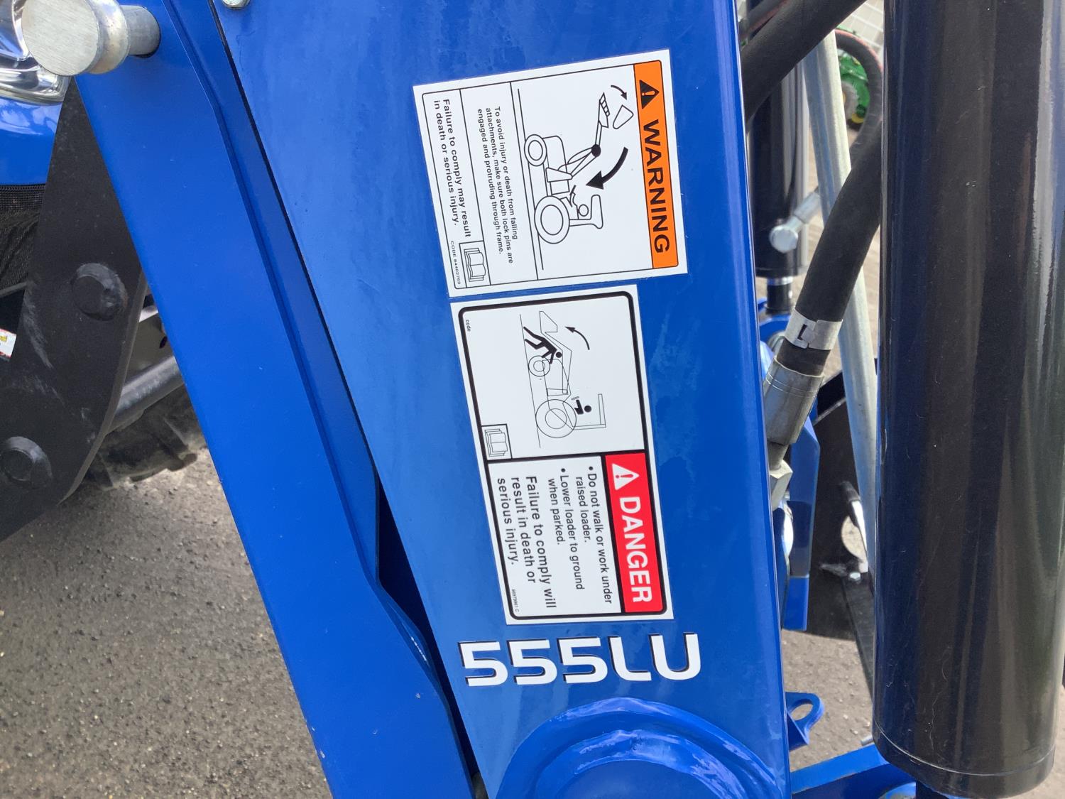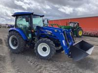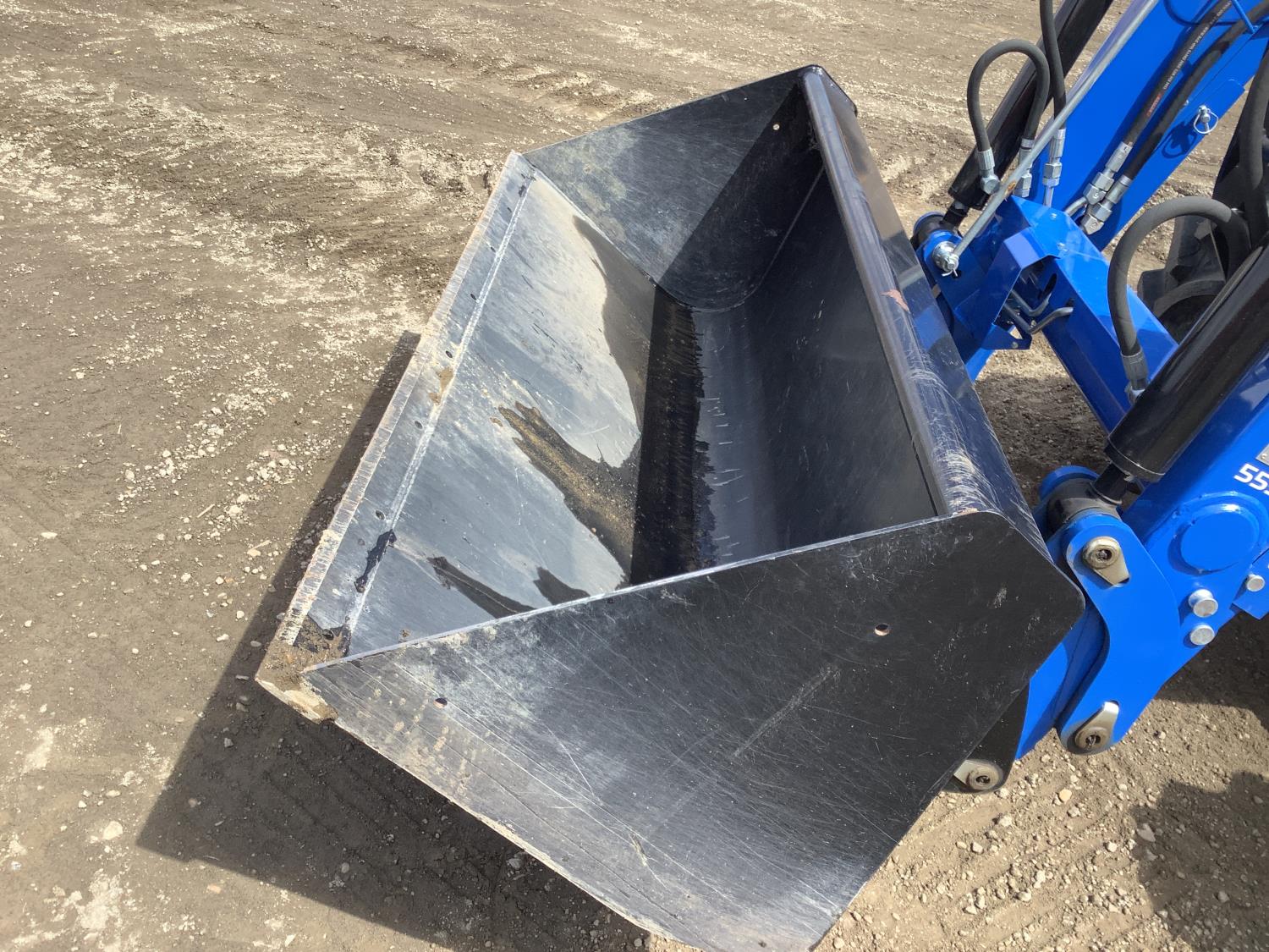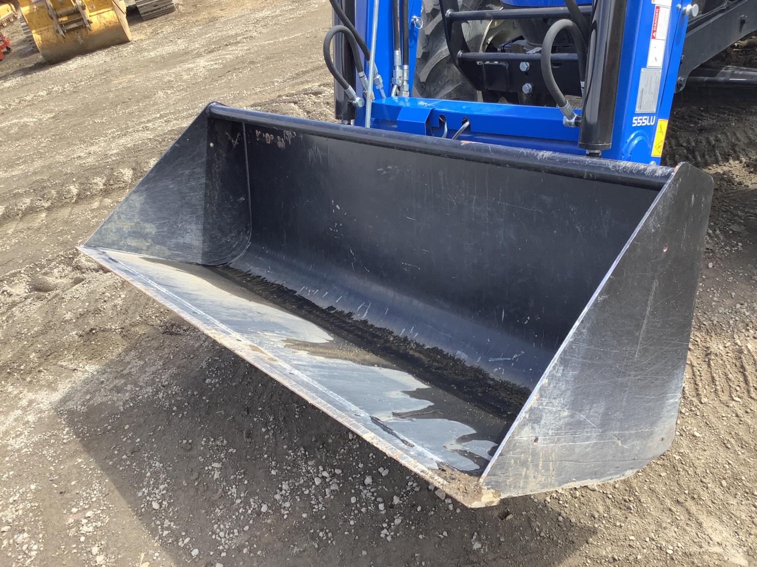 New Holland 555LU loader, Q/A, bucket, mid mount hydraulic connection, FPT 2.9 L 3 cylinder 74 HP, diesel engine, 60 PTO HP, cab, joystick, A/C, radio, buddy seat, 12 speed transmission with left hand power shuttle, sun roof, front grill guard, rear wheel weights, 280/85R24 front tires, 420/85R24 rear tires