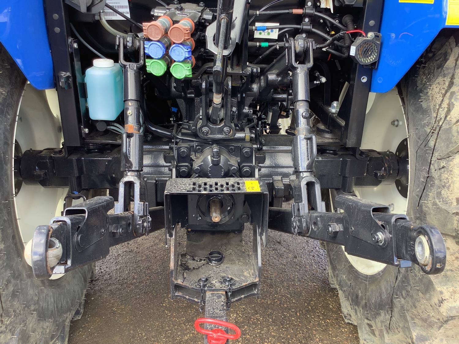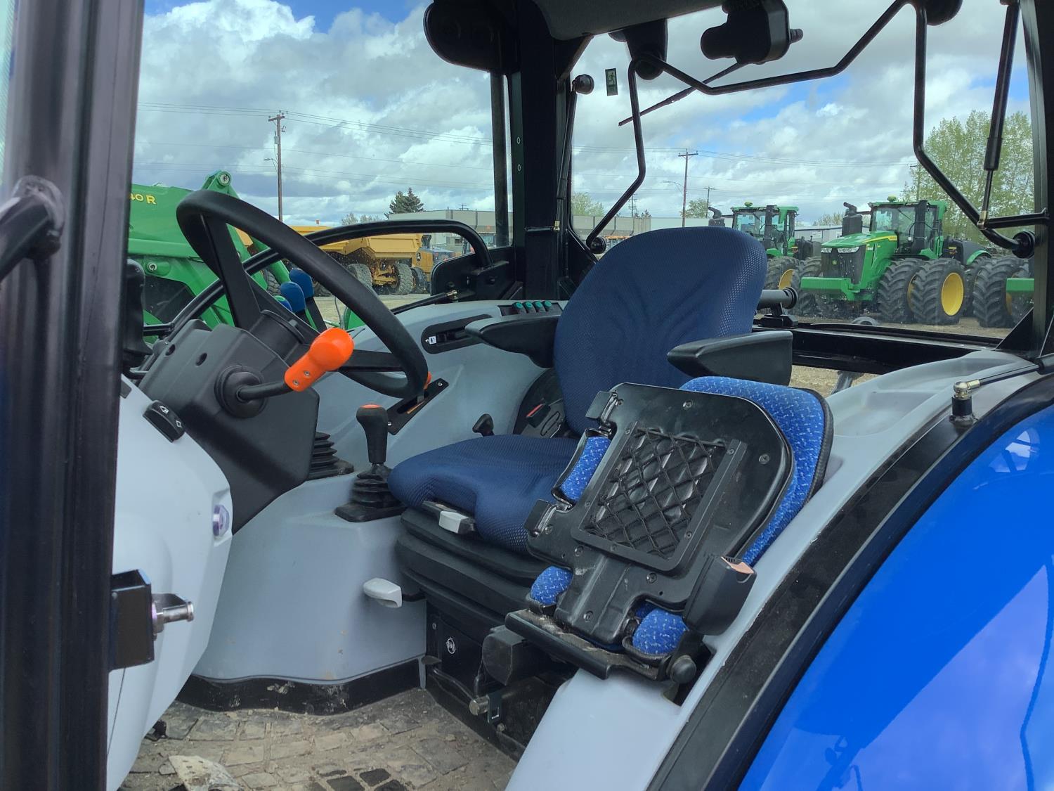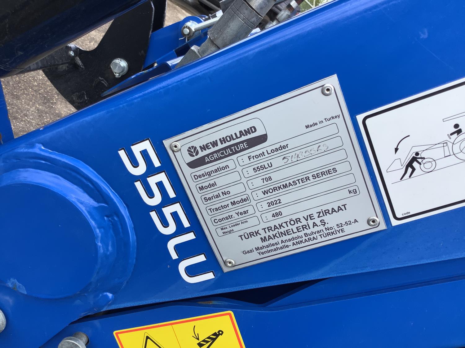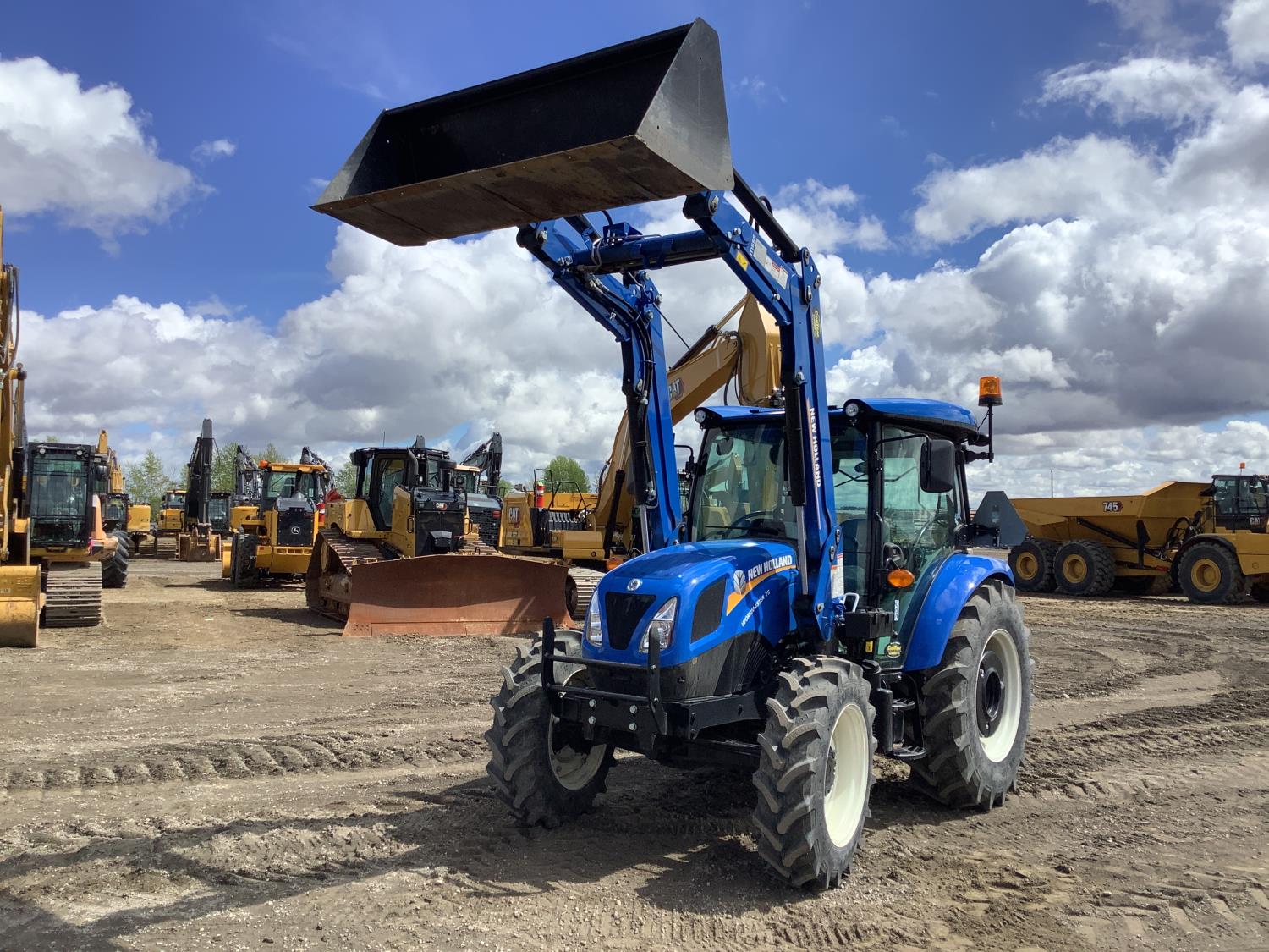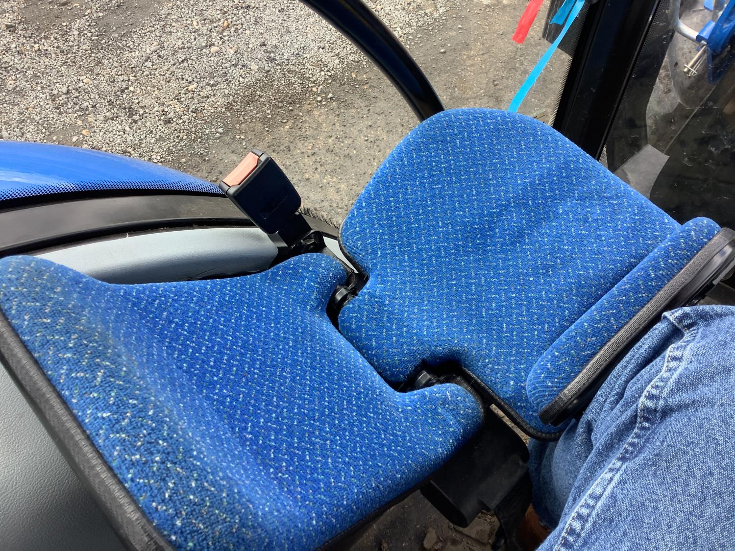 New Holland 555LU loader, Q/A, bucket, mid mount hydraulic connection, FPT 2.9 L 3 cylinder 74 HP, diesel engine, 60 PTO HP, cab, joystick, A/C, radio, buddy seat, 12 speed transmission with left hand power shuttle, sun roof, front grill guard, rear wheel weights, 280/85R24 front tires, 420/85R24 rear tires