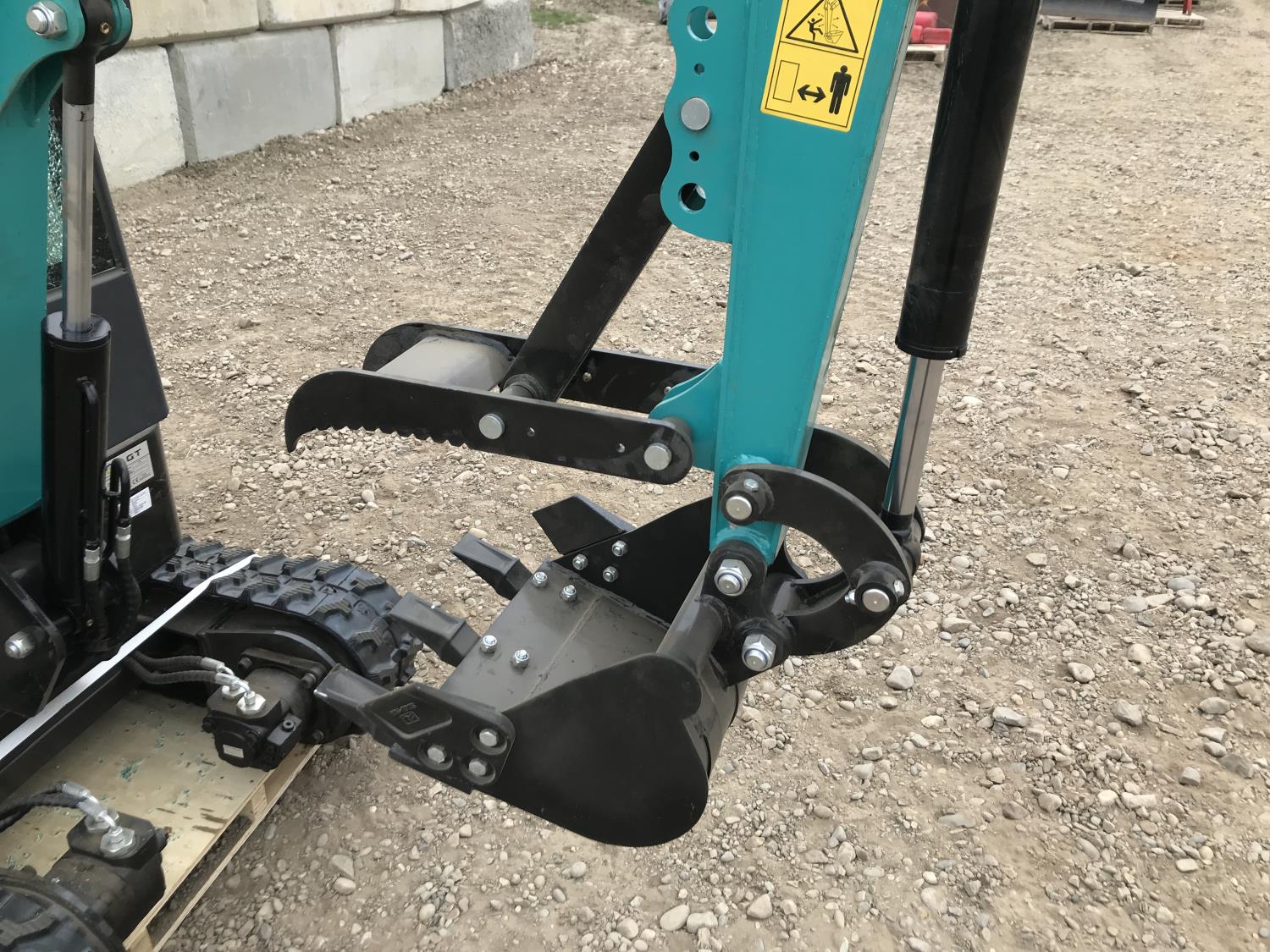 Enclosed cab, gas engine, 16 inch dig bucket, manual coupler, manual thumb, 28 inch stick, backfill blade, 7 inch rubber tracks