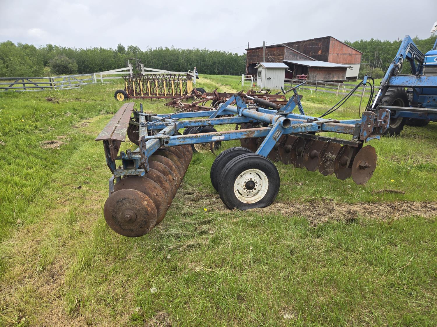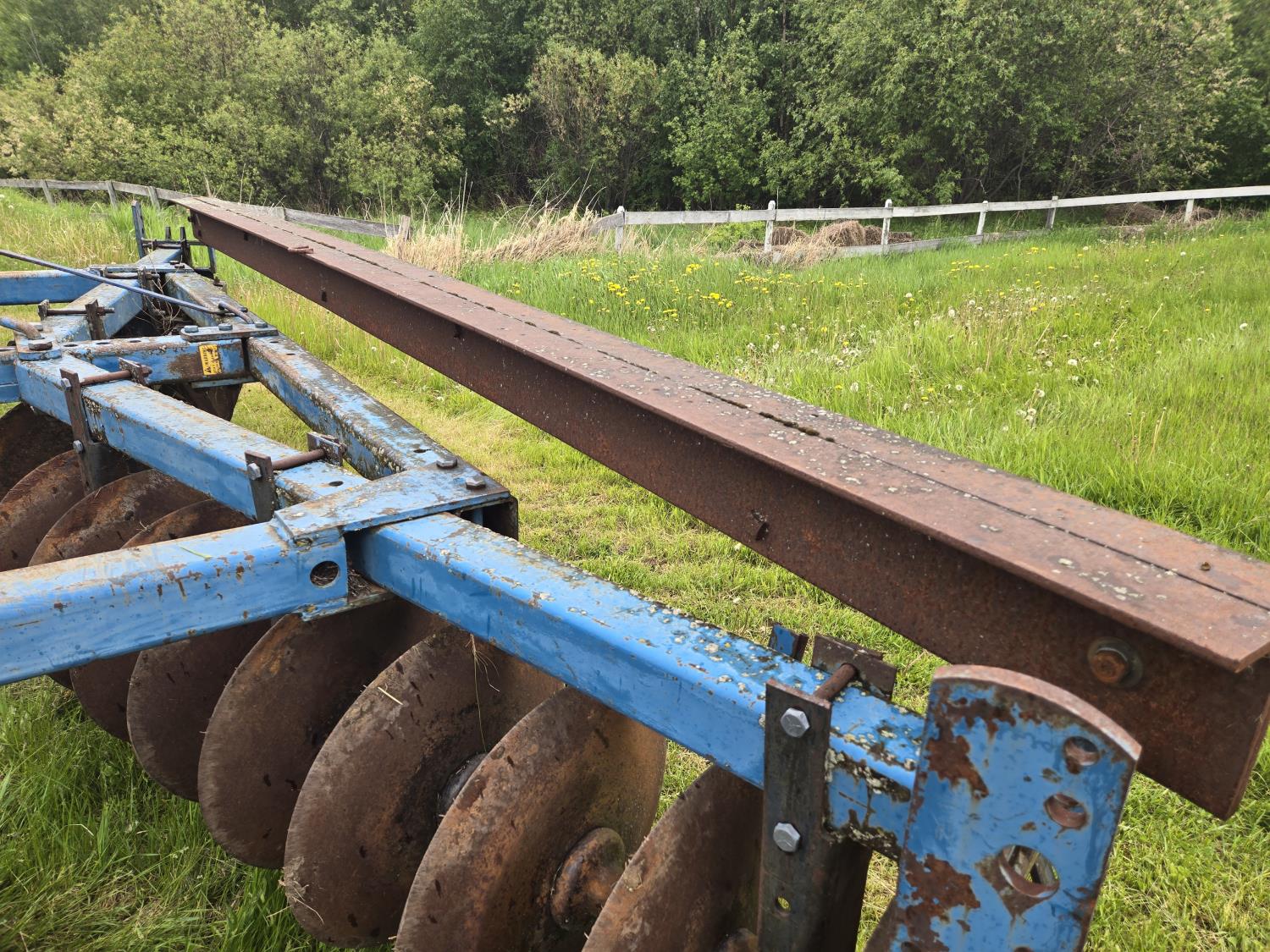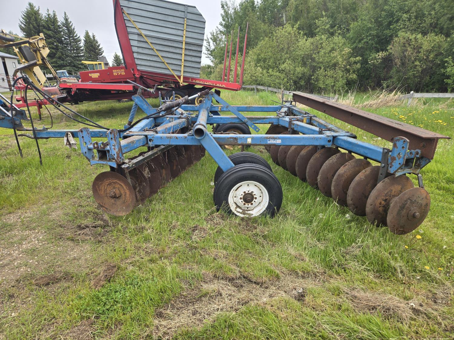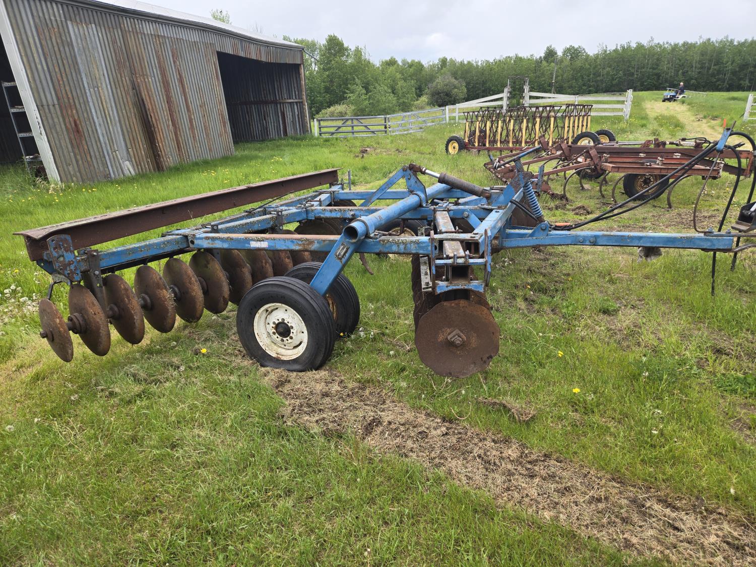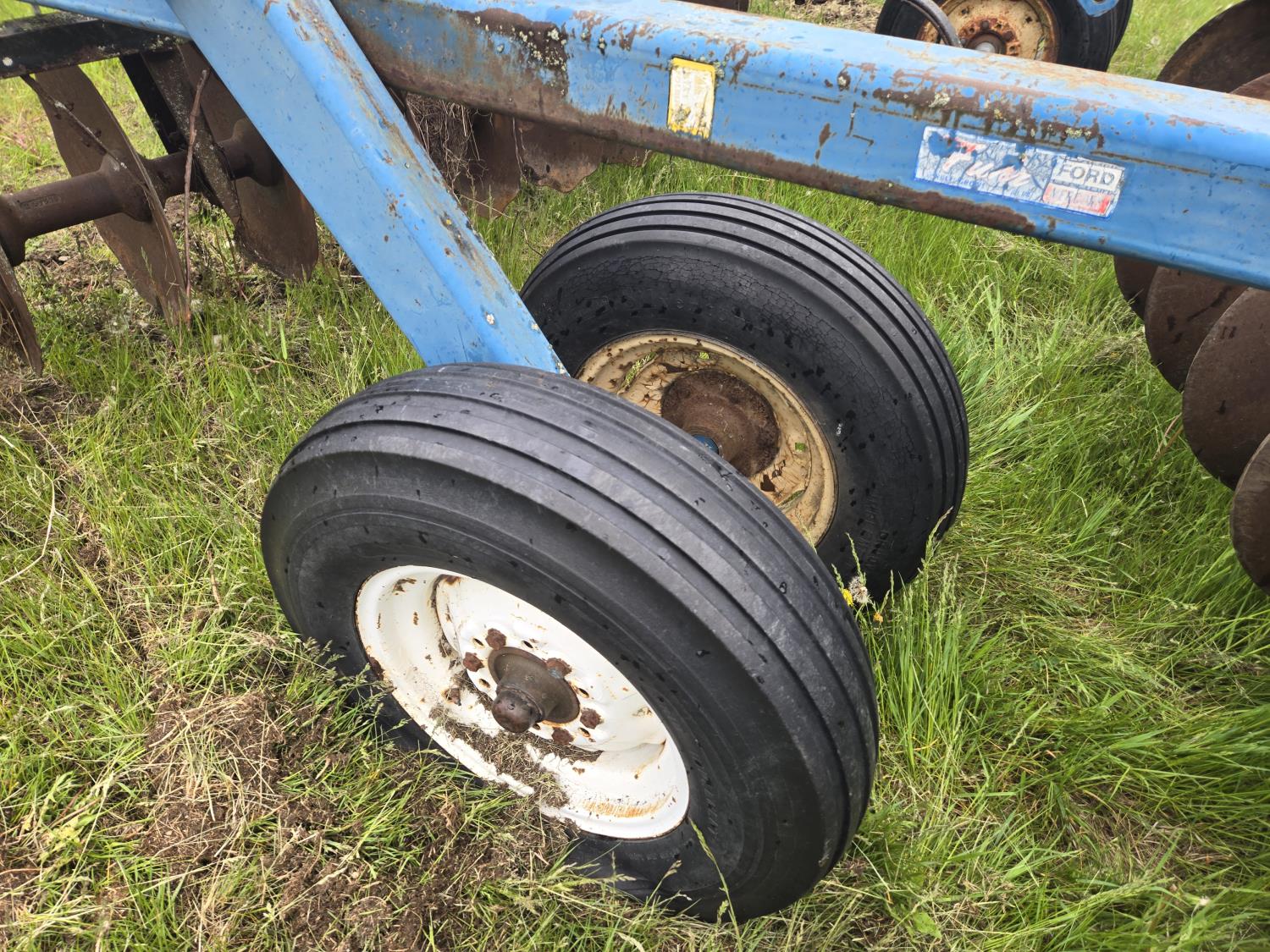 front: 9 inch spacing notched 18 inch discs, rear: 9 inch spacing smooth 20 inch discs, hitch leveling, scrapers, duals main frame, adjustable gang angle, hydraulic lift cylinder, 7.60-15 main frame tires