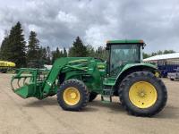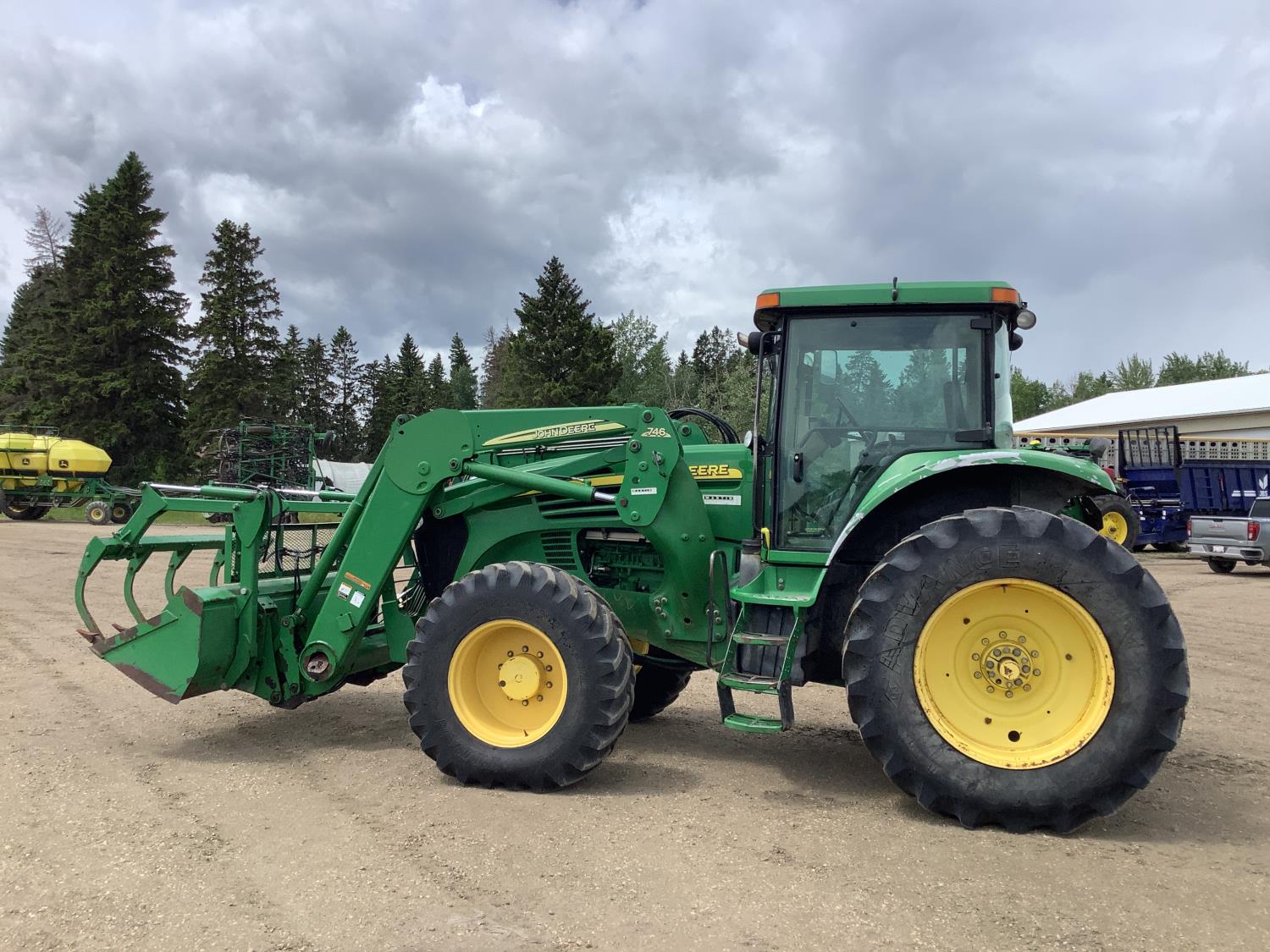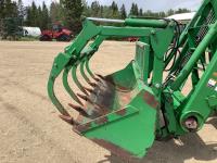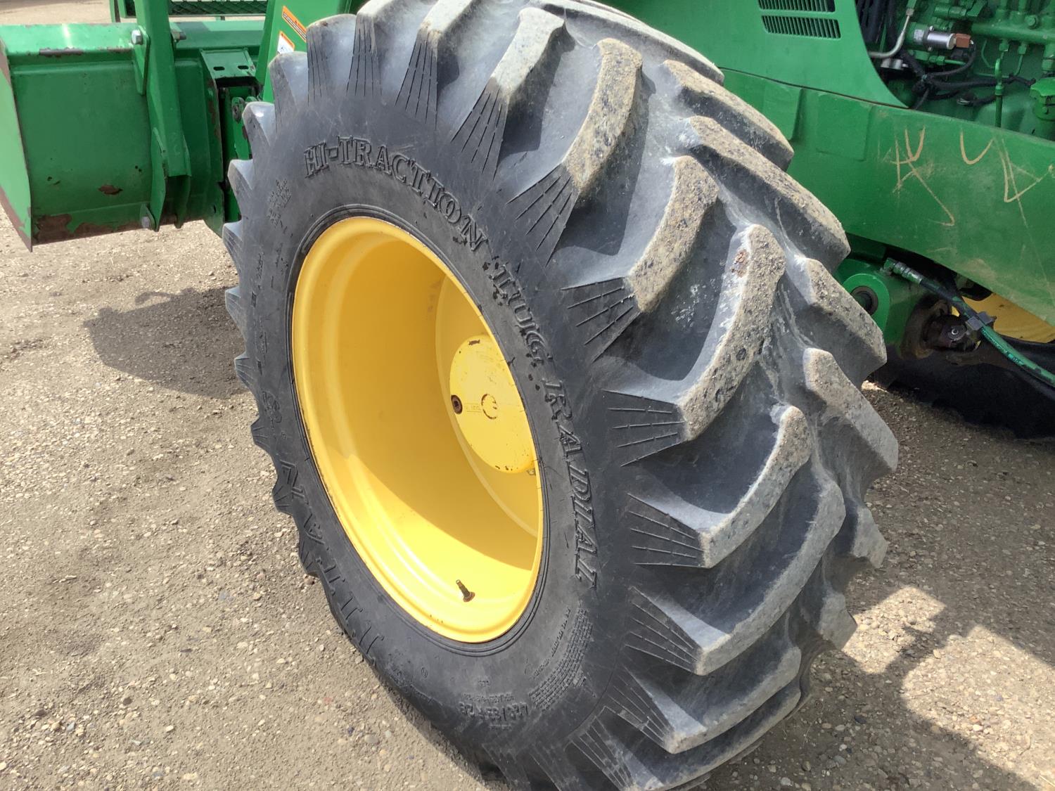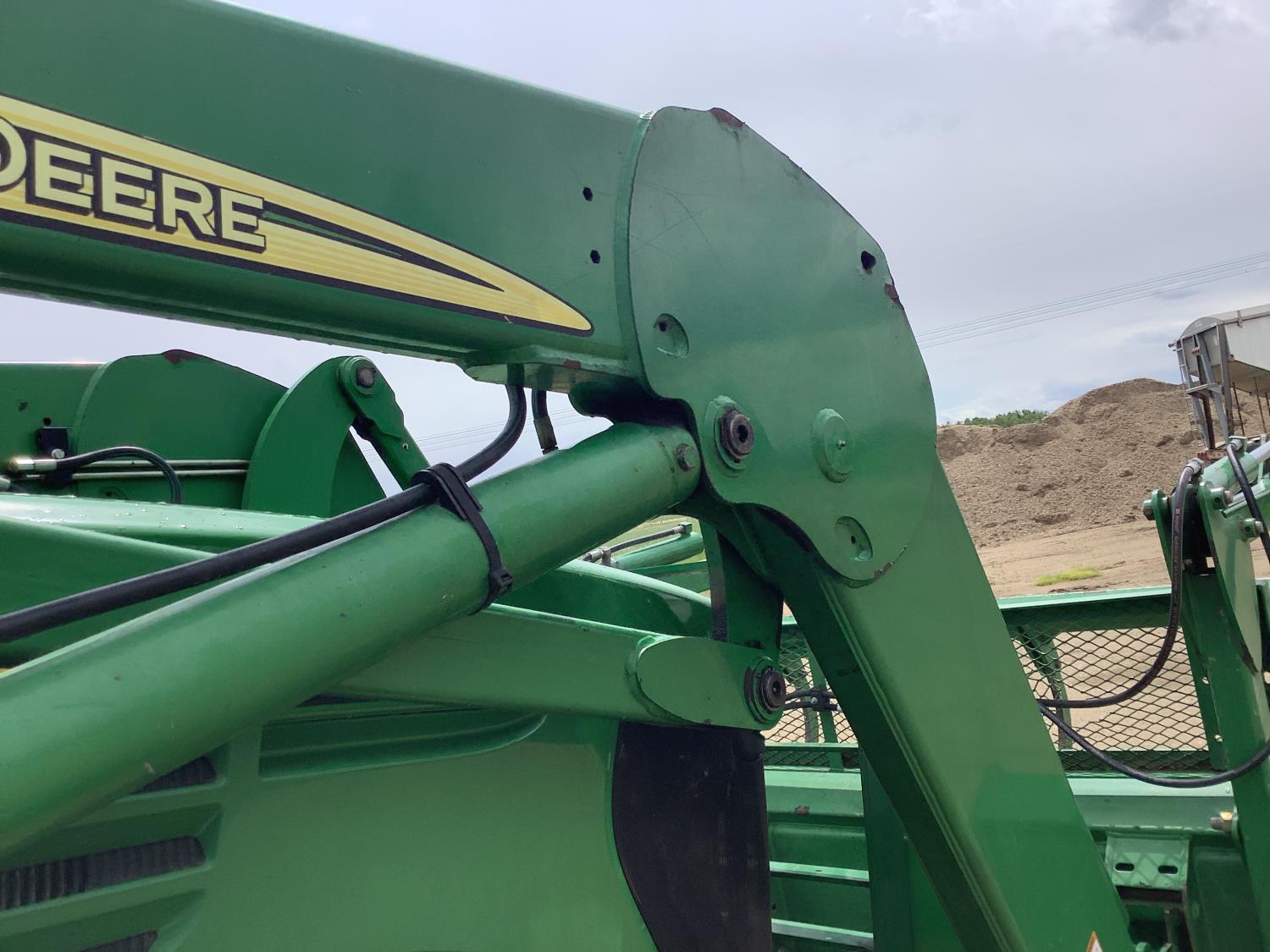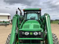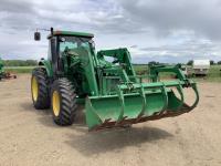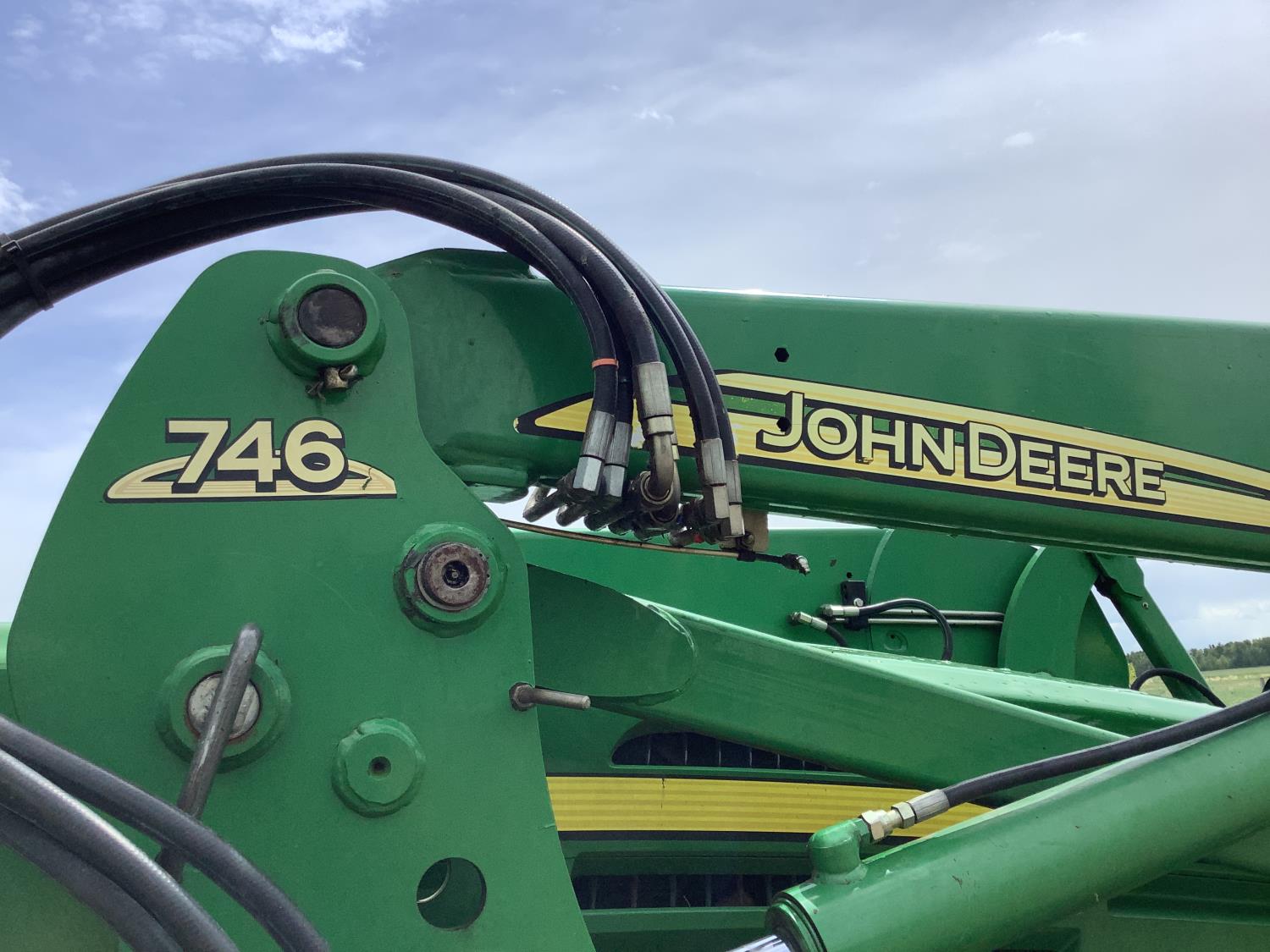 John Deere 746 loader, Q/A, bucket, bale forks, mid mount hydraulic connection, John Deere 6.8 L 6 cylinder 167 HP, engine, 140 PTO HP, 16 speed PowrQuad partial power shift transmission, joystick, A/C, radio, 540/1000 PTO, 3 rear hydraulic outlets, 420/65R28 front tires, 520/85R38 rear tires, 4 prong bale forks, pallet forks