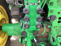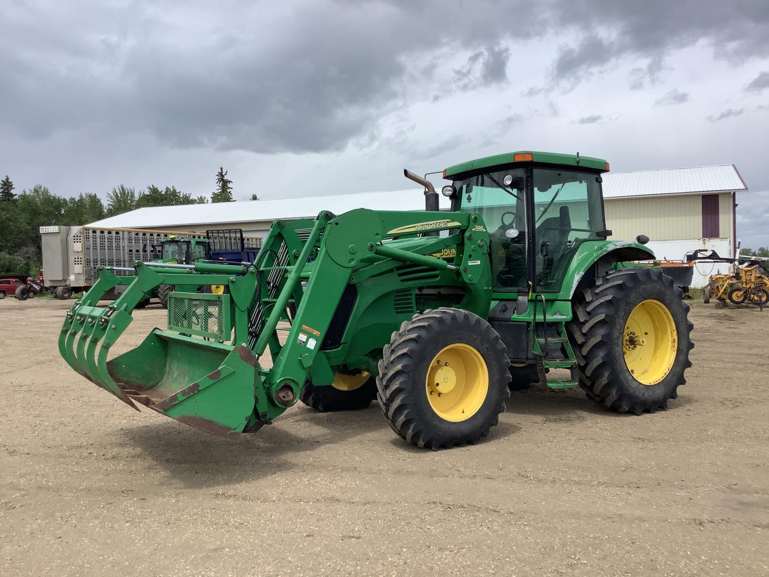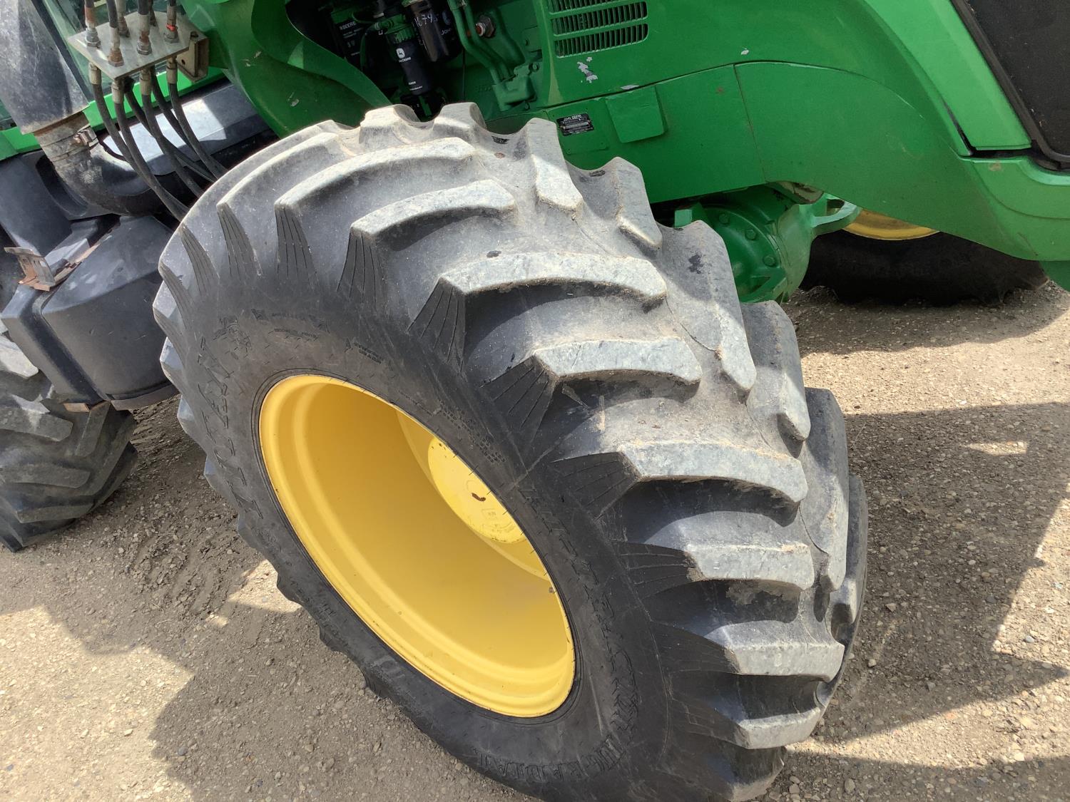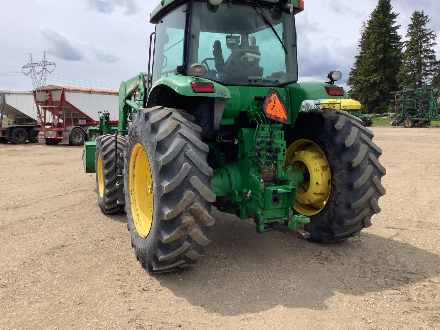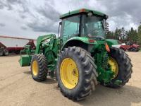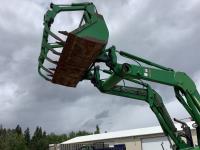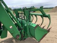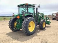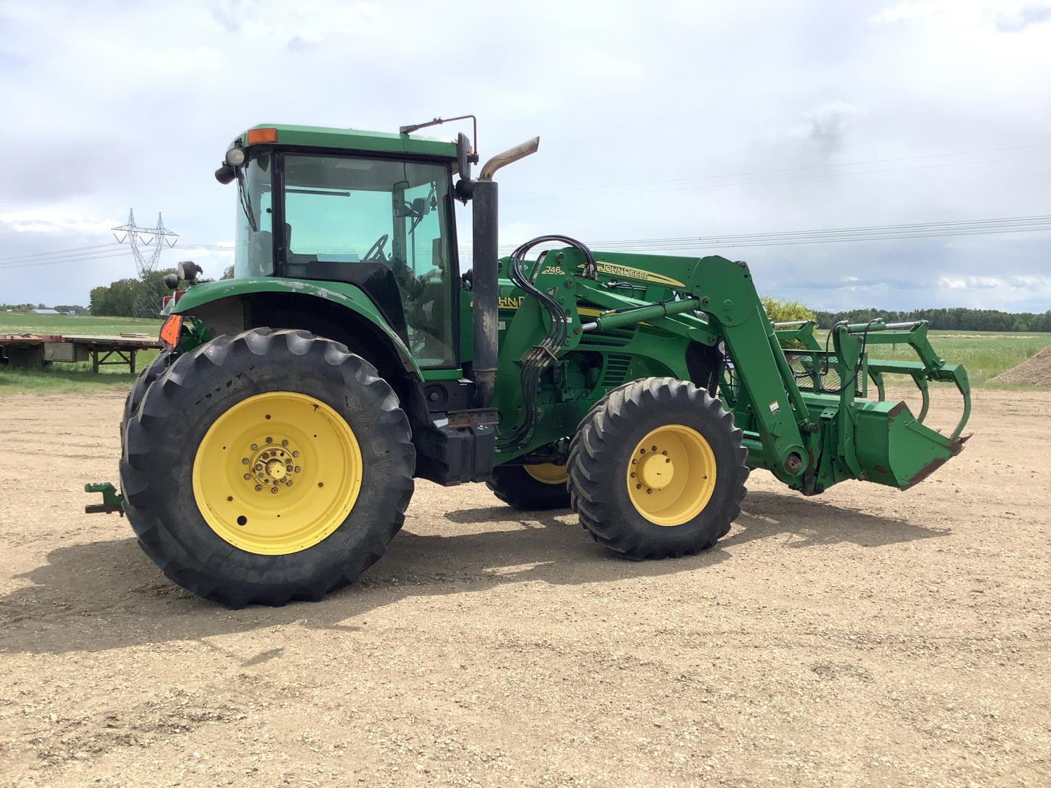 John Deere 746 loader, Q/A, bucket, bale forks, mid mount hydraulic connection, John Deere 6.8 L 6 cylinder 167 HP, engine, 140 PTO HP, 16 speed PowrQuad partial power shift transmission, joystick, A/C, radio, 540/1000 PTO, 3 rear hydraulic outlets, 420/65R28 front tires, 520/85R38 rear tires, 4 prong bale forks, pallet forks