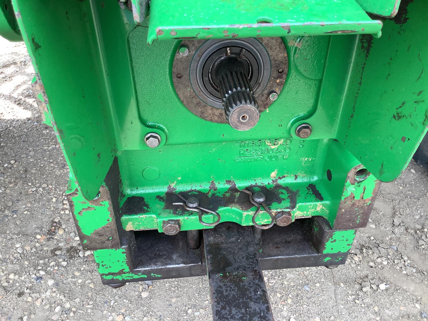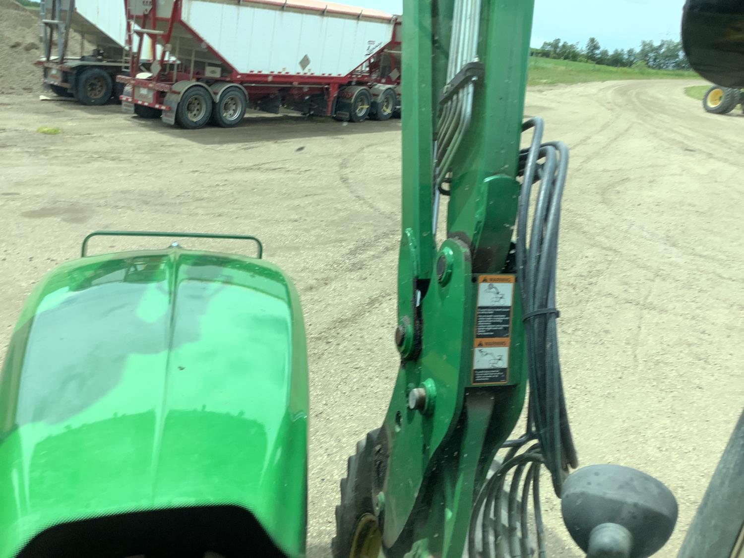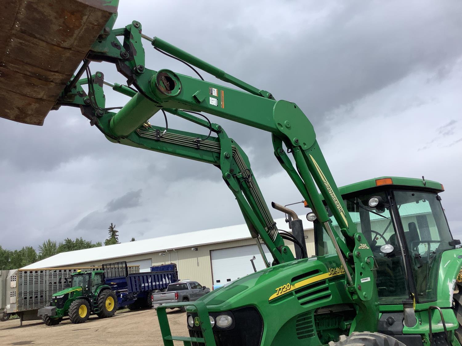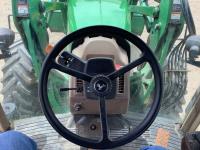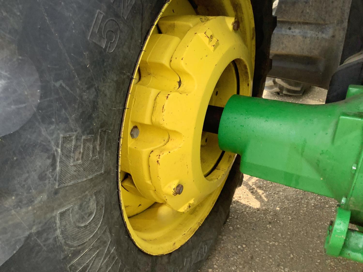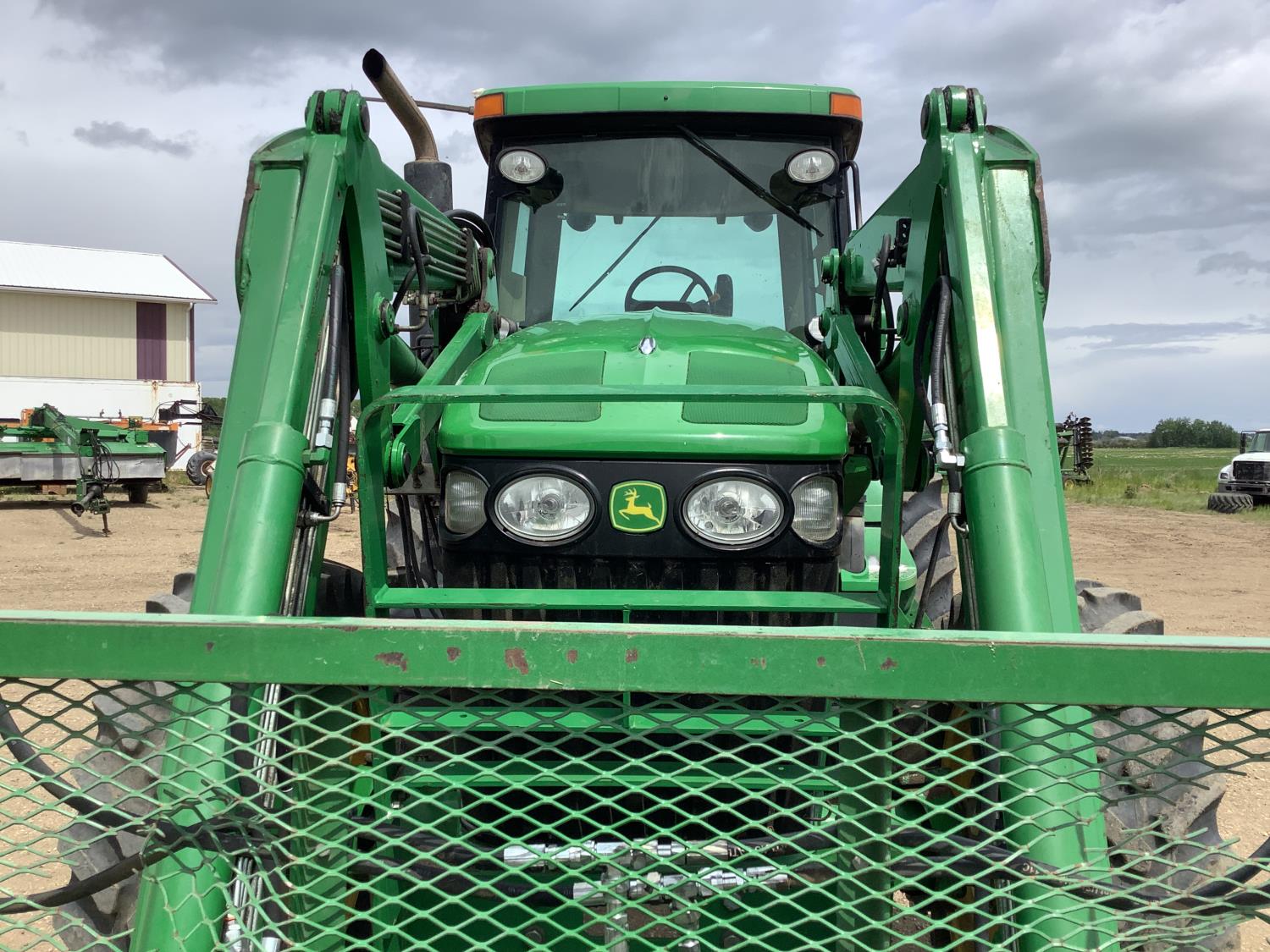John Deere 746 loader, Q/A, bucket, bale forks, mid mount hydraulic connection, John Deere 6.8 L 6 cylinder 167 HP, engine, 140 PTO HP, 16 speed PowrQuad partial power shift transmission, joystick, A/C, radio, 540/1000 PTO, 3 rear hydraulic outlets, 420/65R28 front tires, 520/85R38 rear tires, 4 prong bale forks, pallet forks
