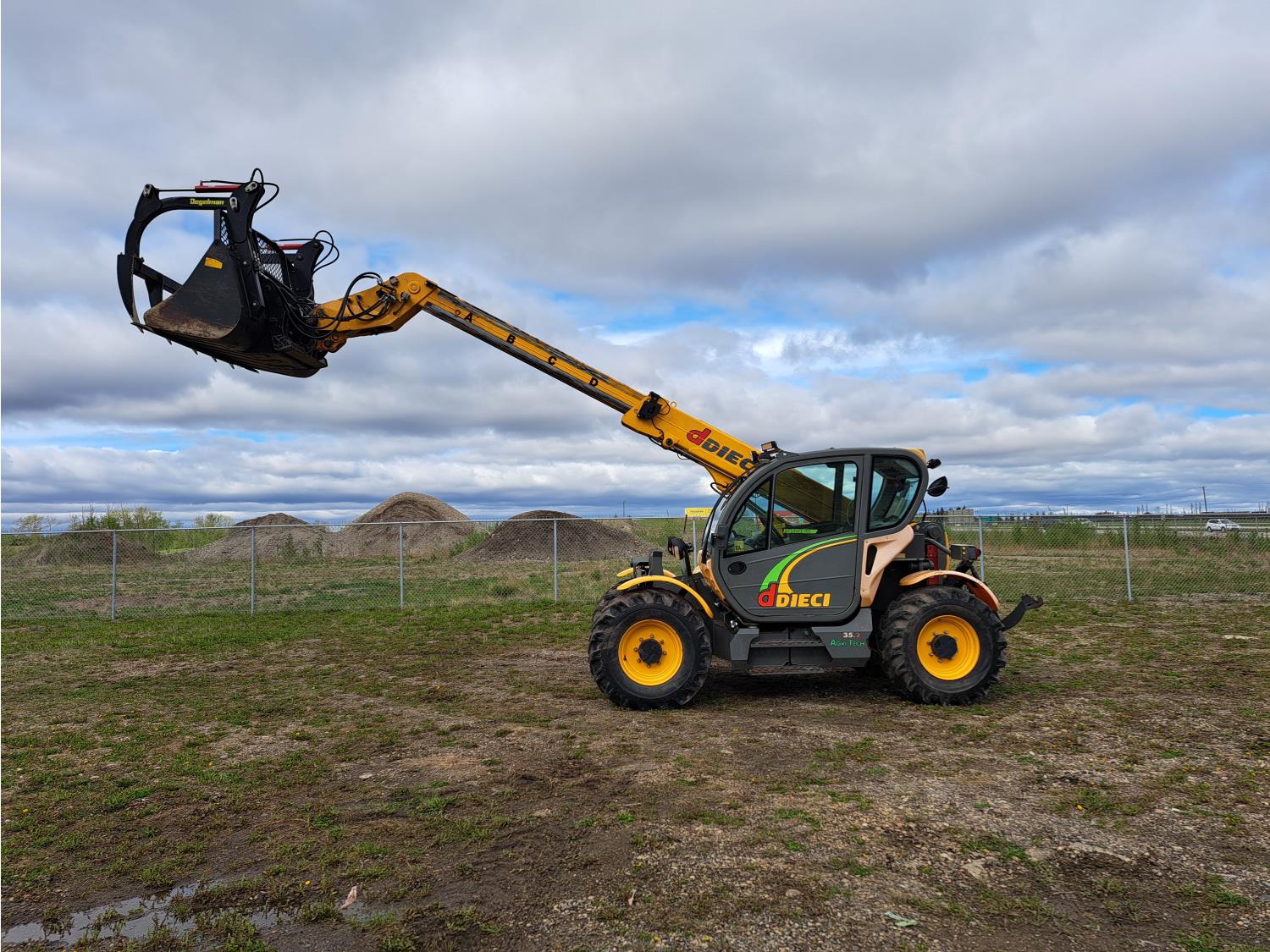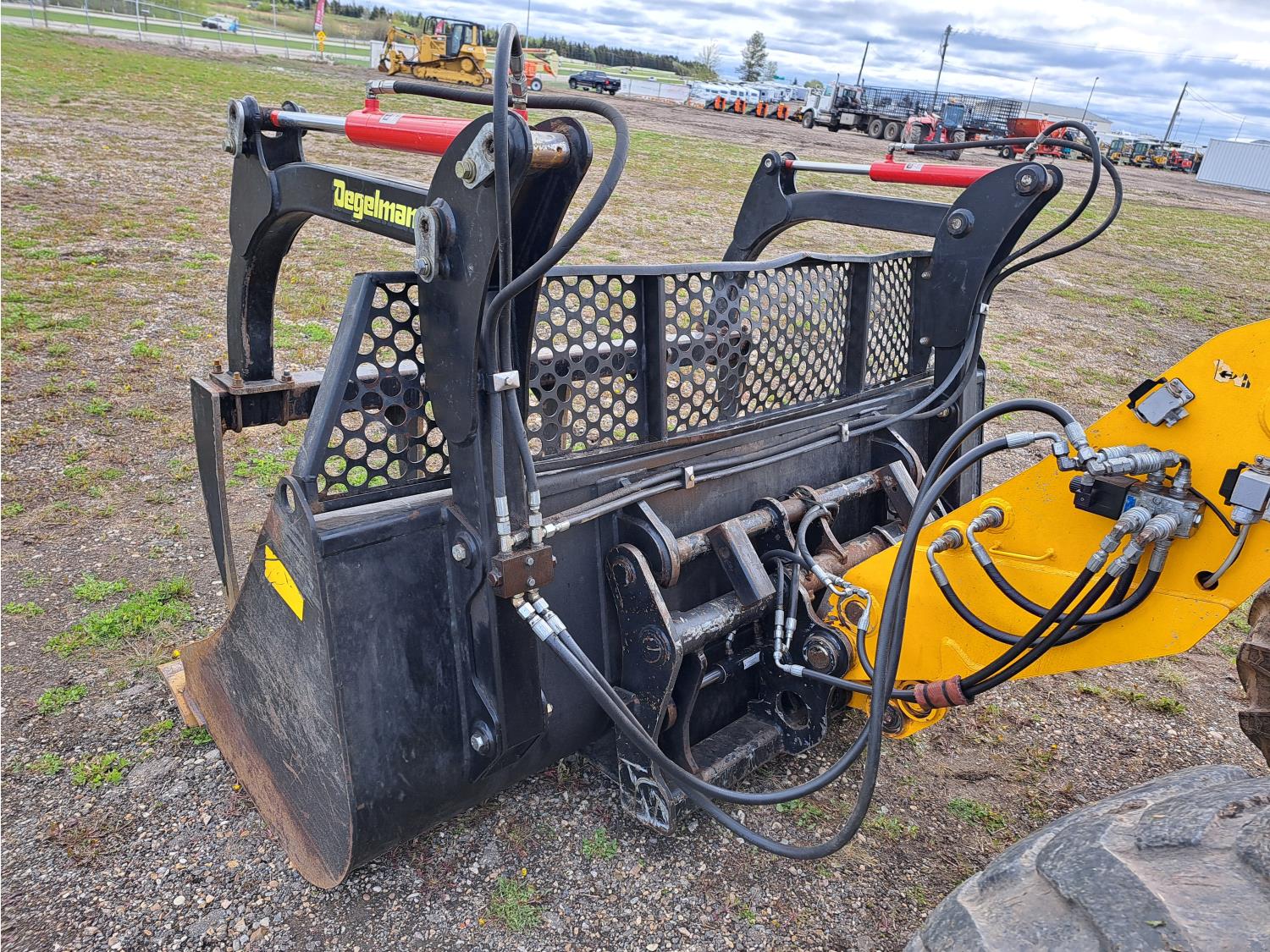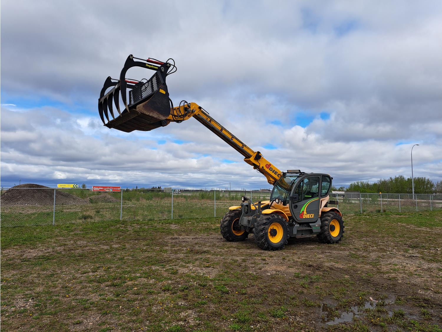 141 horsepower FPT (Fiat Power Train) diesel engine, 1000 PTO with rear remote controls, 3 point hitch, 445/65R22.5 MPT steel belted radial tires, Degelman 8FT smooth bucket with 5 claw grapple, 2 rear aux hydraulics