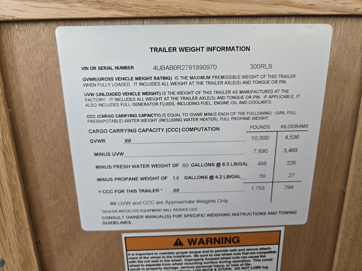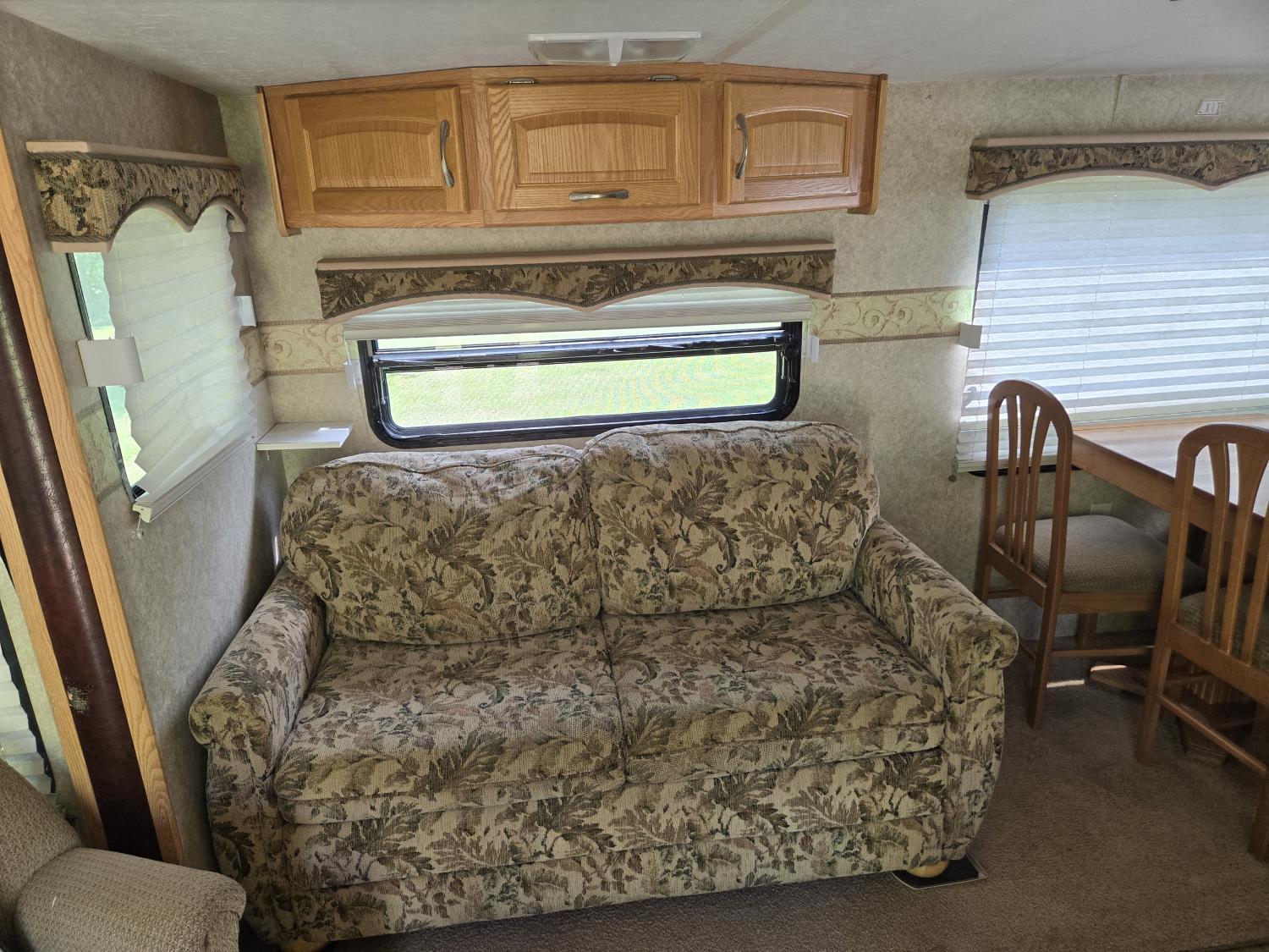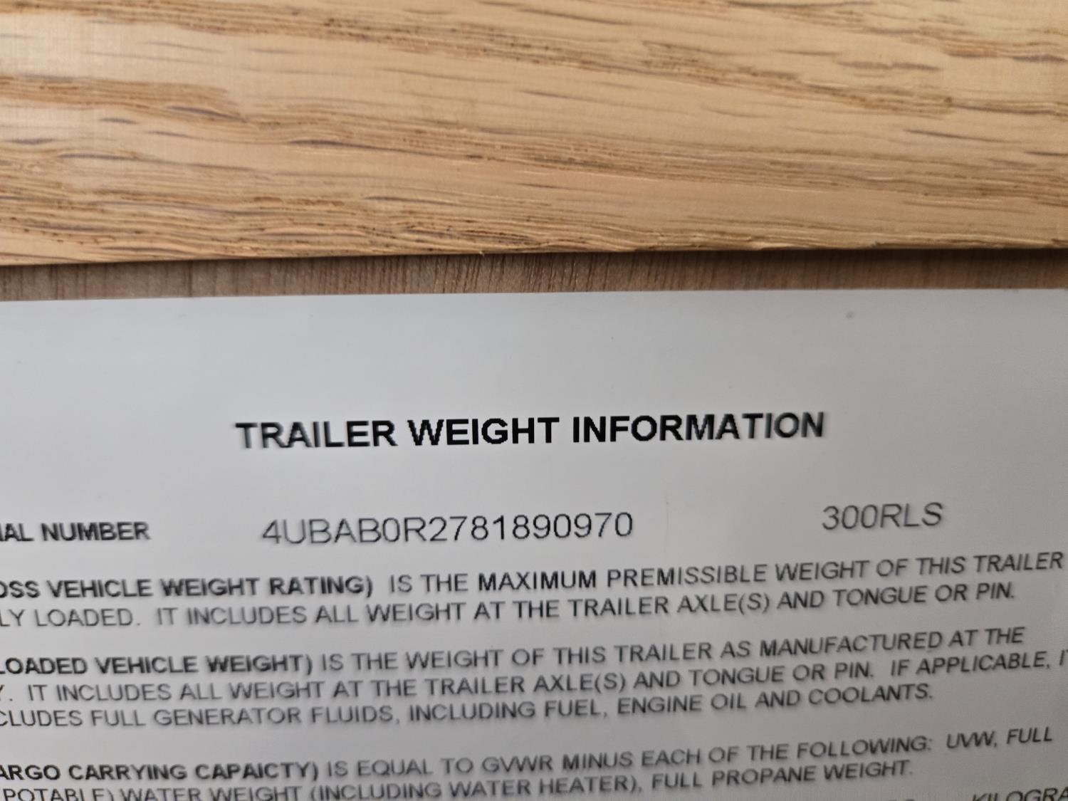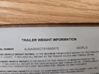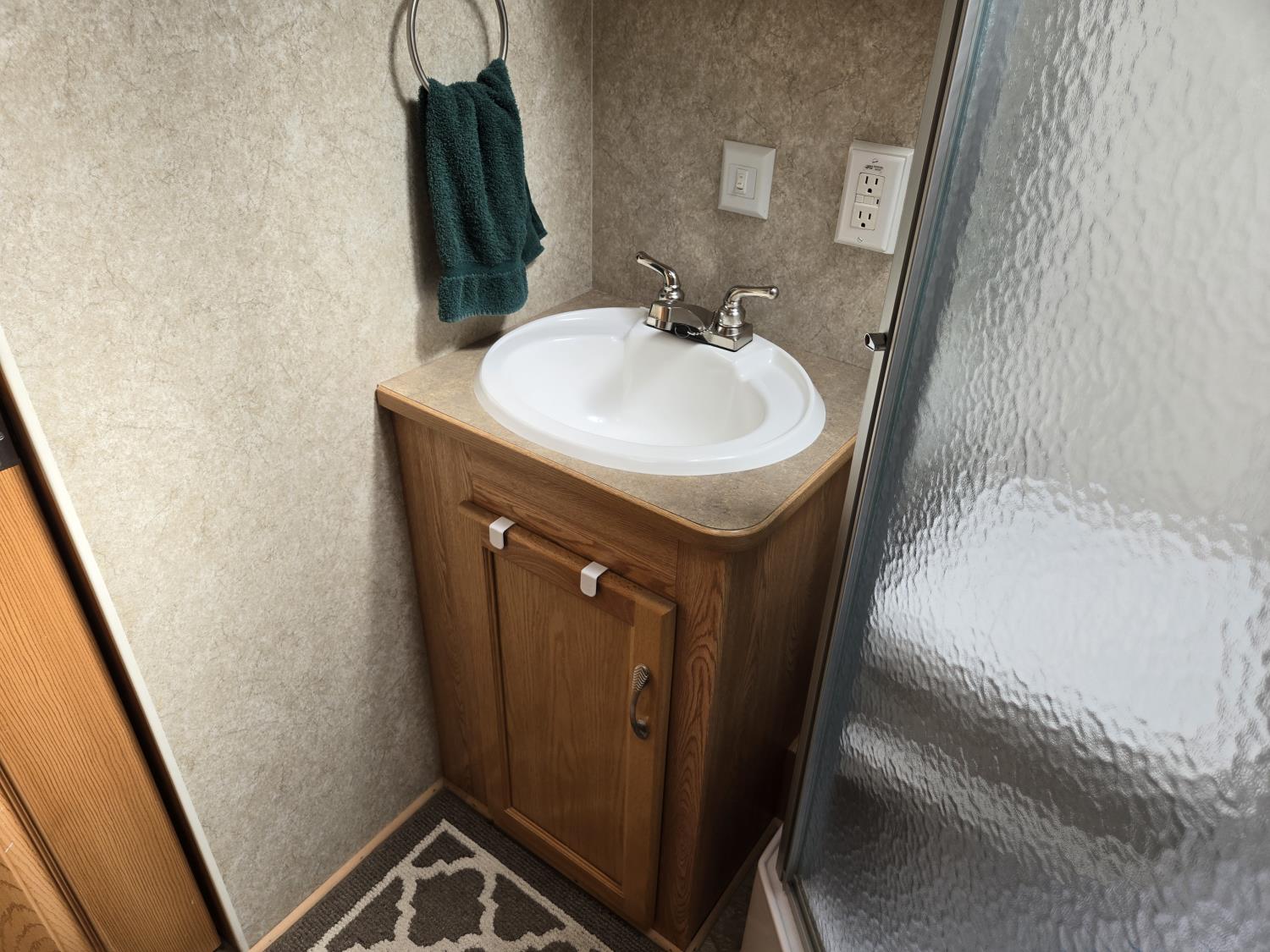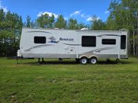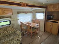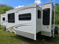 Sleeps 4, stove, fridge, microwave, full bath, master bedroom, A/C, 1 slide, power awning, spring suspension, electric brakes, aluminum structure with hard wall fiberglass exterior, dry weight of trailer 7690 lbs, complete equalizer hitch, 22/75R15 tires