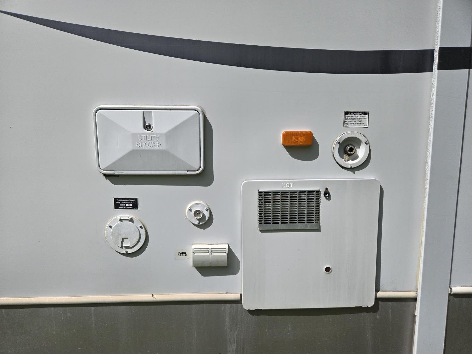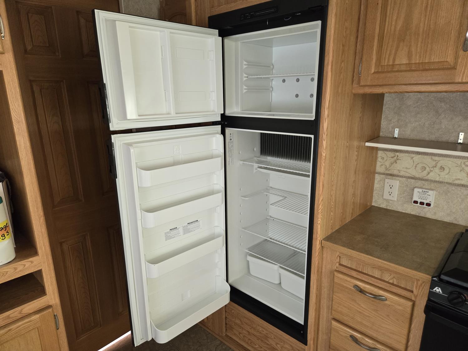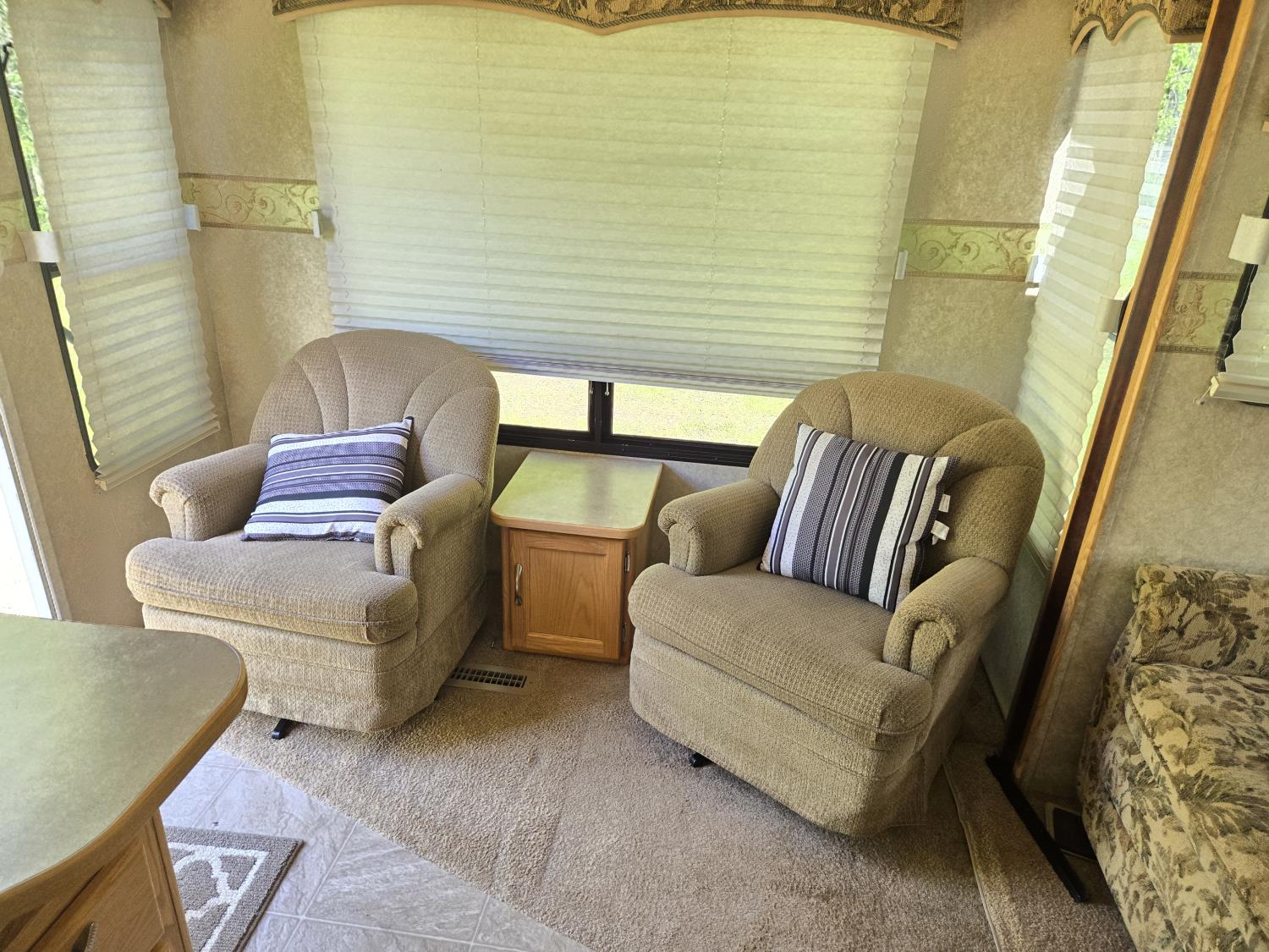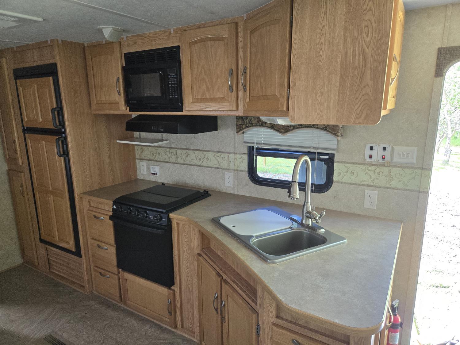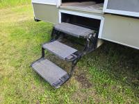 Sleeps 4, stove, fridge, microwave, full bath, master bedroom, A/C, 1 slide, power awning, spring suspension, electric brakes, aluminum structure with hard wall fiberglass exterior, dry weight of trailer 7690 lbs, complete equalizer hitch, 22/75R15 tires