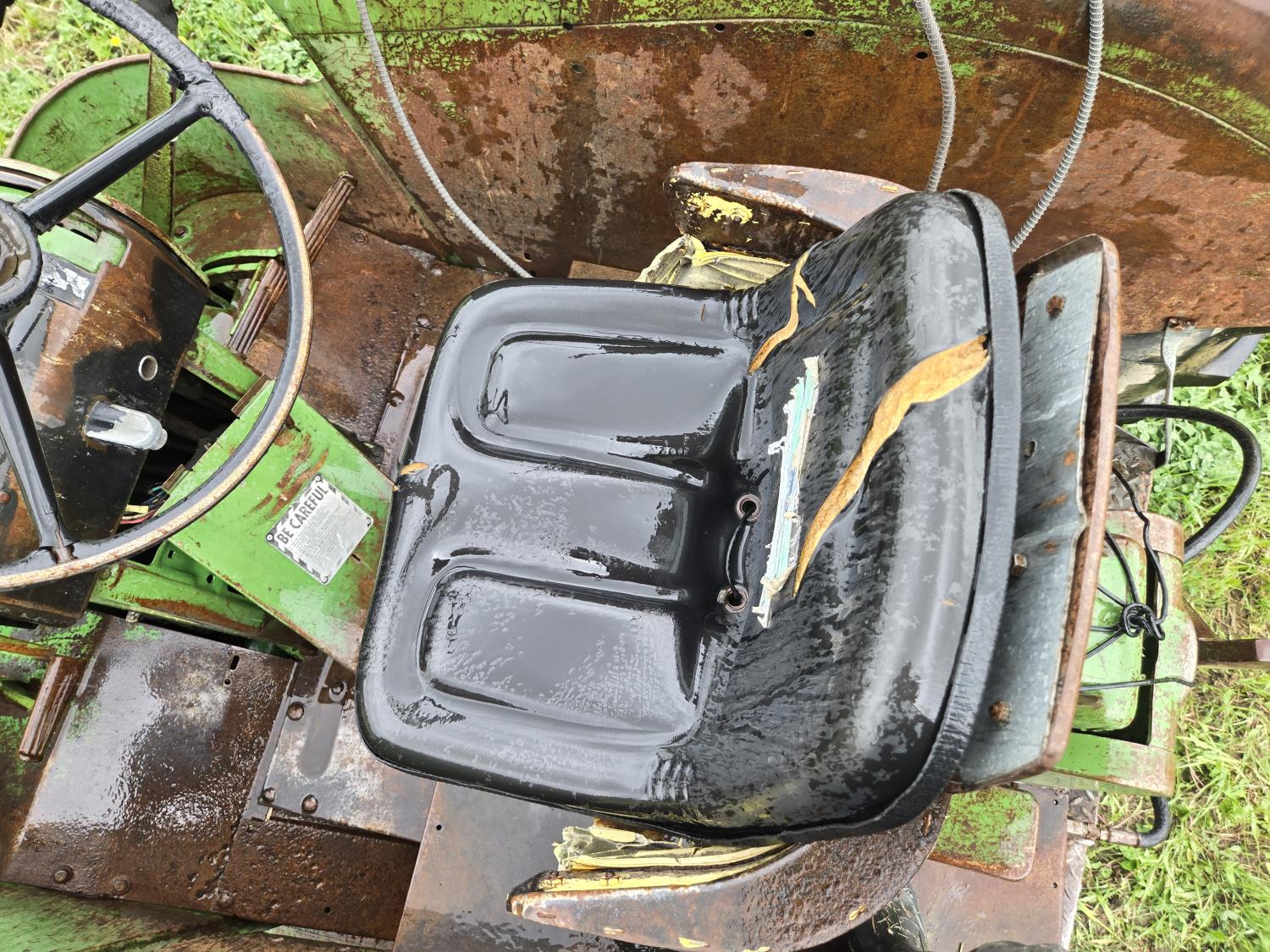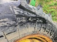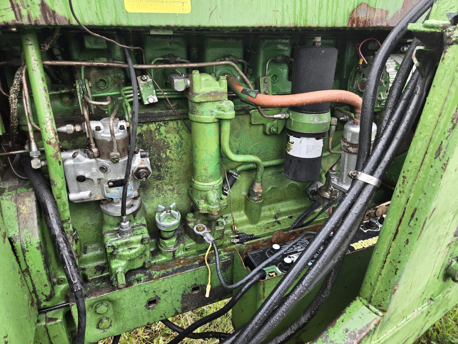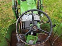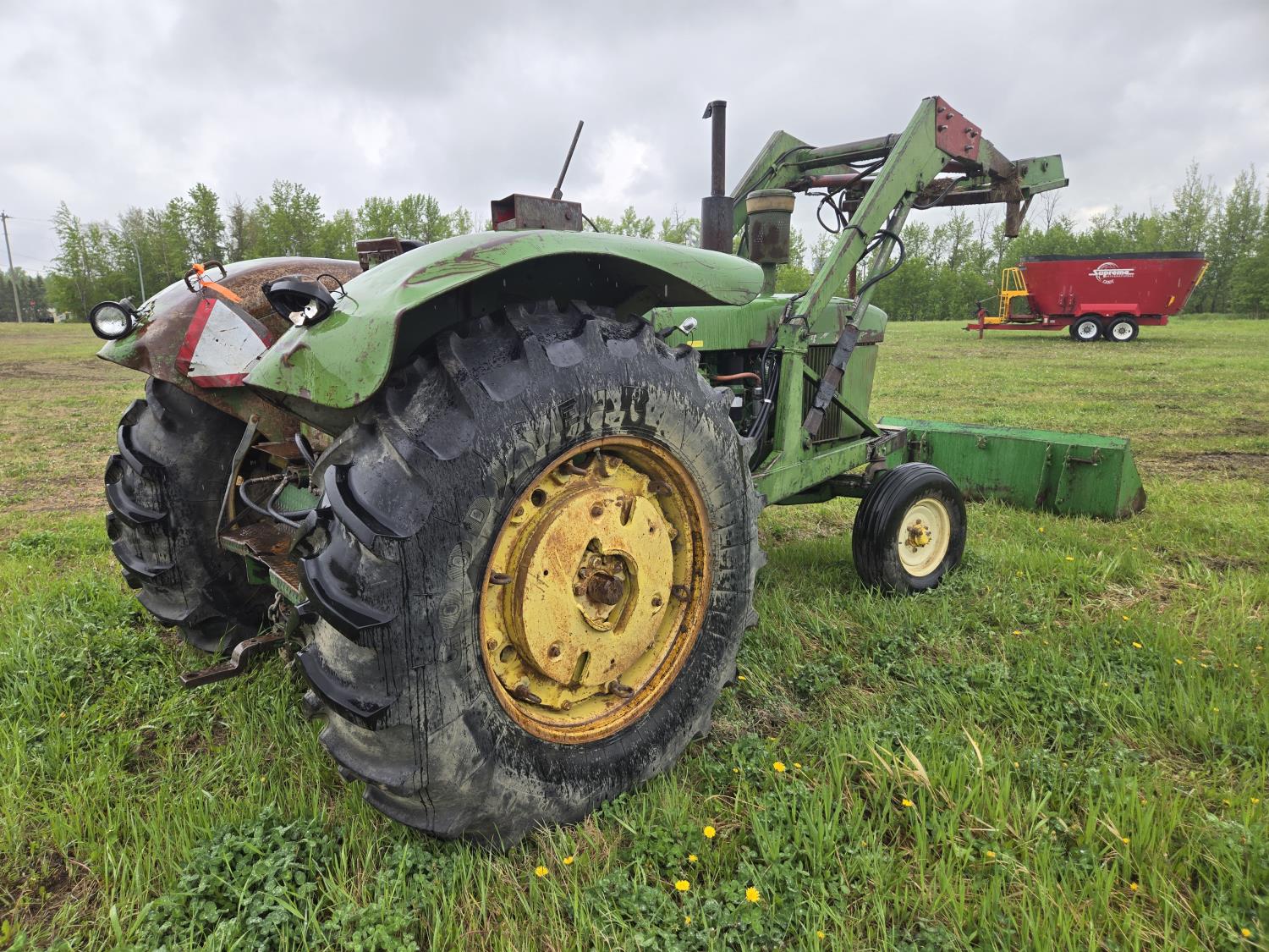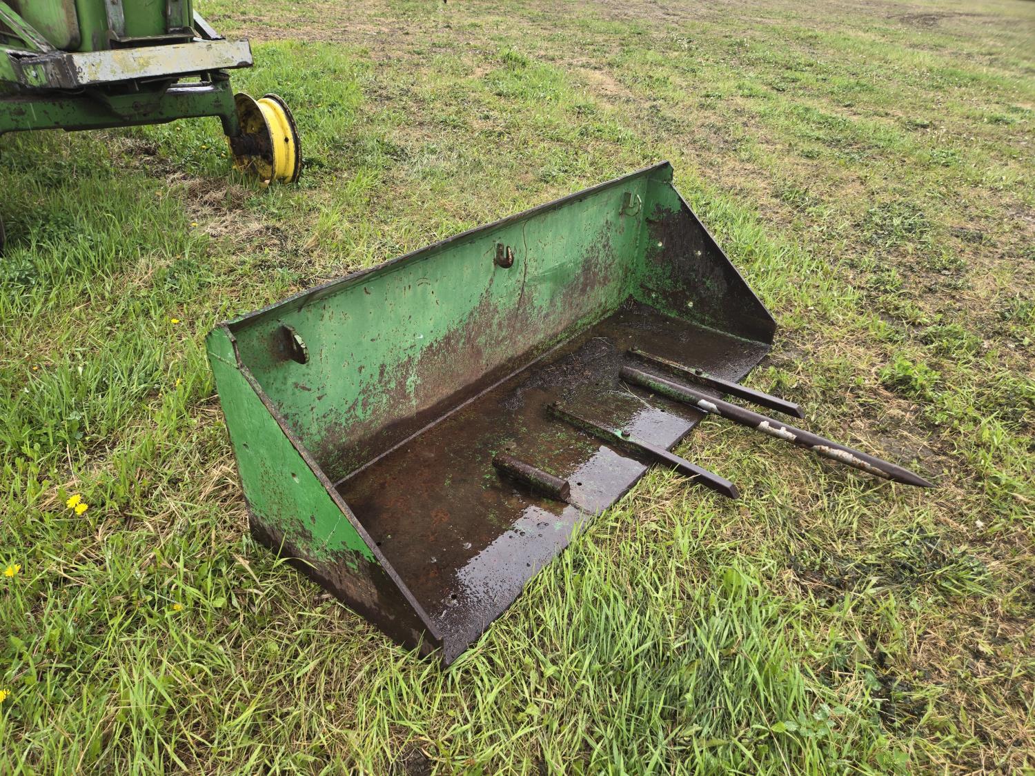 John Deere loader, 72 inch bucket, bale forks, John Deere 6.6 L 6 cylinder diesel engine, 95 PTO HP, 8 speed partial synchro transmission, open station platform, 540/1000 PTO, 2 rear hydraulic outlets, 18.4-30 rear tires
