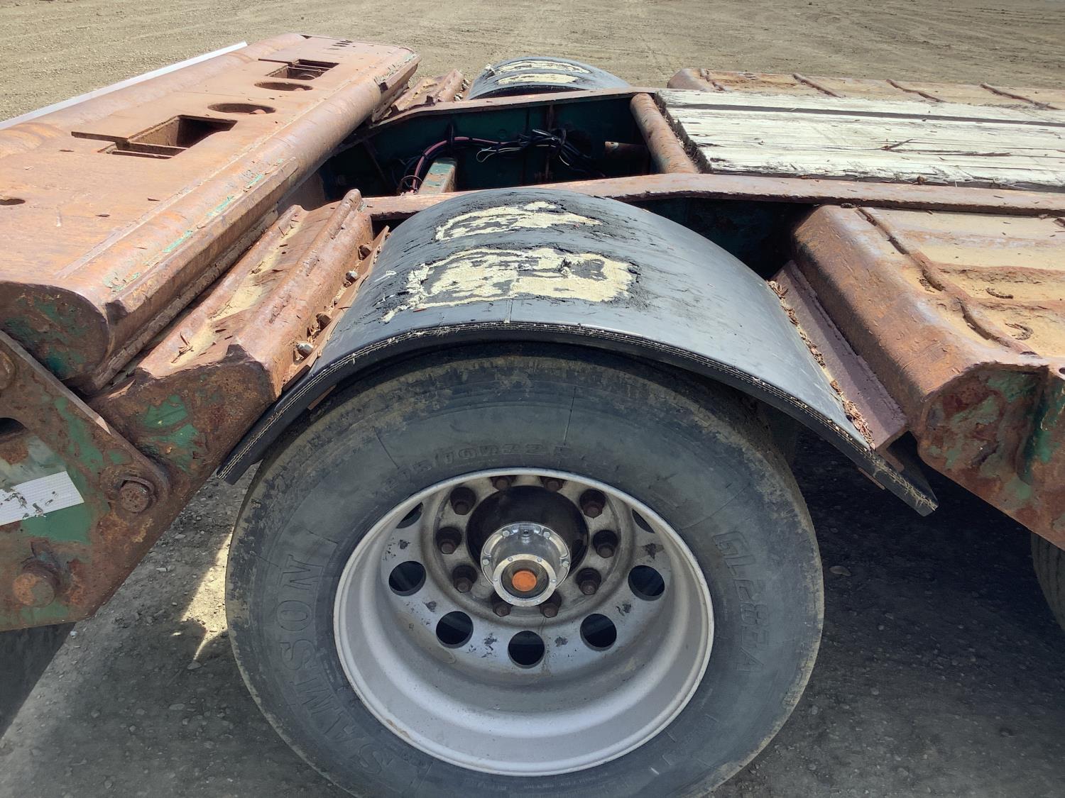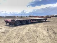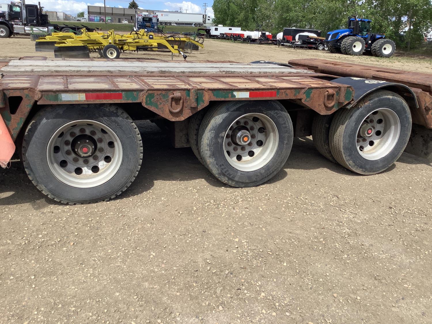 10 ft wide, tapered front neck, 2 position king pin, center live roll, rear live roll with flip over beavertail, air ride suspension, 3 bar winch's, pin pockets, swing out wide load lights, load bearing front 2 axles