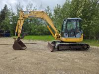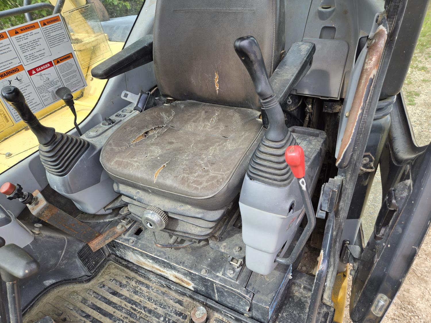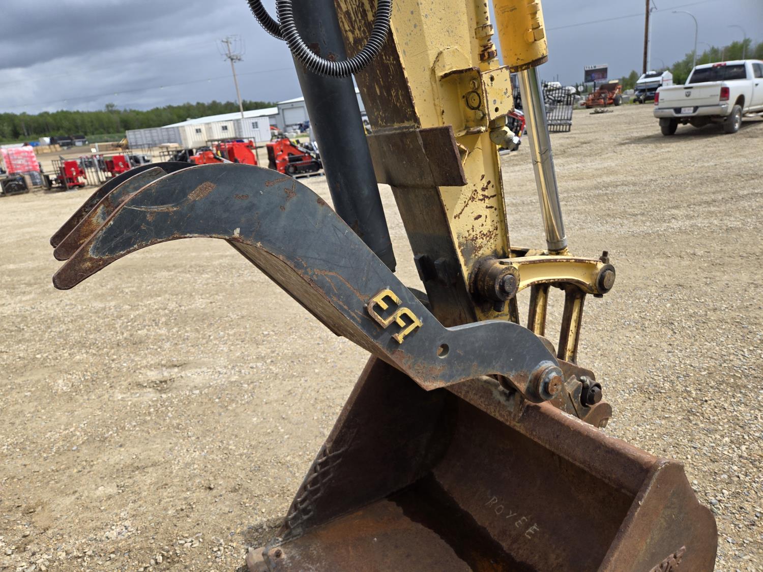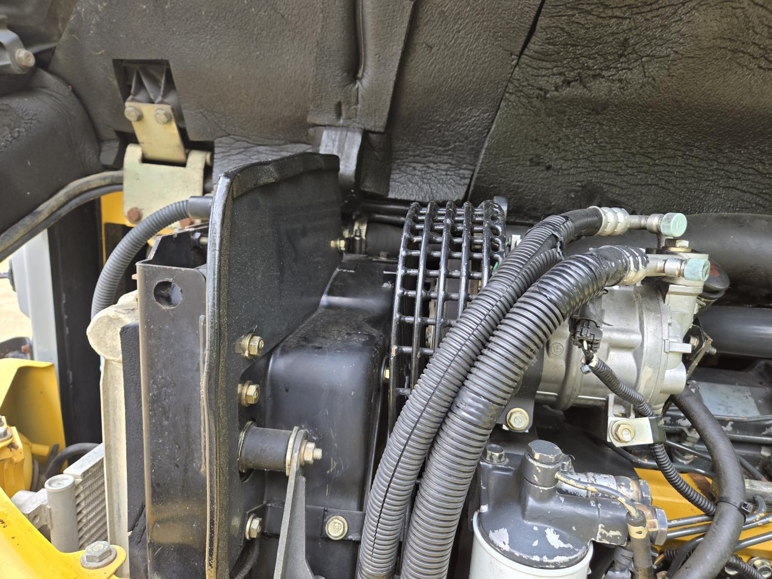 Enclosed cab, A/C, 42 inch cleanup bucket, manual coupler, hydraulic thumb, 1 auxiliary hydraulics, 89 inch stick, backfill blade, 18 inch track pads
