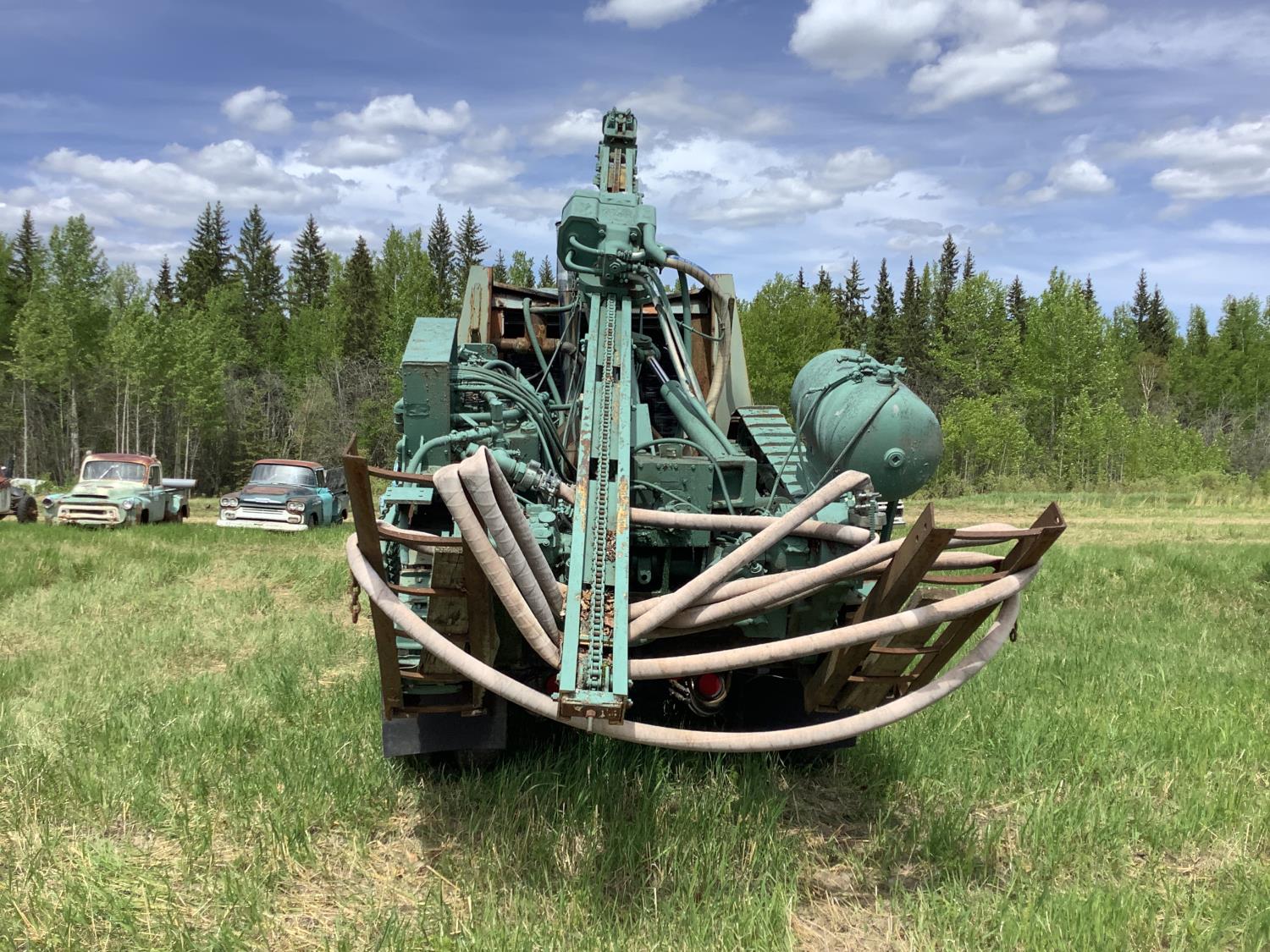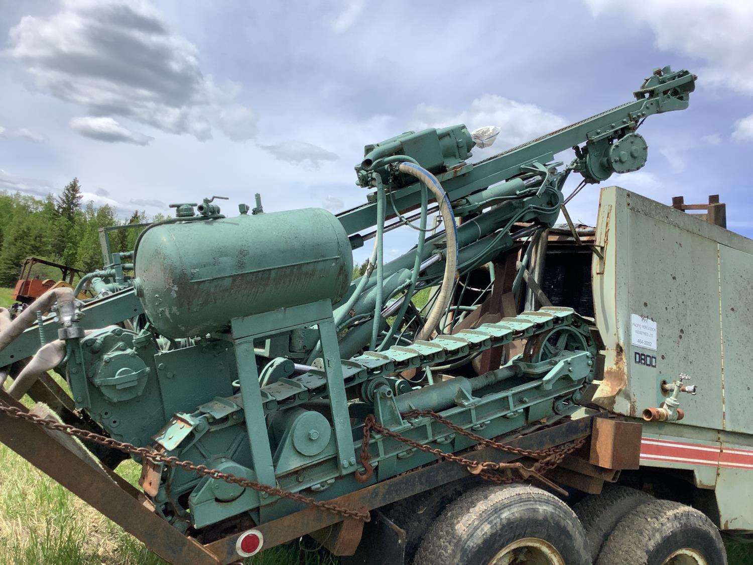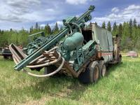 Cummins 335 HP engine, engine brake, engine block heater, 5X4 20 speed manual transmission, Mounted on the rear a Gardner Denver 800 CFM air compressor powered by a Caterpillar 3306B engine to operate the portable tracked Gardener Denver AT-3100 rock drill c/w approximately 12 drilling rods, compressor shows 7009 hours. All sells as one unit, rubber block suspension, 11R24.5 tires