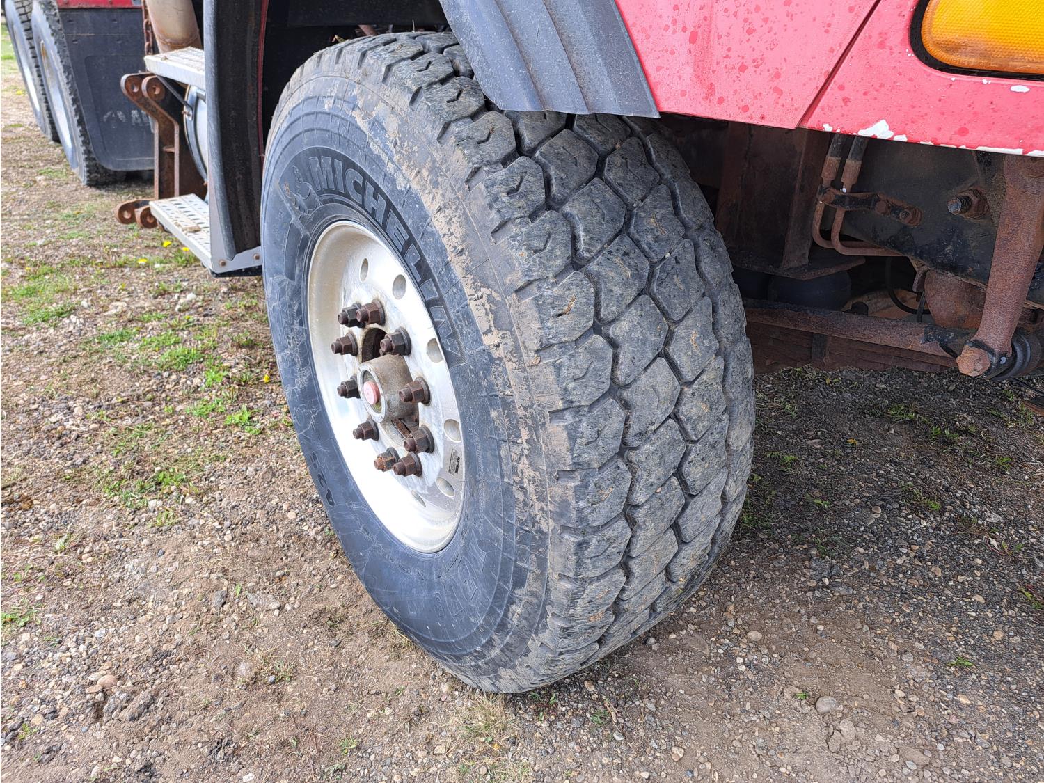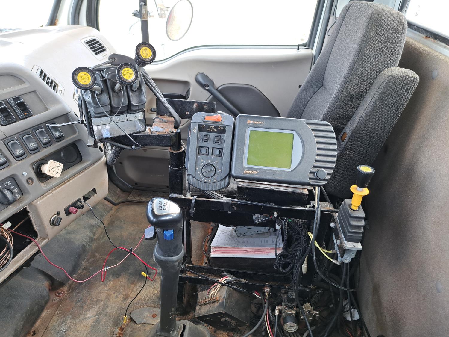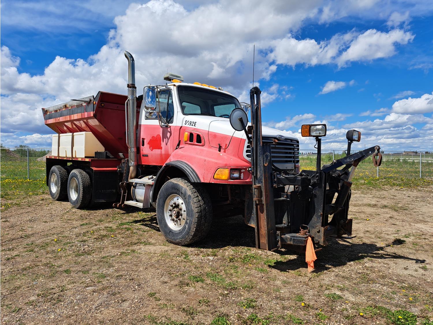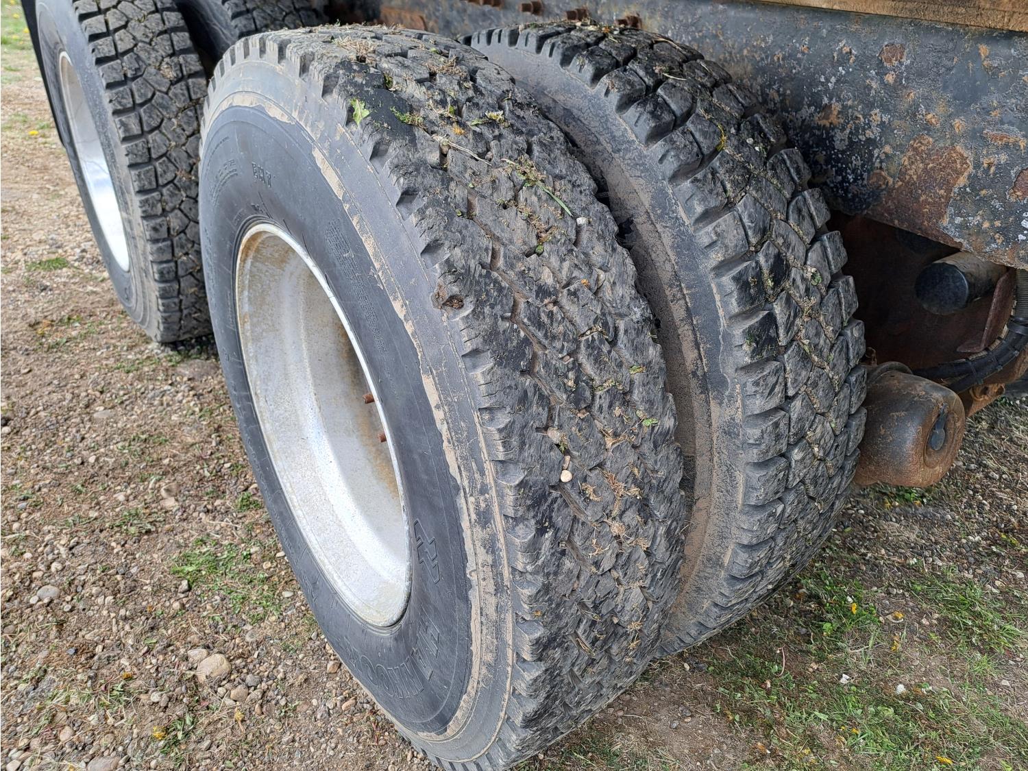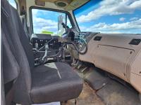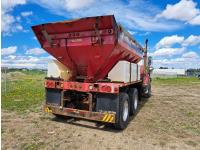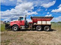 Cummins ISC300 8.3 L 6 cylinder 300 HP diesel engine, engine brake, Eaton Fuller RT8908LL 18 speed manual transmission, A/C, cruise control, air ride driver seat, hydraulic wet kit, beacons, Alliston 12ft x 8ft sloped bottom sand box, side mount sand spreader, poly side tanks with pump, spring suspension, 22,000 lb front axle, 40,000 lb rear axles, 3 way diff locks, 202 inch WB, all aluminum wheels, 425/65R22.5 front tires, 11R22.5 rear tires