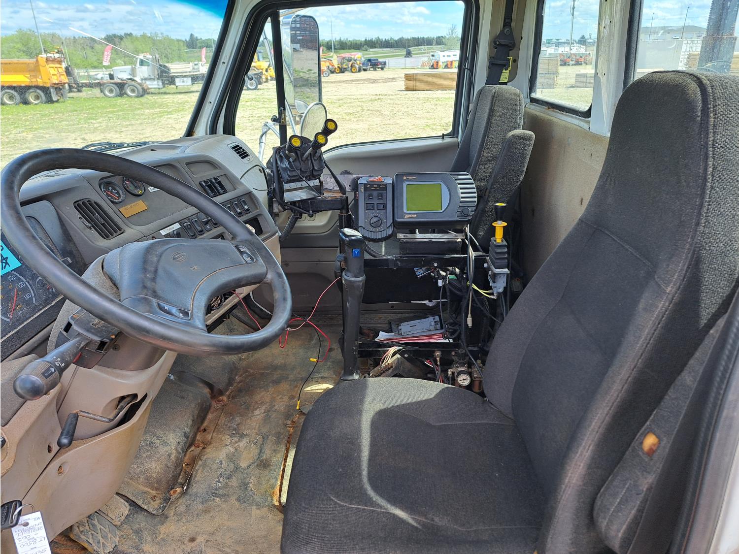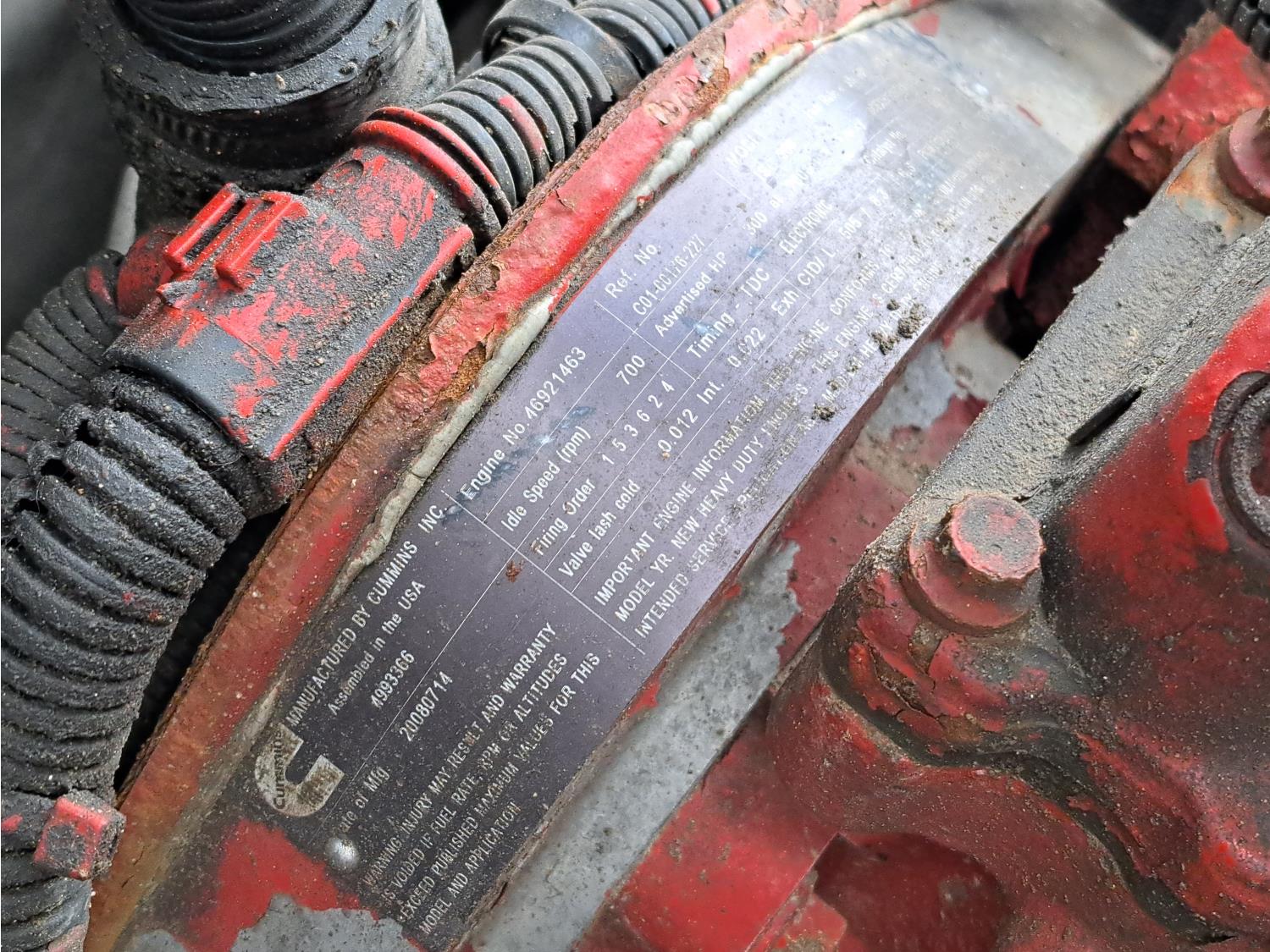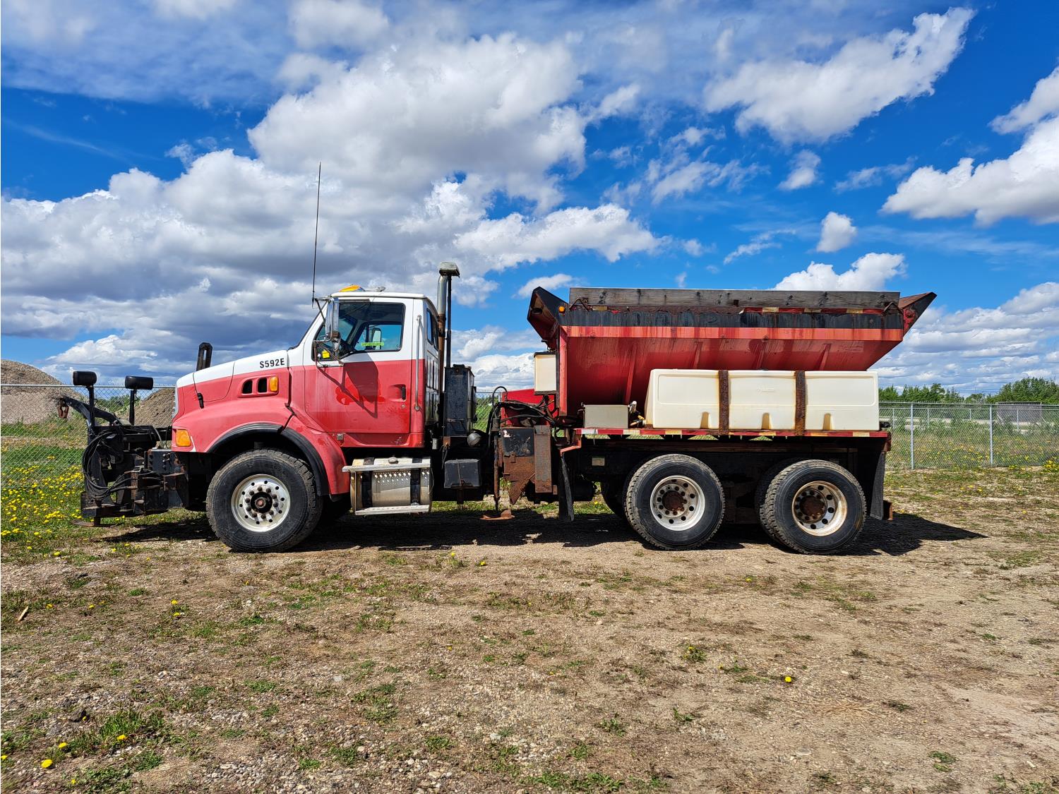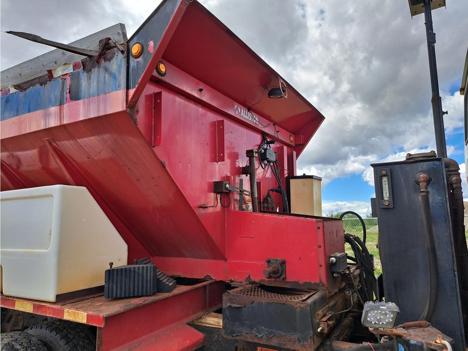Cummins ISC300 8.3 L 6 cylinder 300 HP diesel engine, engine brake, Eaton Fuller RT8908LL 18 speed manual transmission, A/C, cruise control, air ride driver seat, hydraulic wet kit, beacons, Alliston 12ft x 8ft sloped bottom sand box, side mount sand spreader, poly side tanks with pump, spring suspension, 22,000 lb front axle, 40,000 lb rear axles, 3 way diff locks, 202 inch WB, all aluminum wheels, 425/65R22.5 front tires, 11R22.5 rear tires