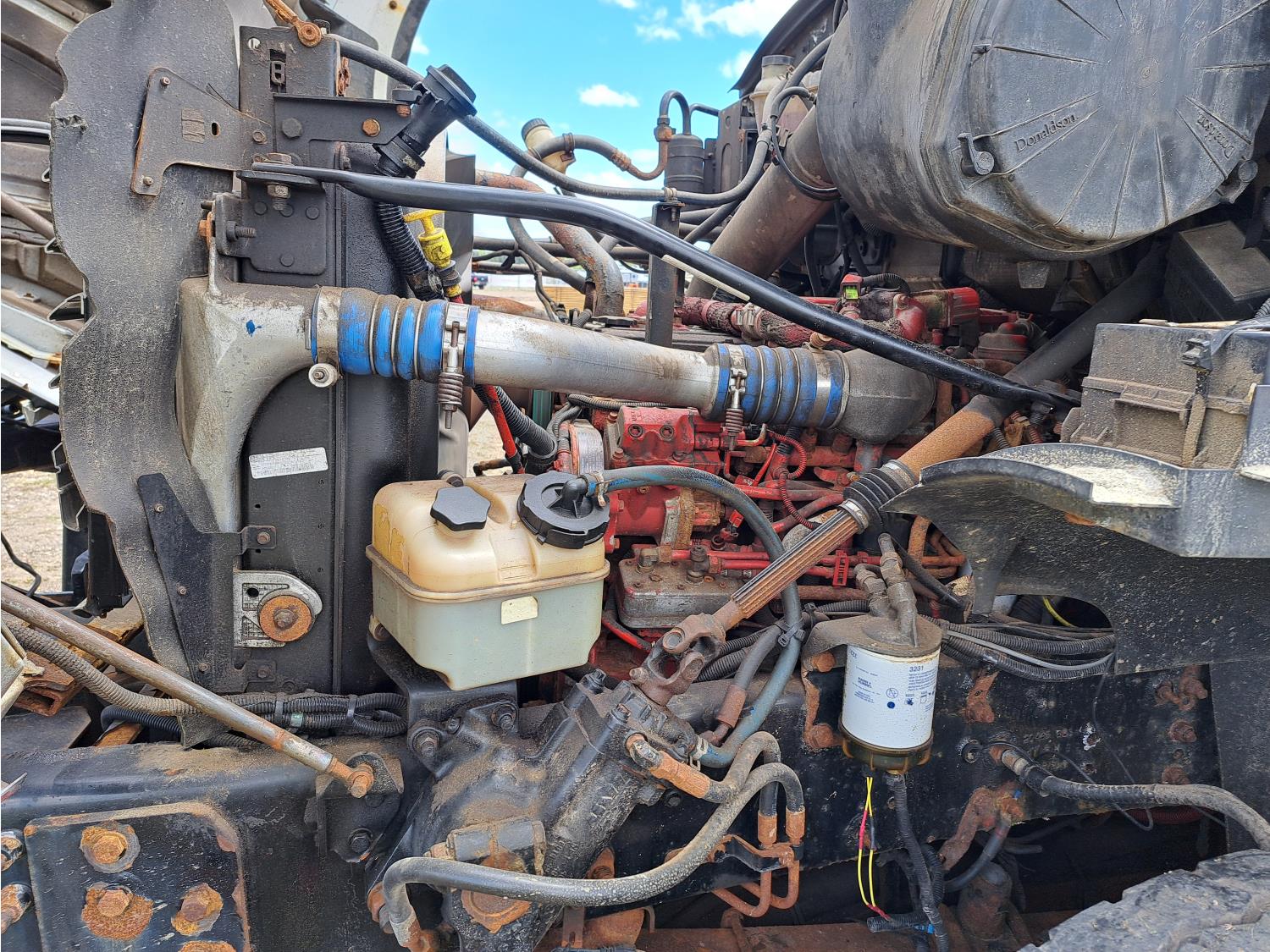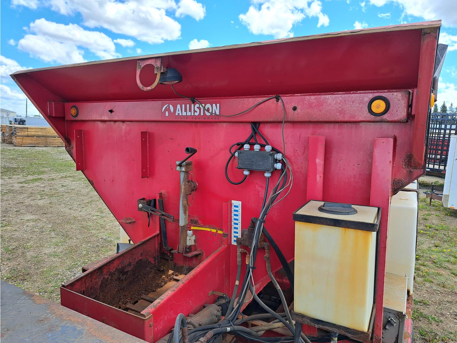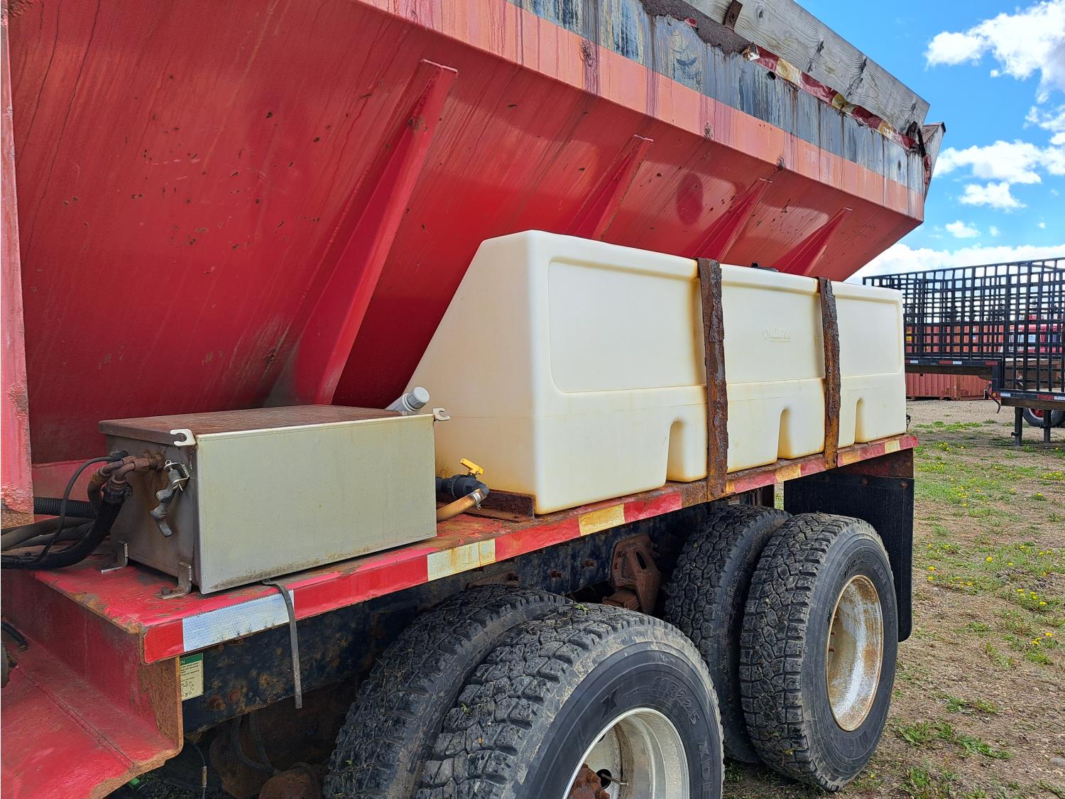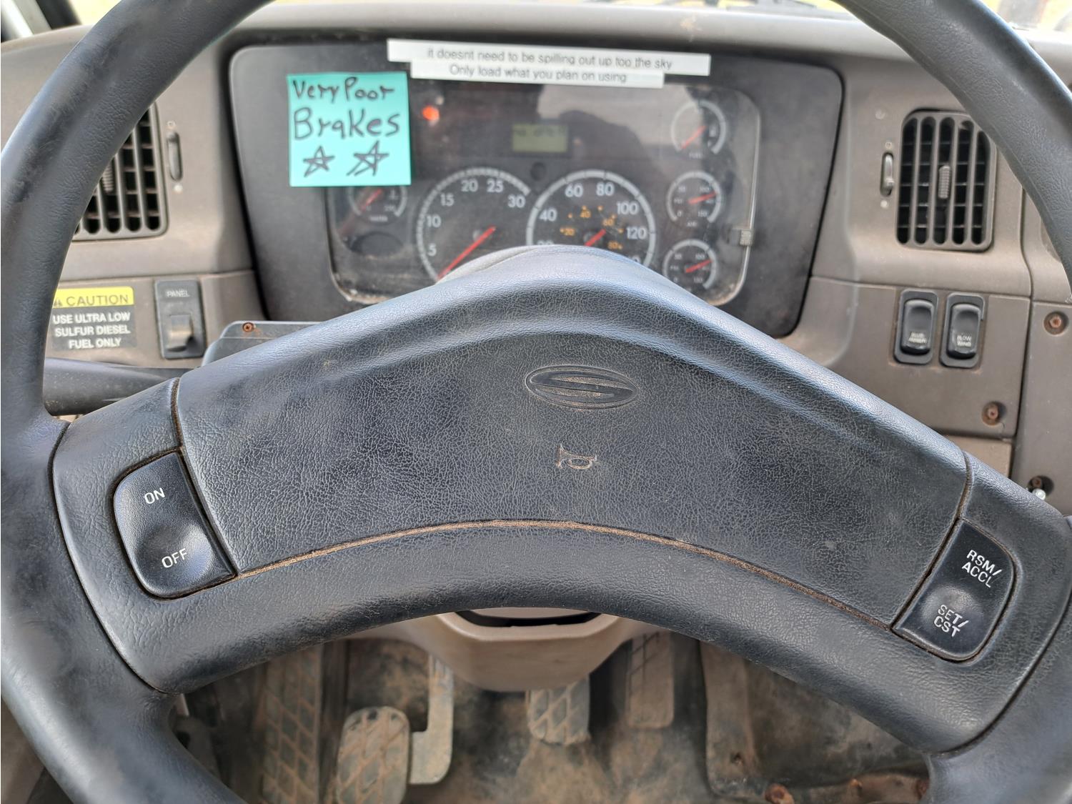 Cummins ISC300 8.3 L 6 cylinder 300 HP diesel engine, engine brake, Eaton Fuller RT8908LL 18 speed manual transmission, A/C, cruise control, air ride driver seat, hydraulic wet kit, beacons, Alliston 12ft x 8ft sloped bottom sand box, side mount sand spreader, poly side tanks with pump, spring suspension, 22,000 lb front axle, 40,000 lb rear axles, 3 way diff locks, 202 inch WB, all aluminum wheels, 425/65R22.5 front tires, 11R22.5 rear tires