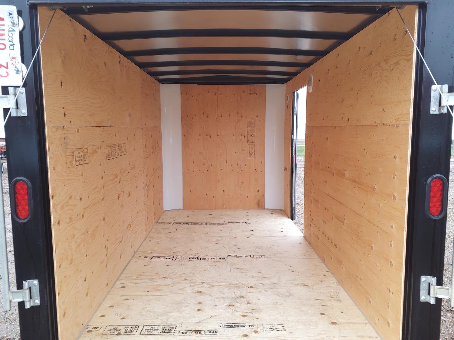 72 inch interior width, 74 inch interior height, ball hitch, side door, fold down door, spring suspension, 3500 lb axles, 205/75R14 tires