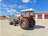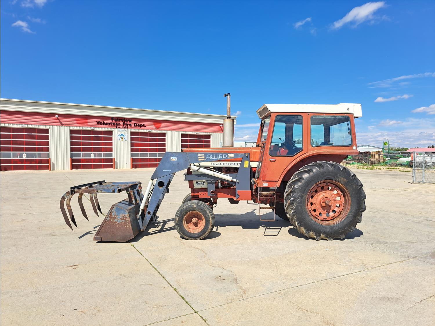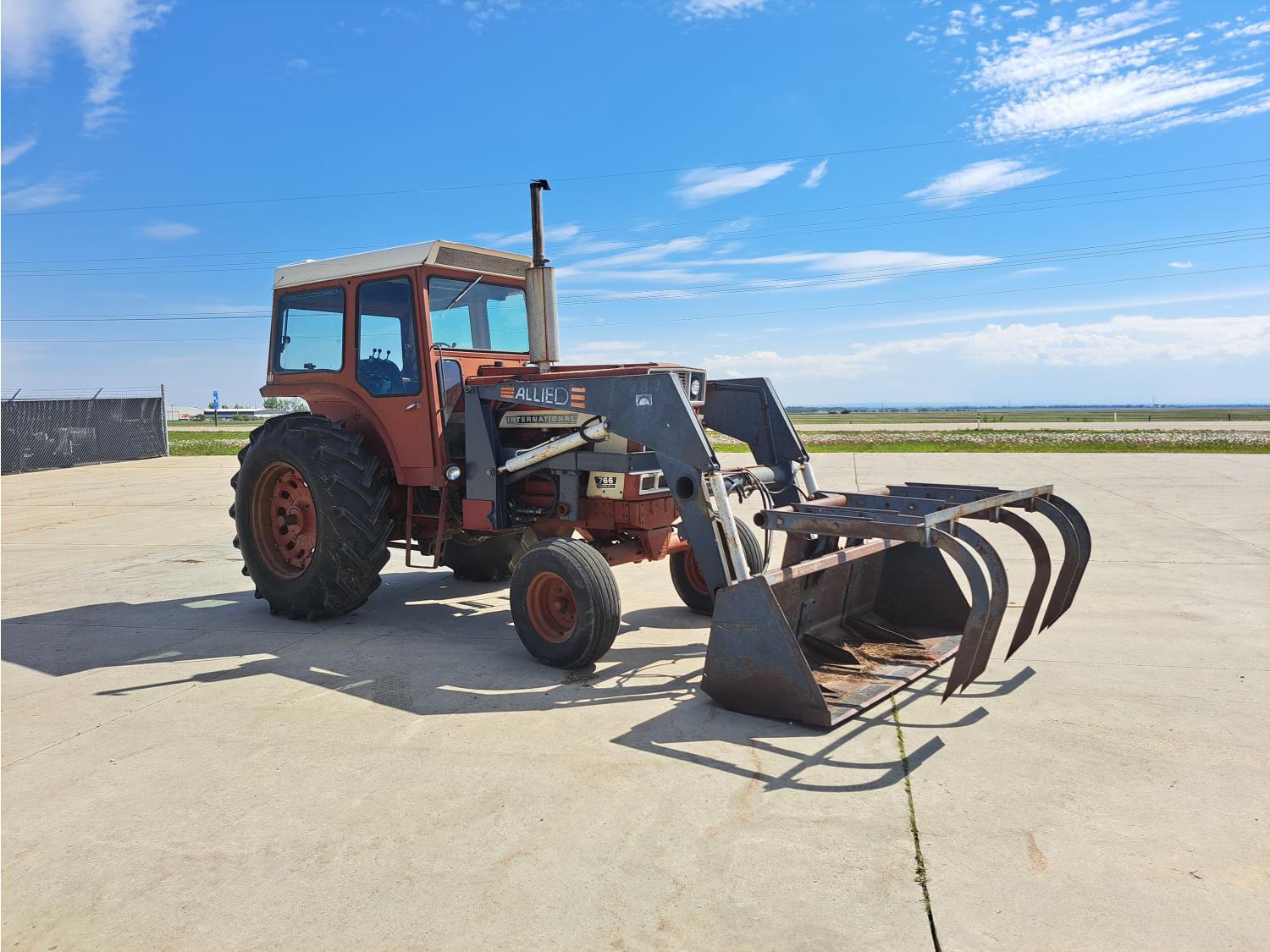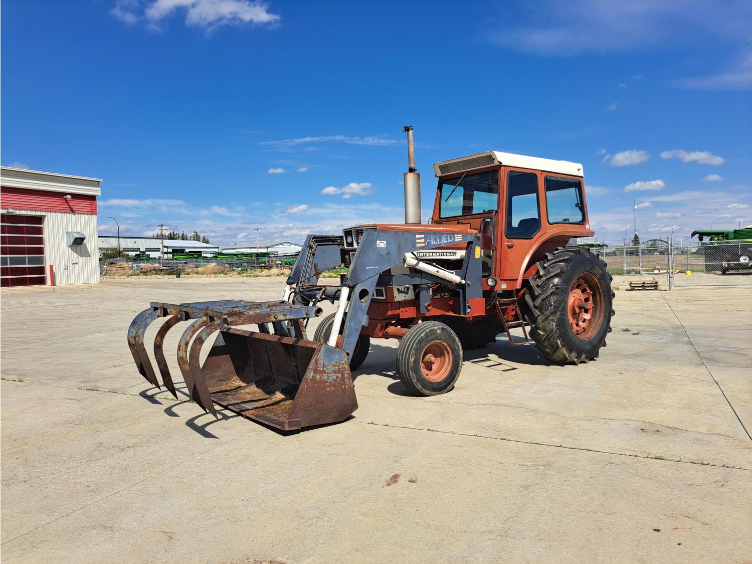 Allied 784 loader, 84 inch bucket, grapple, International HARVESTER 5.9 L 6 cylinder 88 HP, diesel engine, 85 PTO HP, 8 speed partial power shift transmission, cab, 540/1000 PTO, 2 rear hydraulic outlets, 12.5L-16 front tires, 18.4/15-34 rear tires