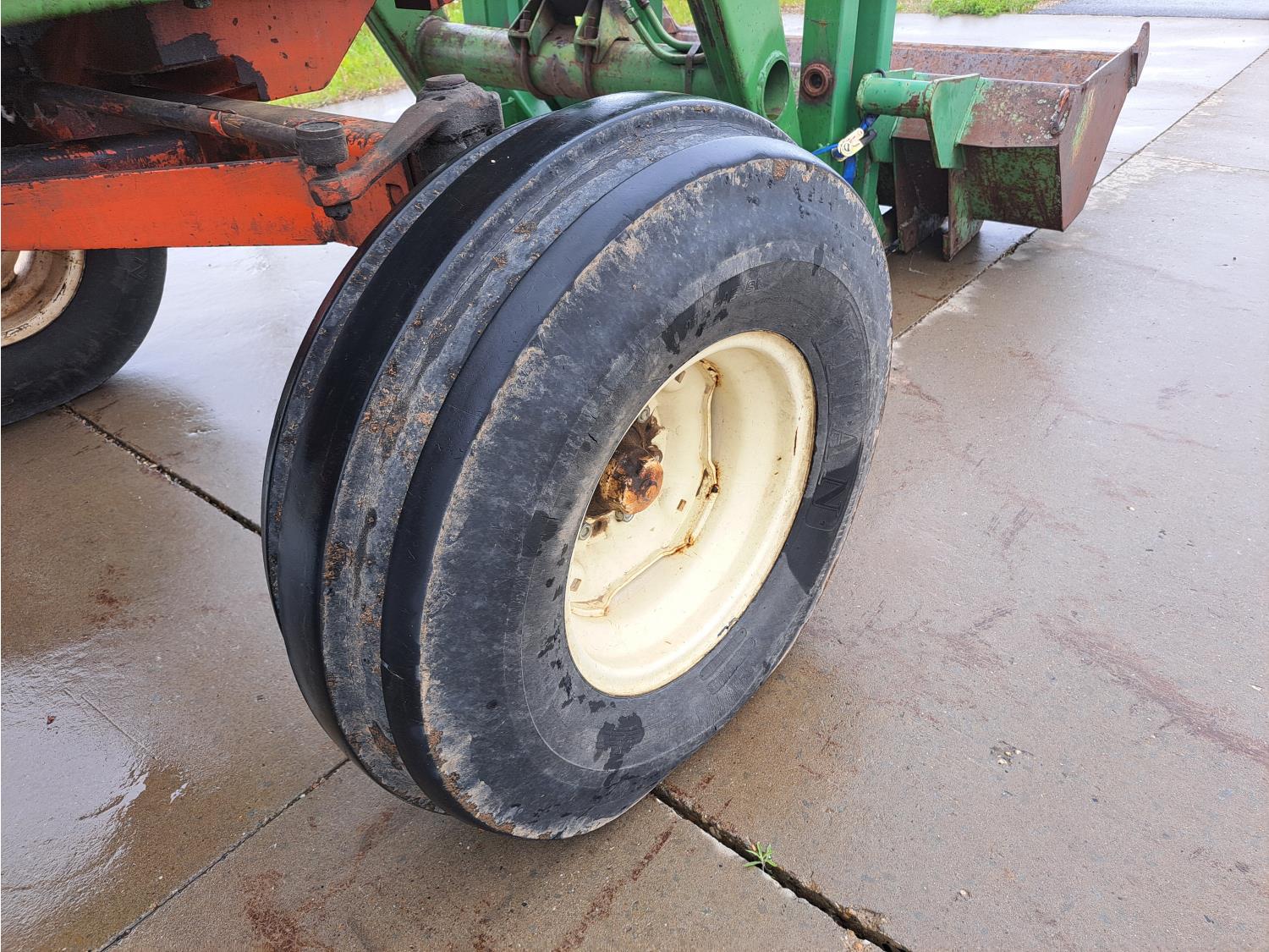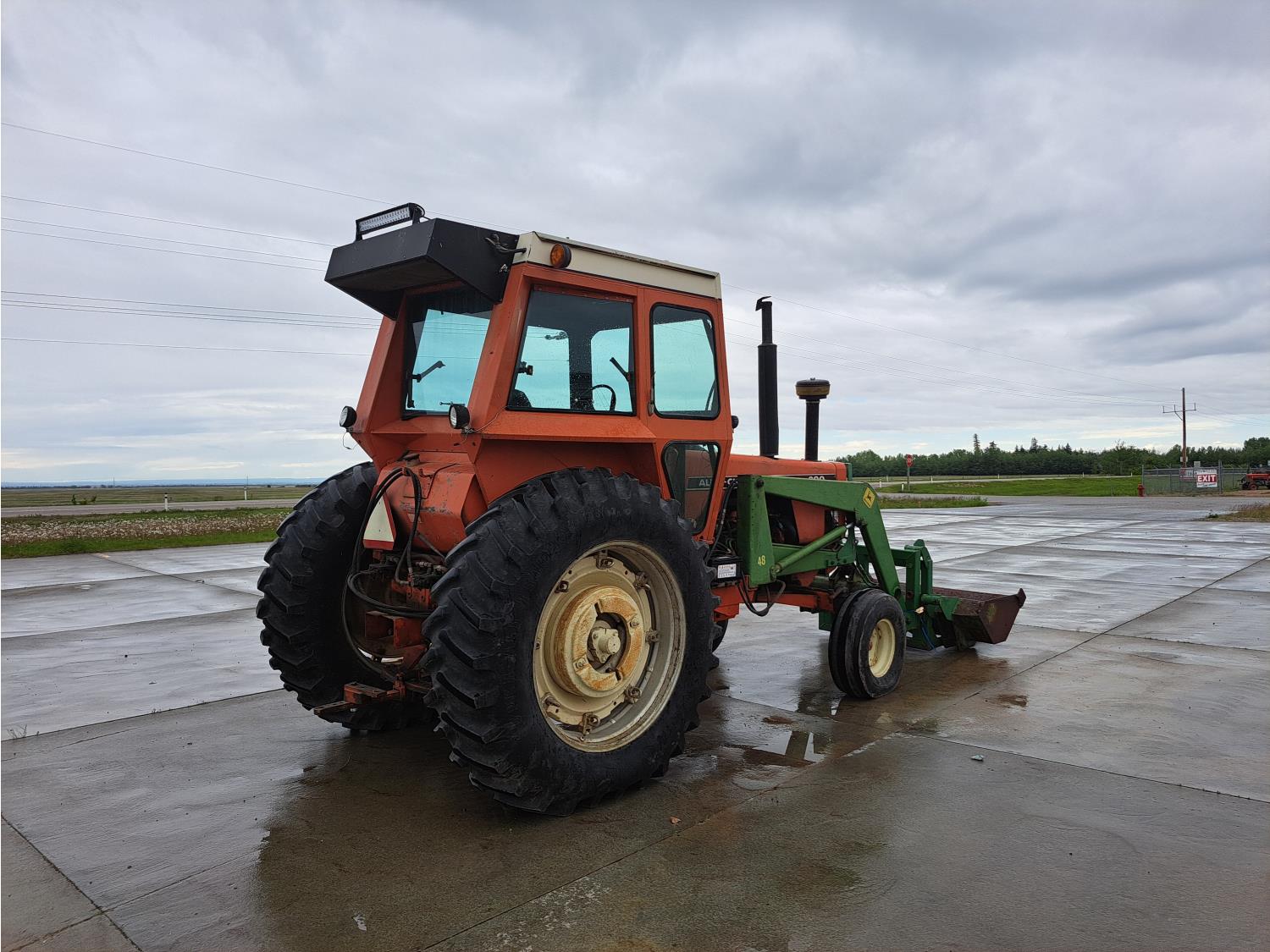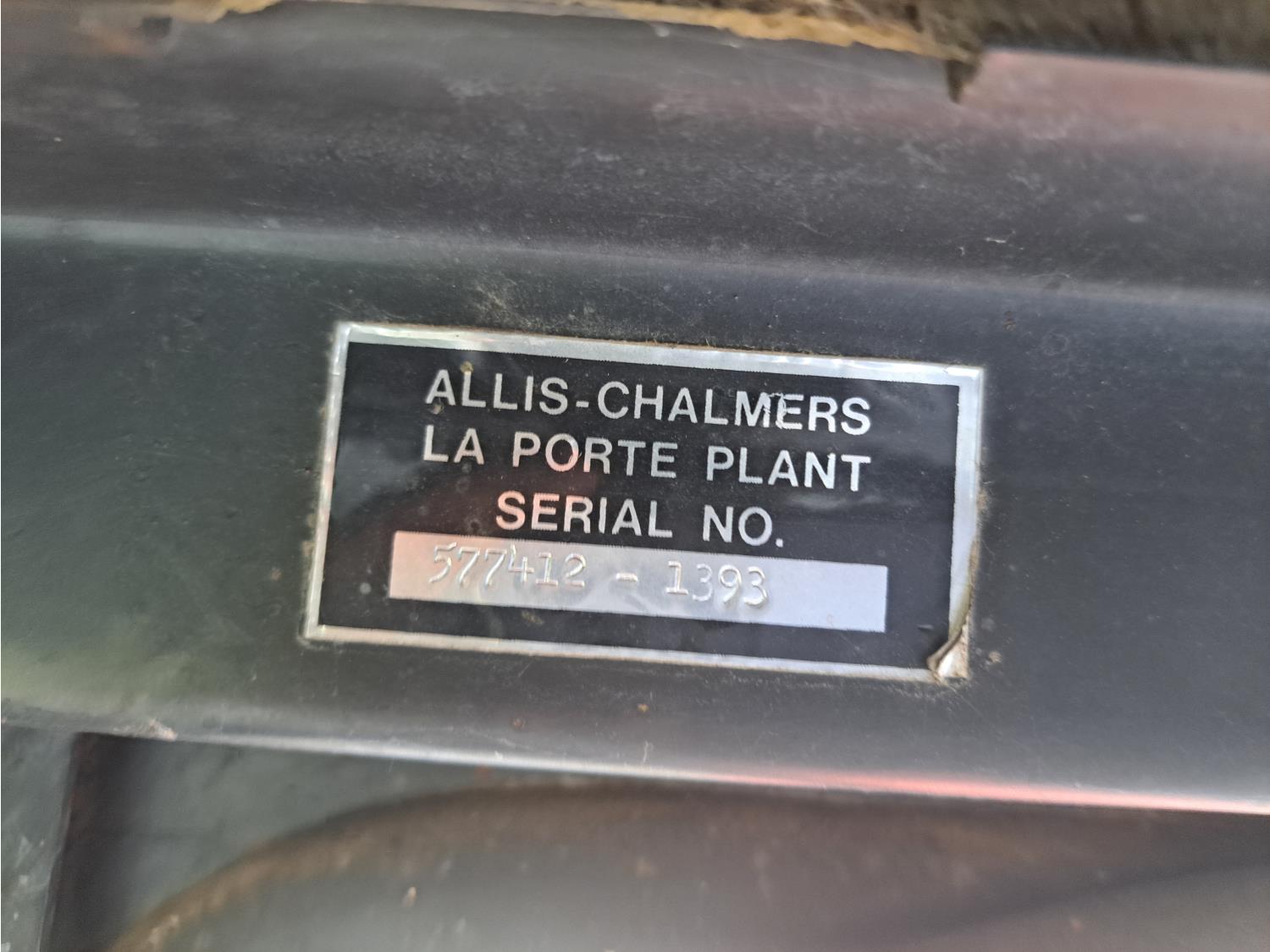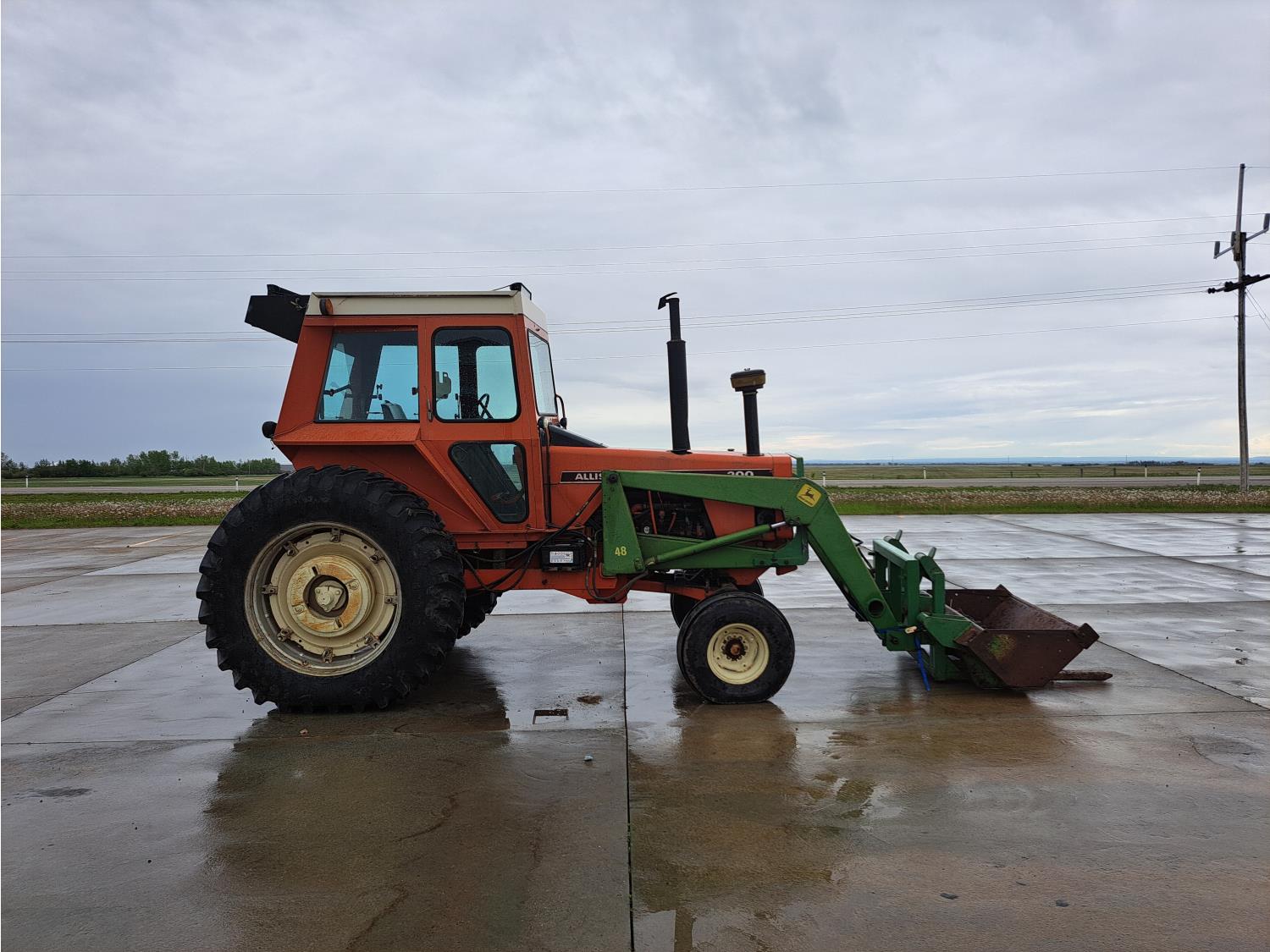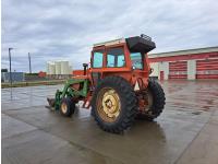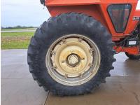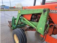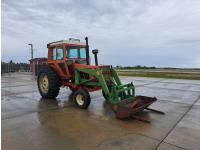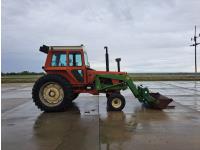 John Deere 48 loader, 60 inch bucket, bale forks, pallet forks, Allis Chalmers 4.9 L 6 cylinder 104 HP, diesel engine, 93 PTO HP, 8 speed manual transmission, cab, 540 PTO, 2 rear hydraulic outlets, rear wheel weights, 11L-15 front tires, 18.4-38 rear tires