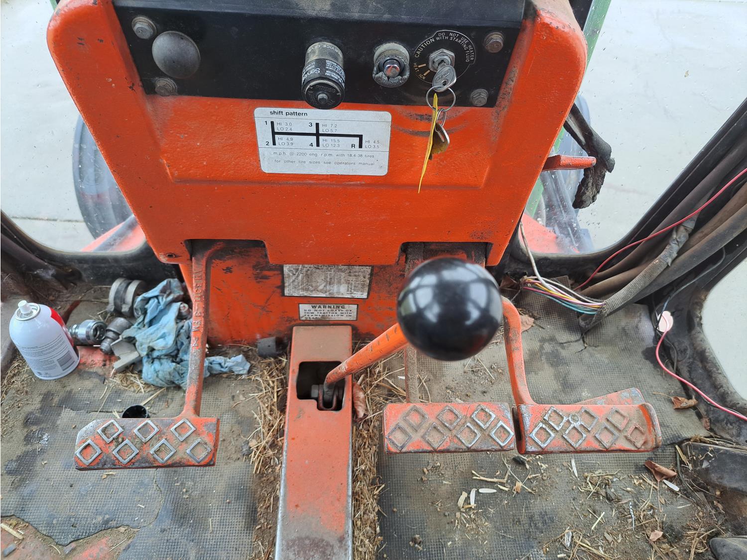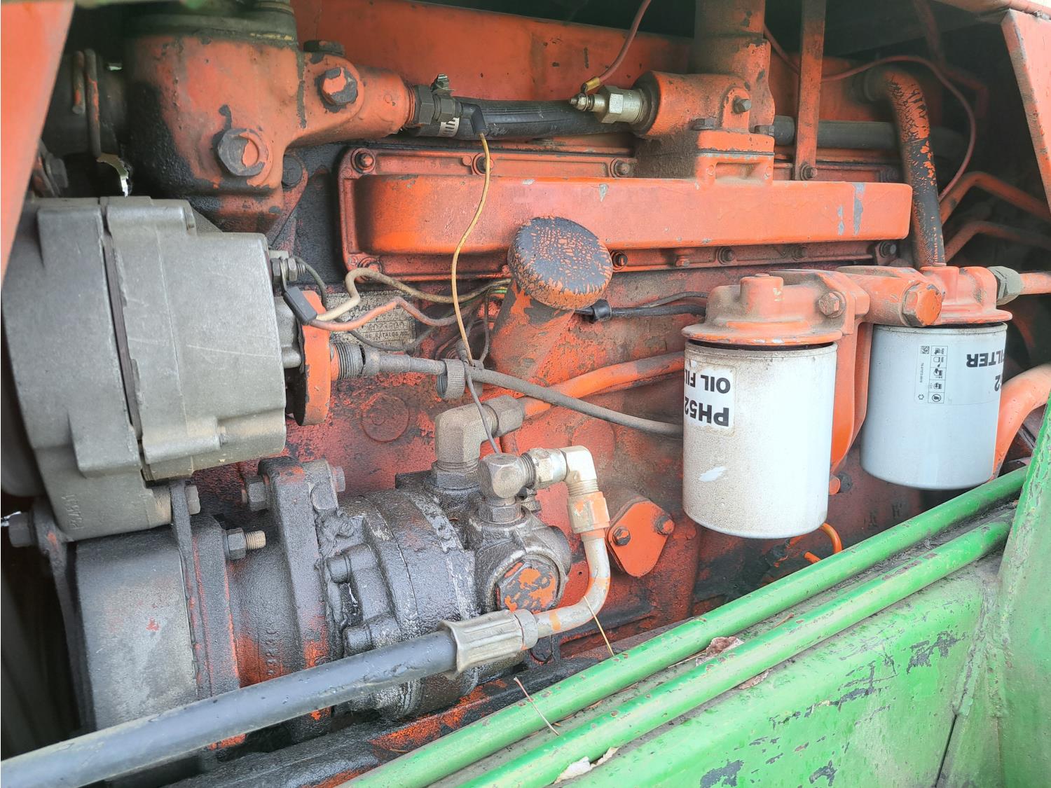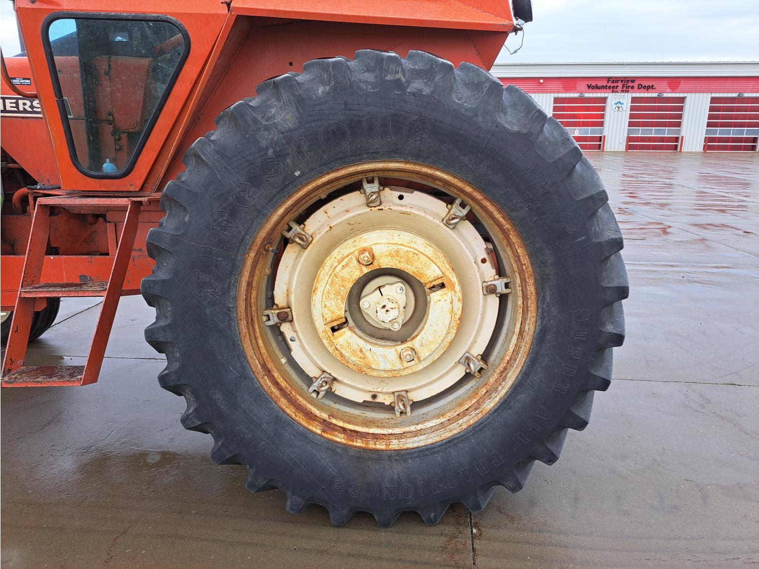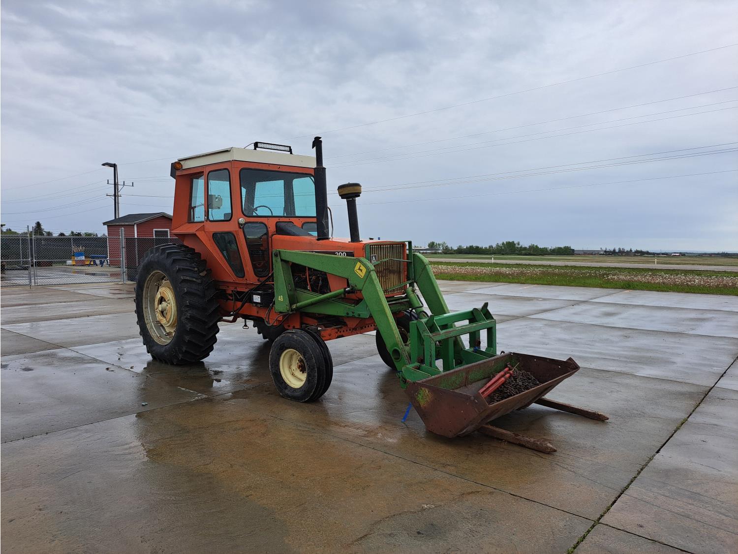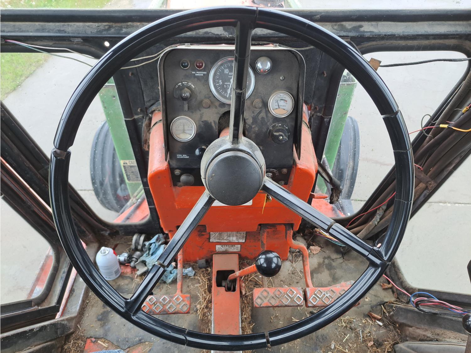 John Deere 48 loader, 60 inch bucket, bale forks, pallet forks, Allis Chalmers 4.9 L 6 cylinder 104 HP, diesel engine, 93 PTO HP, 8 speed manual transmission, cab, 540 PTO, 2 rear hydraulic outlets, rear wheel weights, 11L-15 front tires, 18.4-38 rear tires