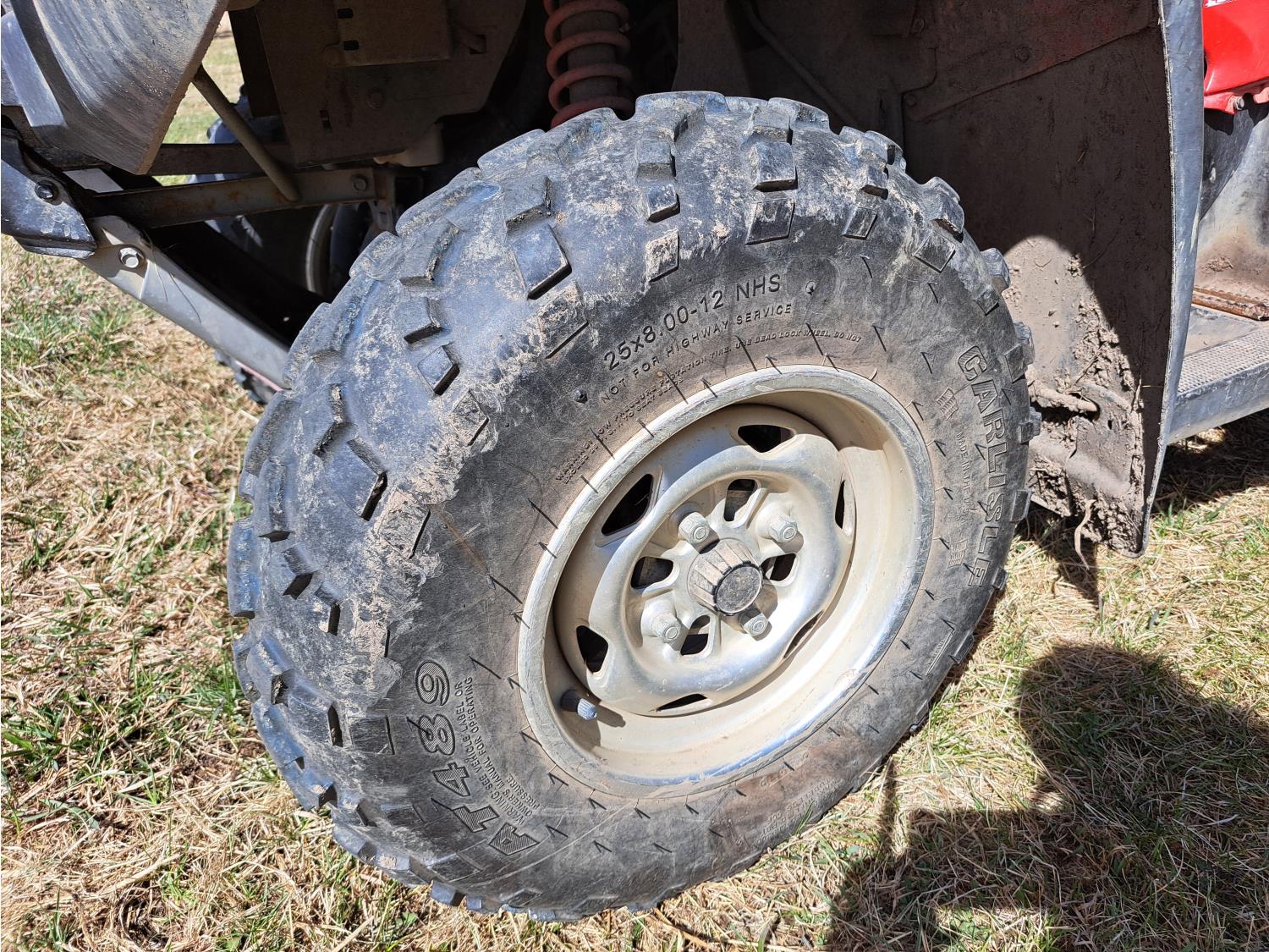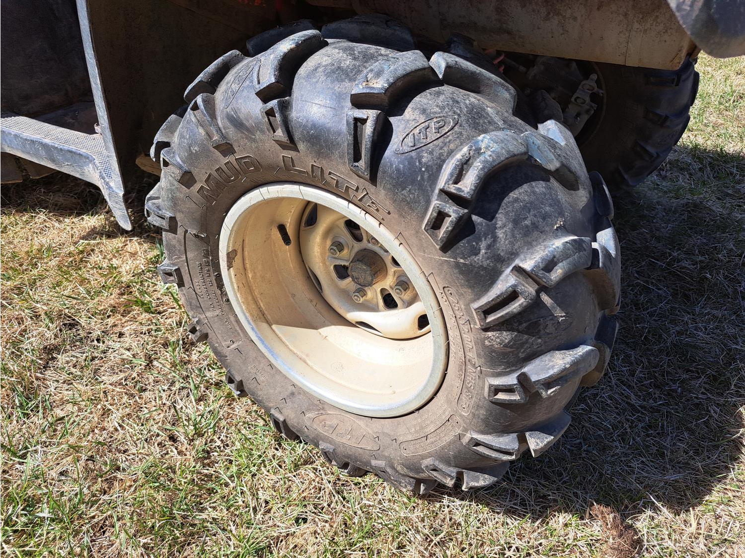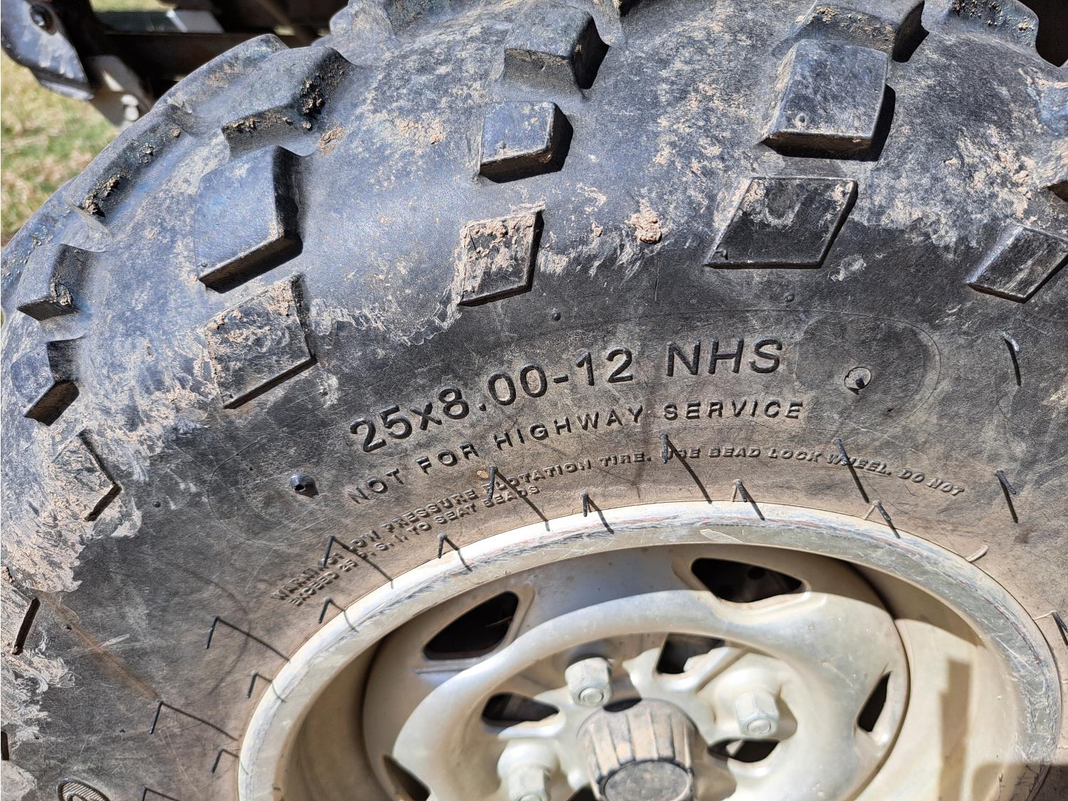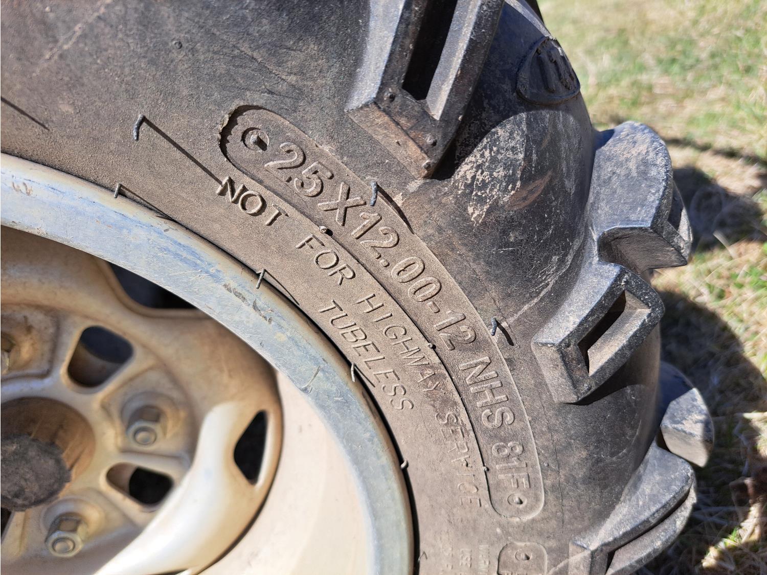 engine, automatic transmission, electric shift, reverse, hitch, front and rear racks, 25X8.00-12 front tires, 25X12.00-12 rear tires