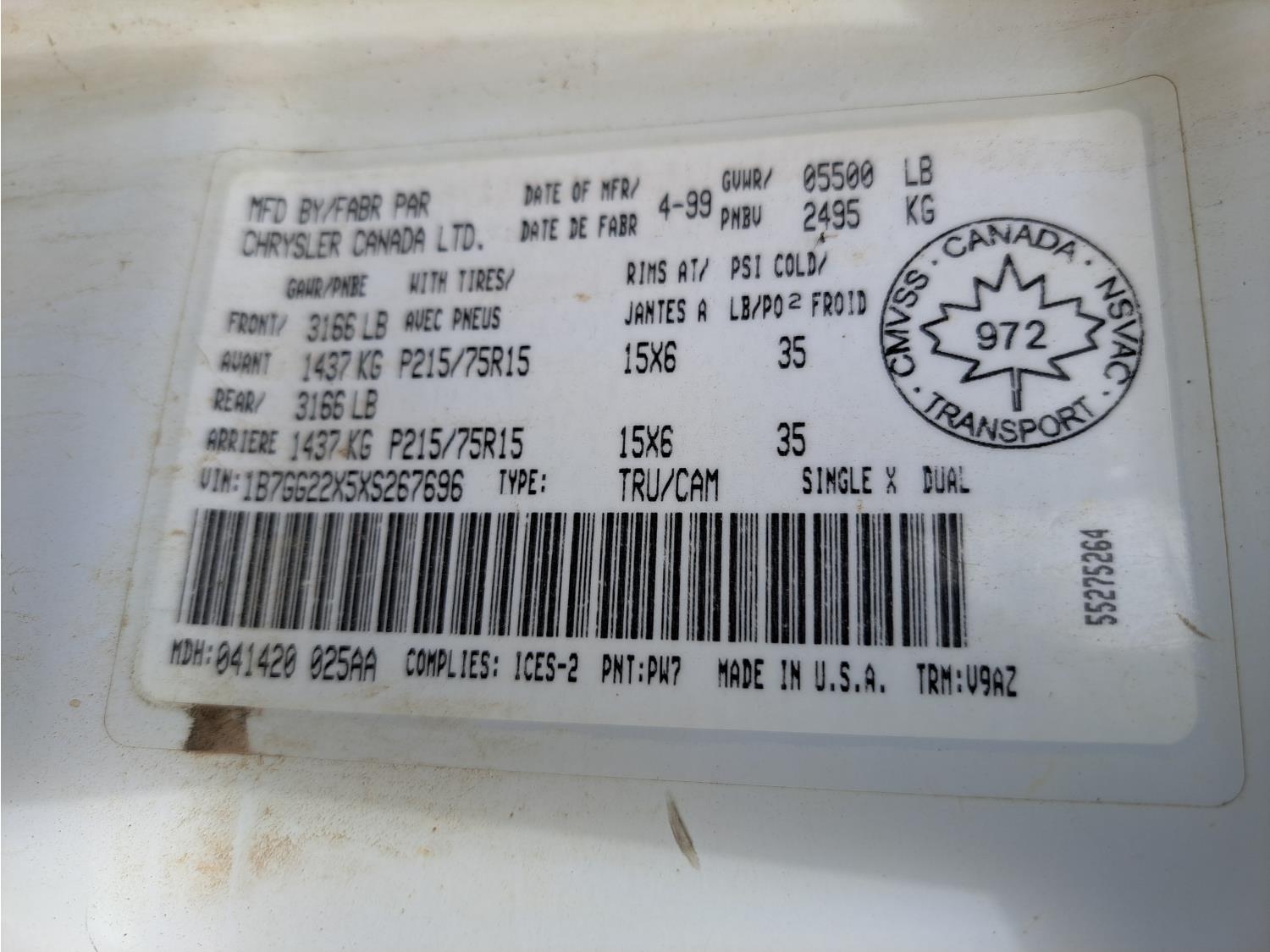 - 1B7GG22X5XS267696