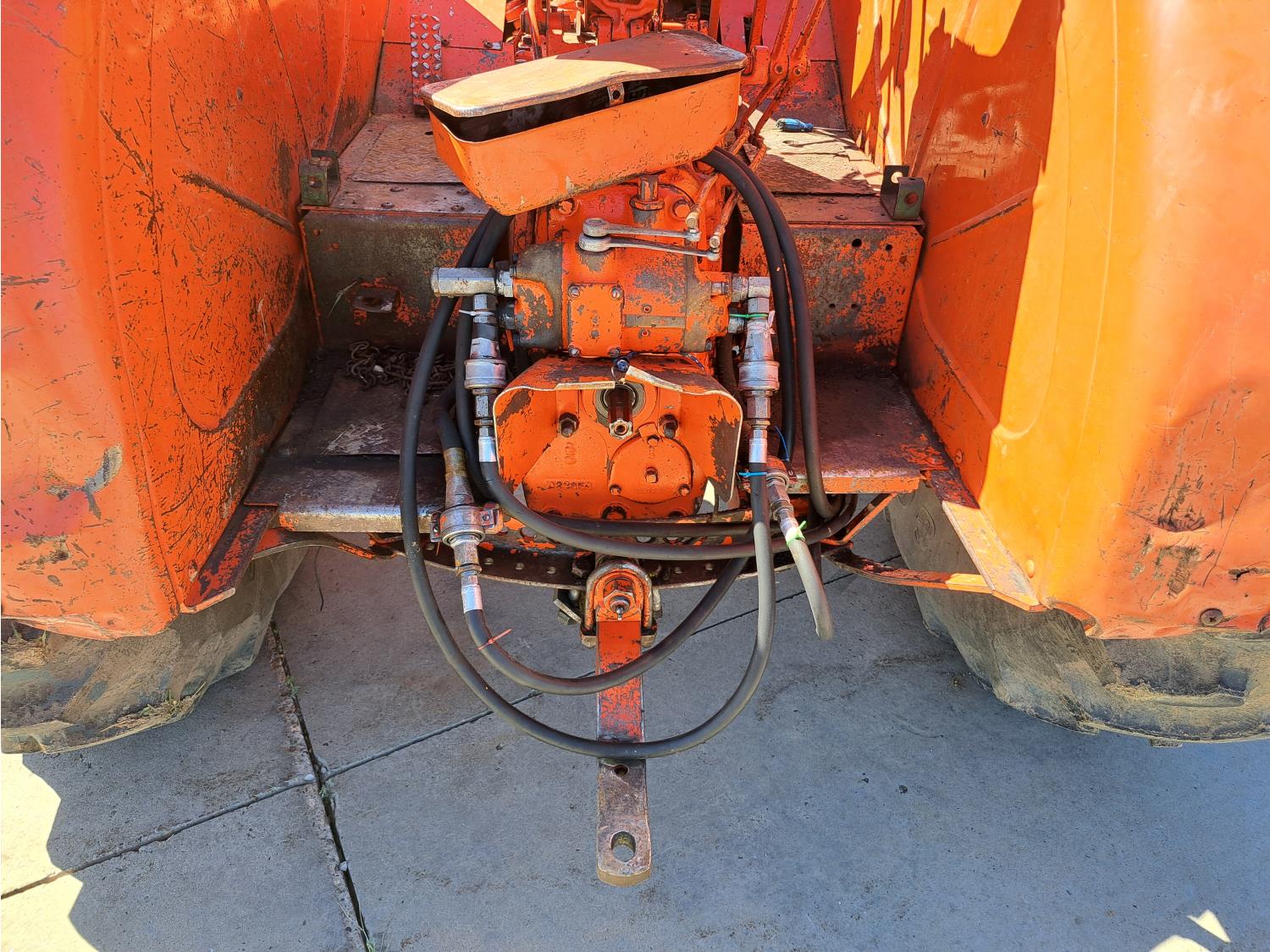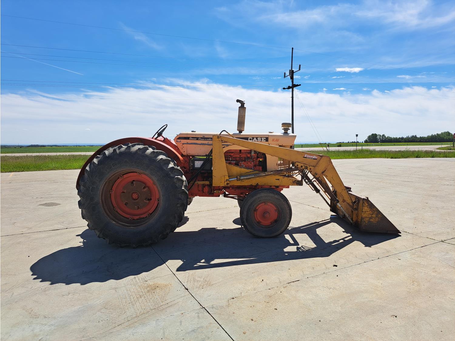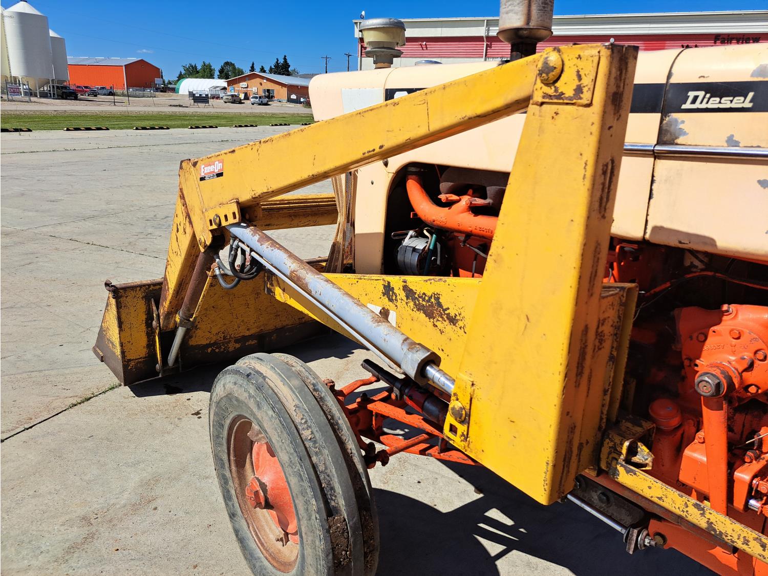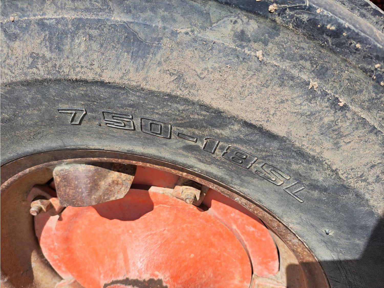 Easy On loader, 4.9 L 4 cylinder 73 HP, diesel engine, 8 speed manual transmission, open station platform, 540 PTO, 2 rear hydraulic outlets, rear wheel weights, 7.50-18 front tires, 18.4-34 rear tires
