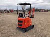 Open station, gas engine, 16 inch dig bucket, manual coupler, manual thumb, 31 inch stick, backfill blade, 7 inch rubber tracks
