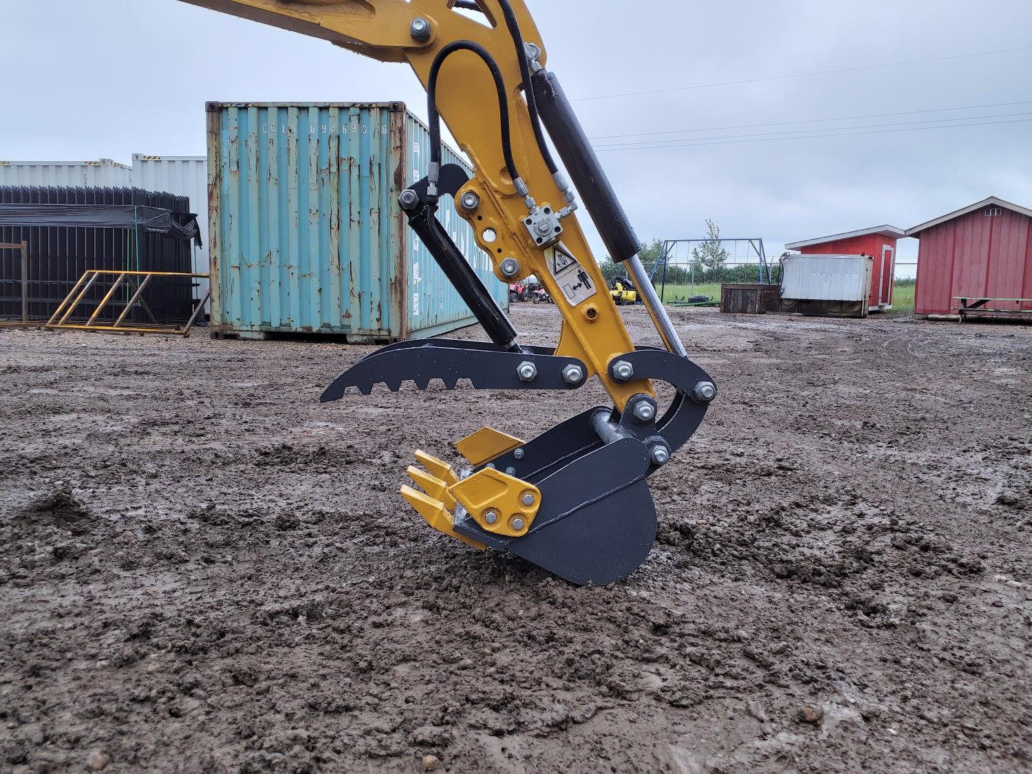 Open station, 13.5 HP gas engine, 15 inch dig bucket, hydraulic thumb, 32 inch stick, backfill blade, bucket capacity 0.03 cubic meters, maximum digging depth 65 inches, maximum digging height 94.5 inches, maximum digging distance 118 inches, lift capacity 220 Lbs, 7 inch rubber tracks
