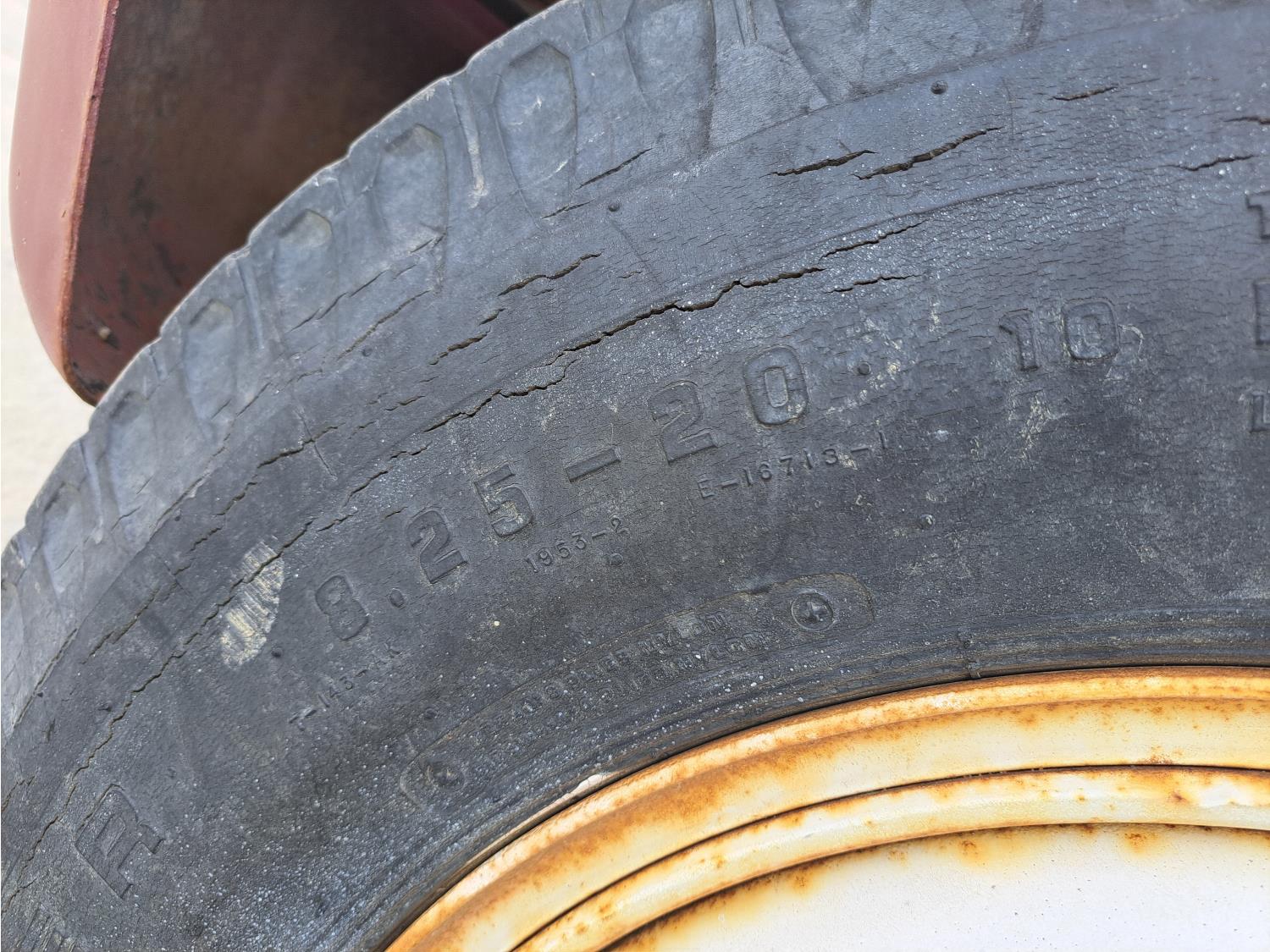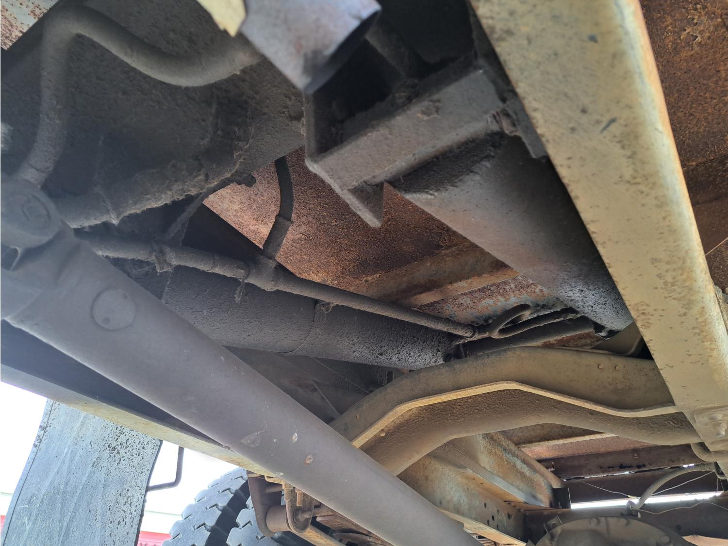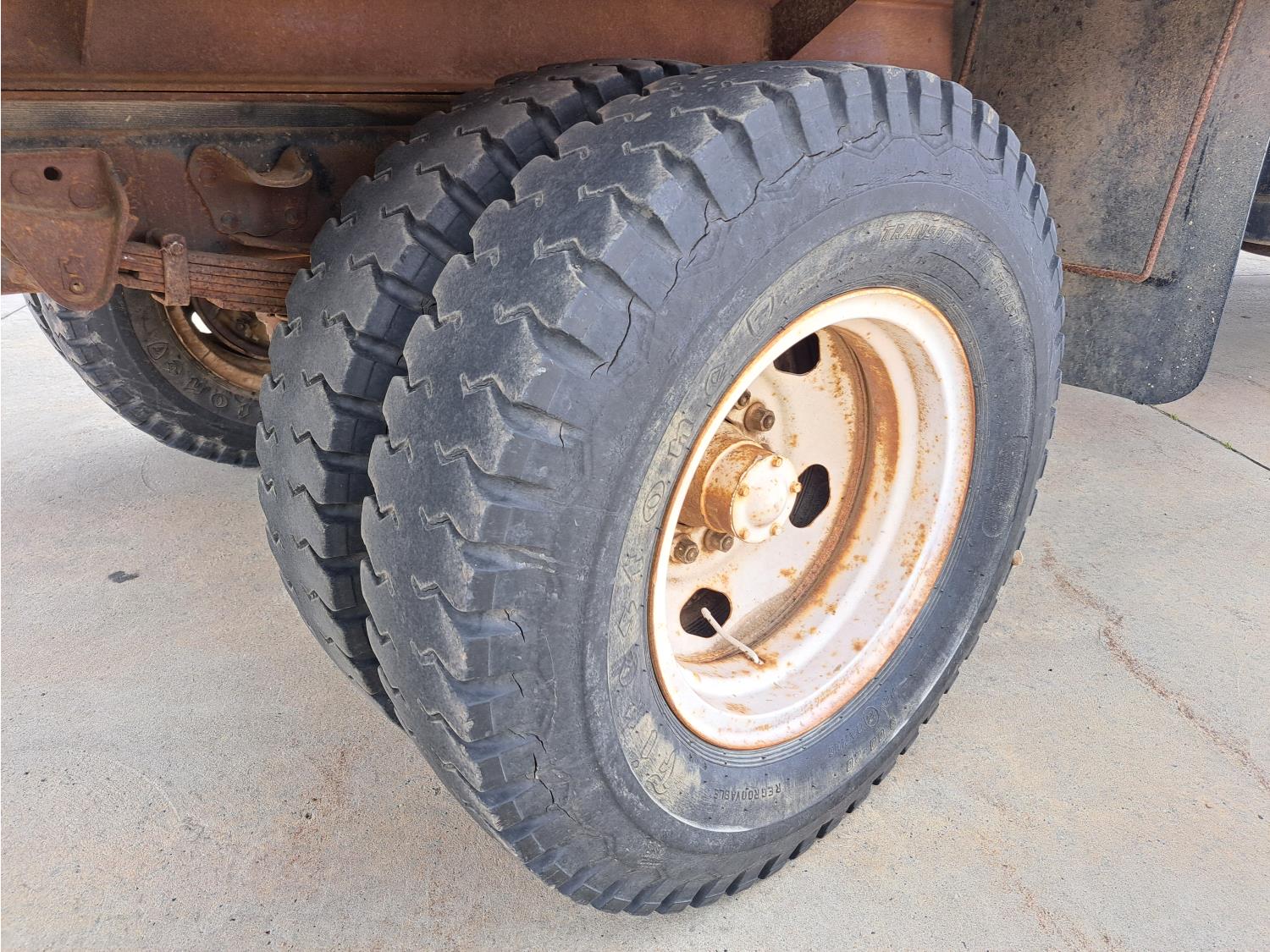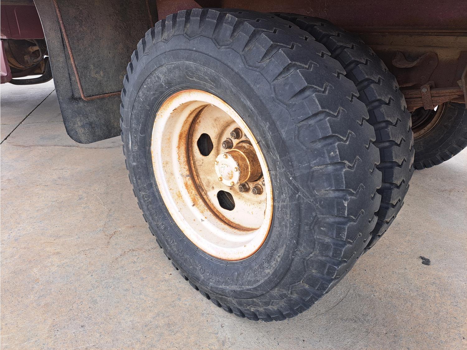 gas engine, 4 speed manual transmission, radio, 12 ft box, spring suspension, 5,000 lb front axle, 13,500 lb rear axles, 8.25-20 front tires, 9.00-20 rear tires