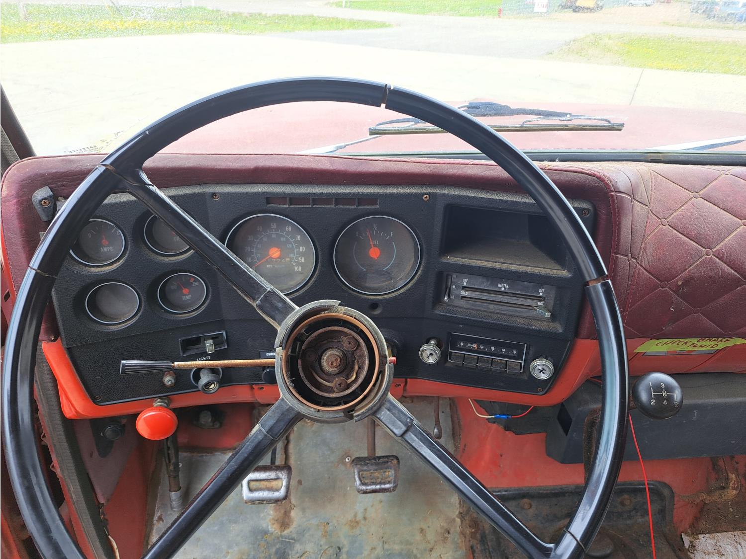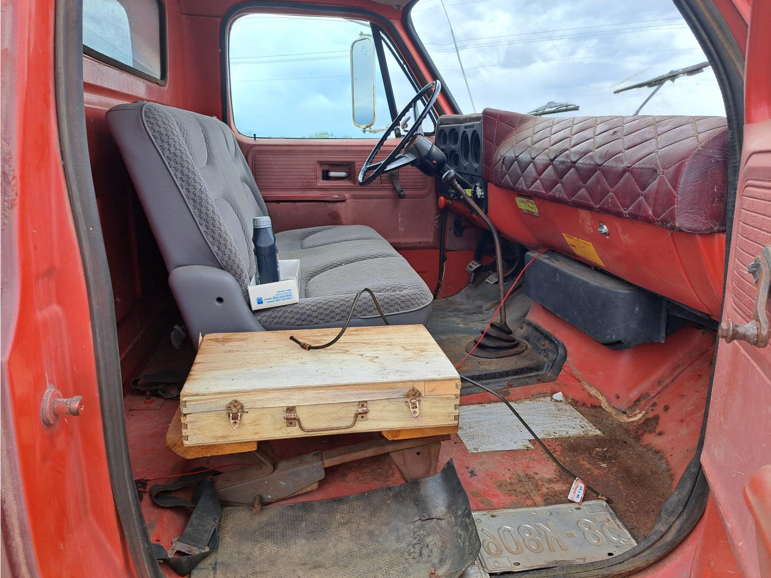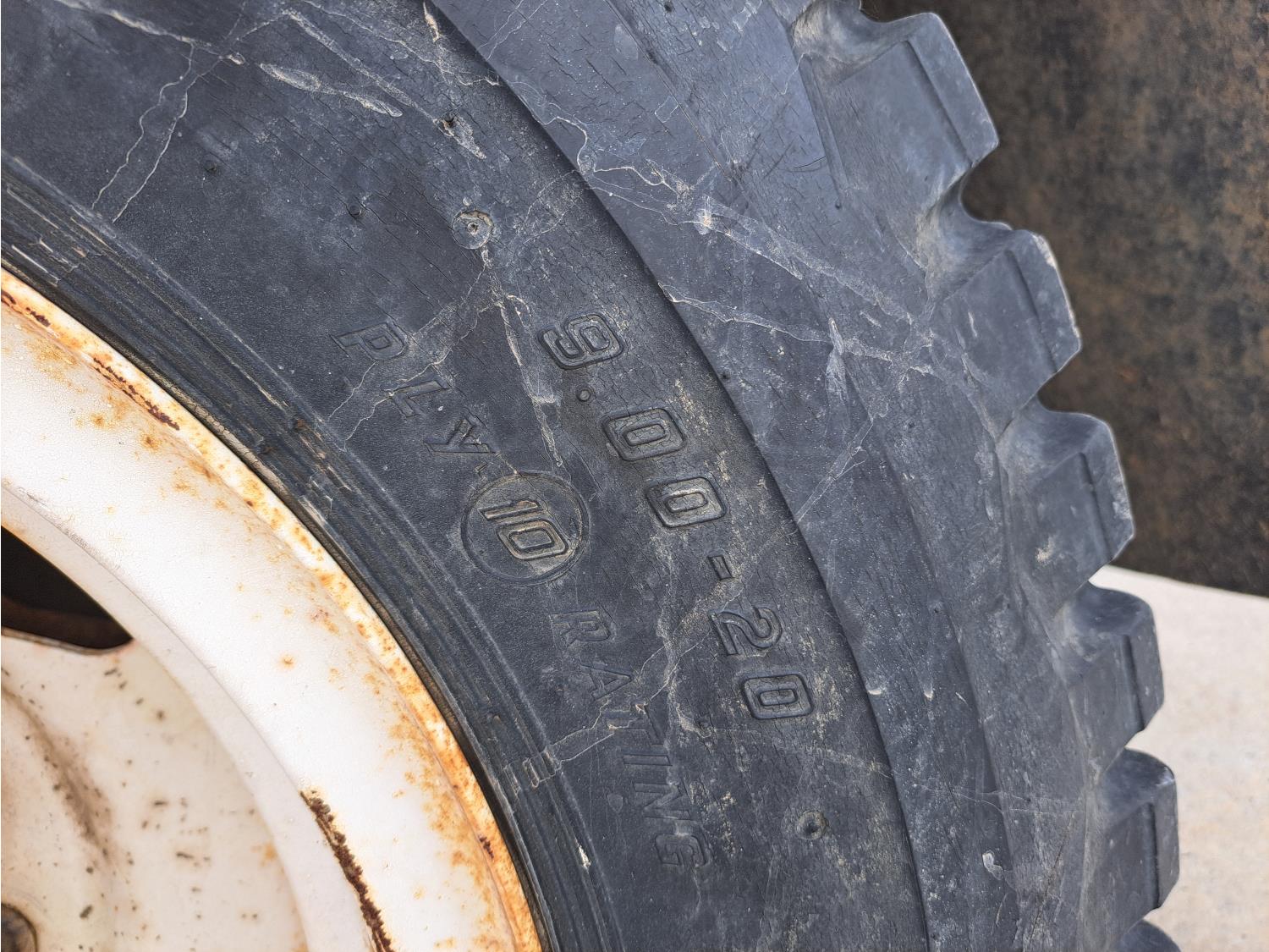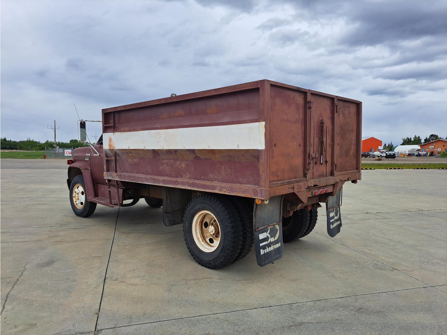 gas engine, 4 speed manual transmission, radio, 12 ft box, spring suspension, 5,000 lb front axle, 13,500 lb rear axles, 8.25-20 front tires, 9.00-20 rear tires