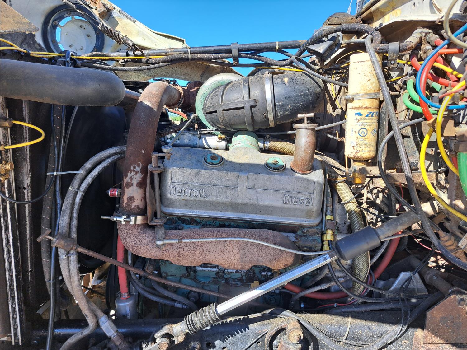 Detroit diesel engine, Fuller Roadranger manual transmission, radio, spring suspension, diff lock, 13R22.5 front tires, 11R22.5 rear tires