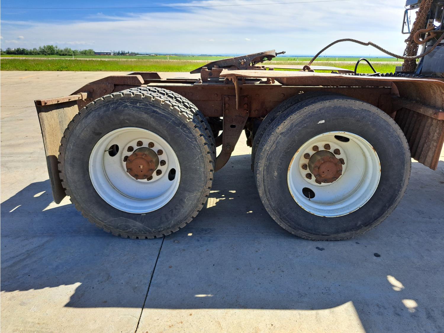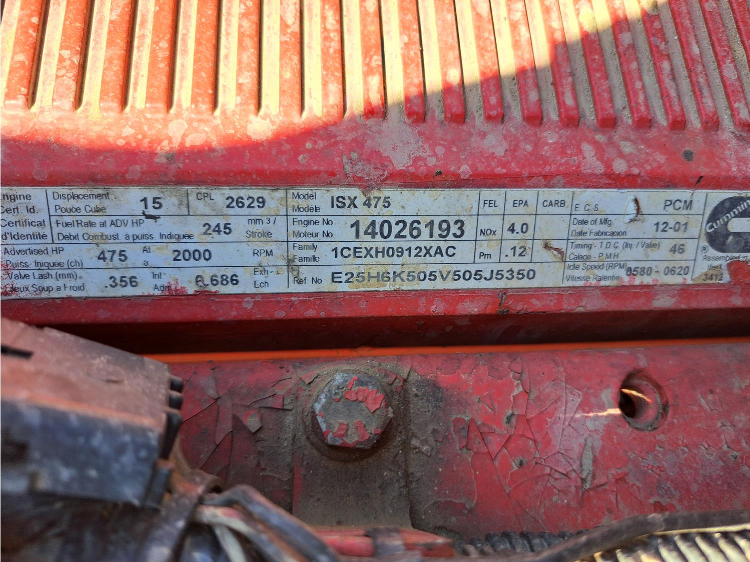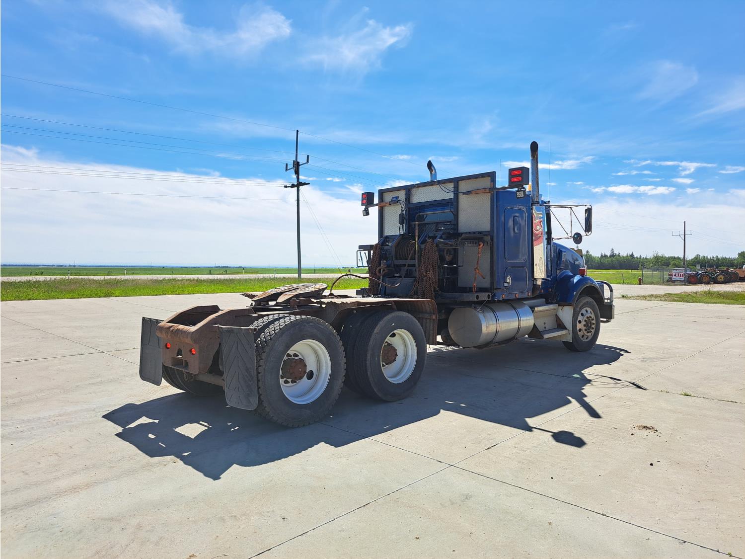 Cummins 475 HP diesel engine, engine brake, Eaton FULLER 18 speed manual transmission, A/C, cruise control, leather interior, stereo, moose bumper, headache rack, beacons, chain holders, hydraulic winch, diff lock, 11R24.5 tires