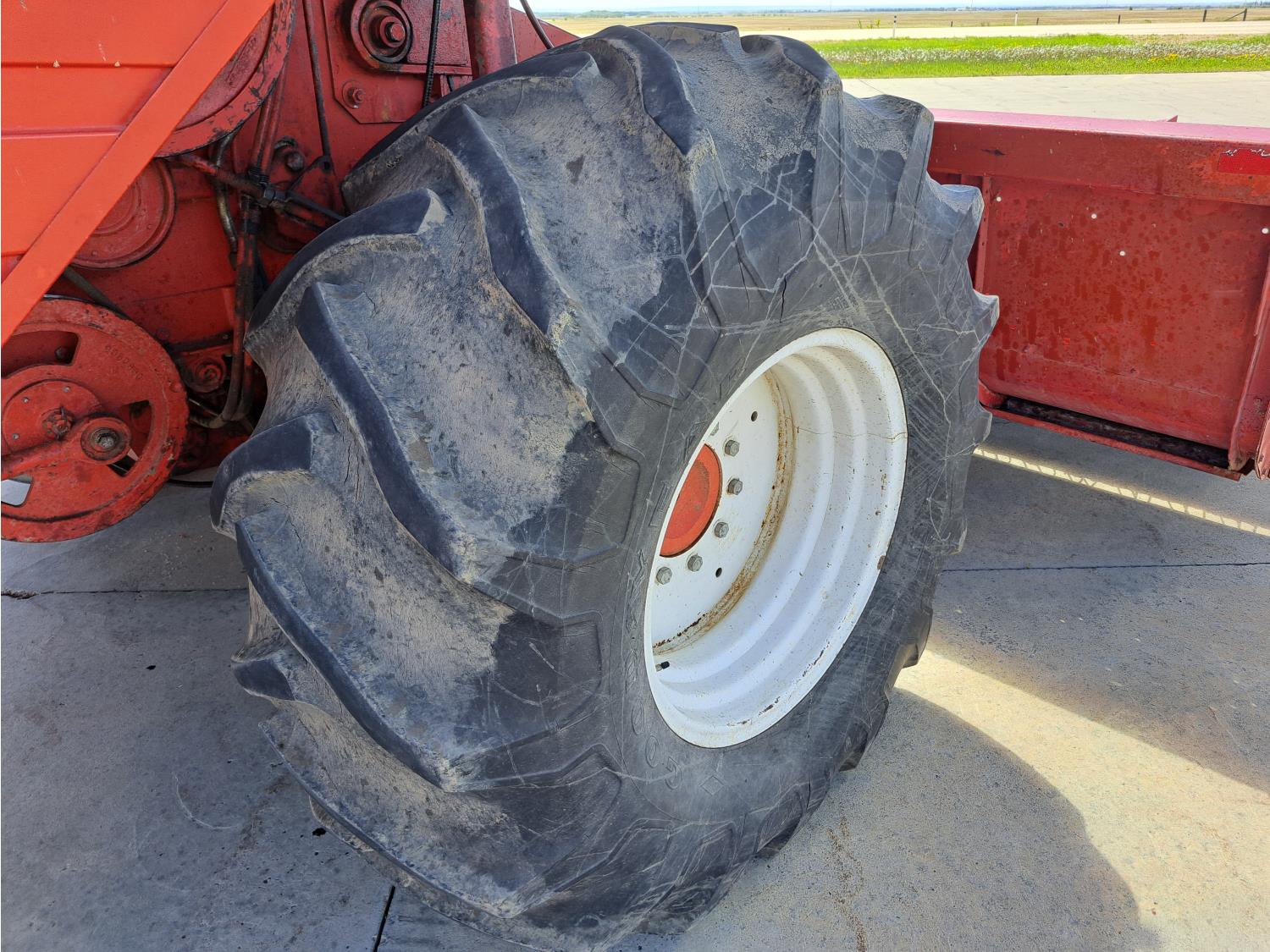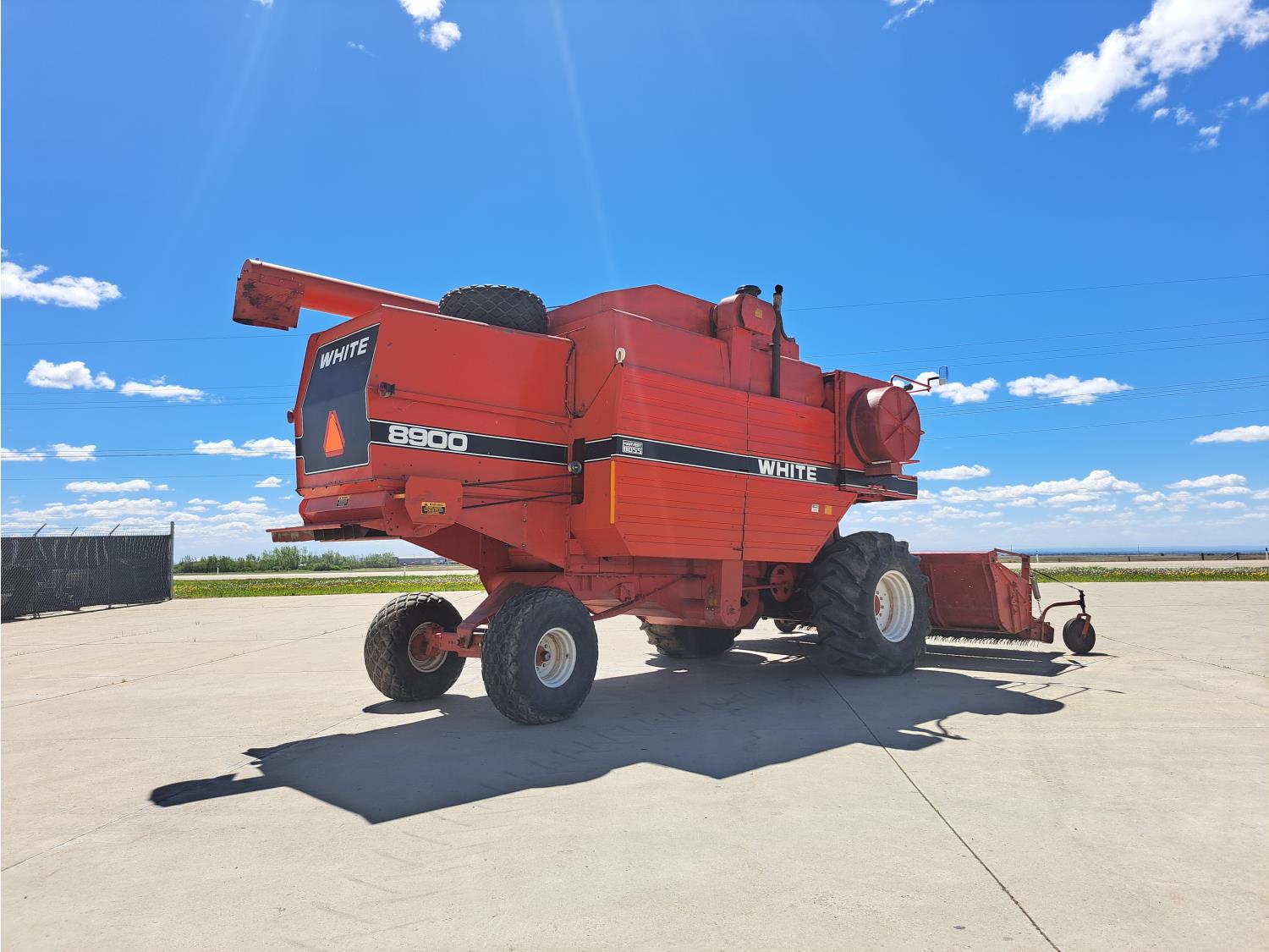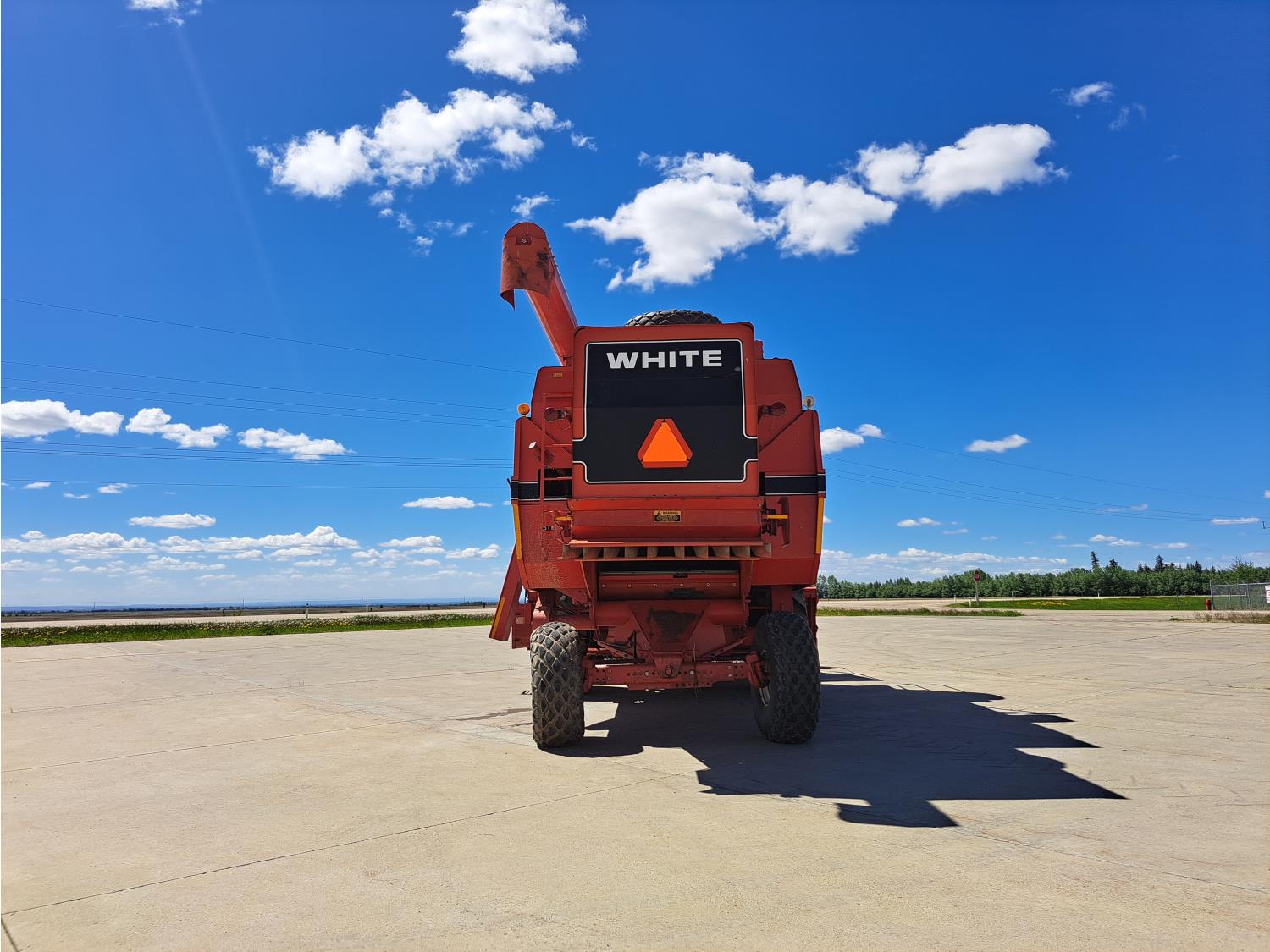 White 990 12 ft pick-up header, rock trap, chopper, 14 ft auger, A/C, radio, 23.1-26 front tires, 16.5L-16.1S rear tires