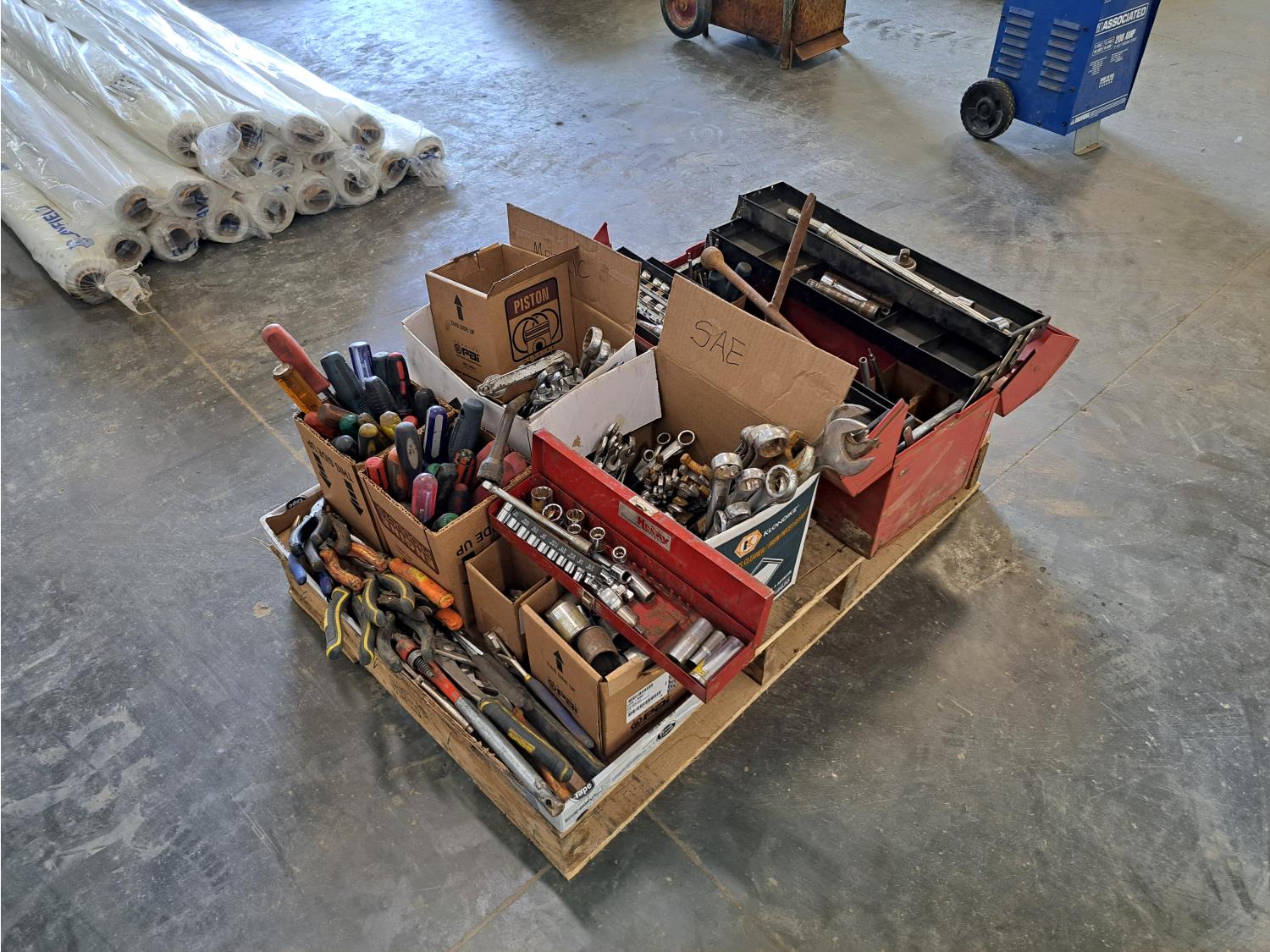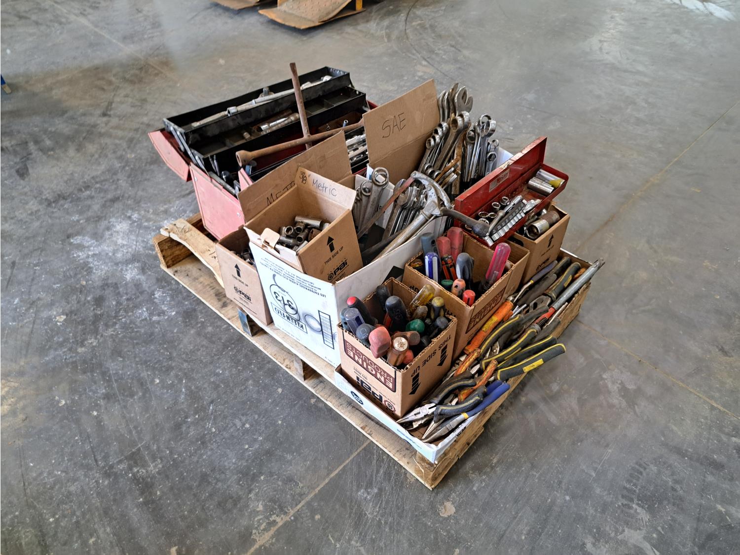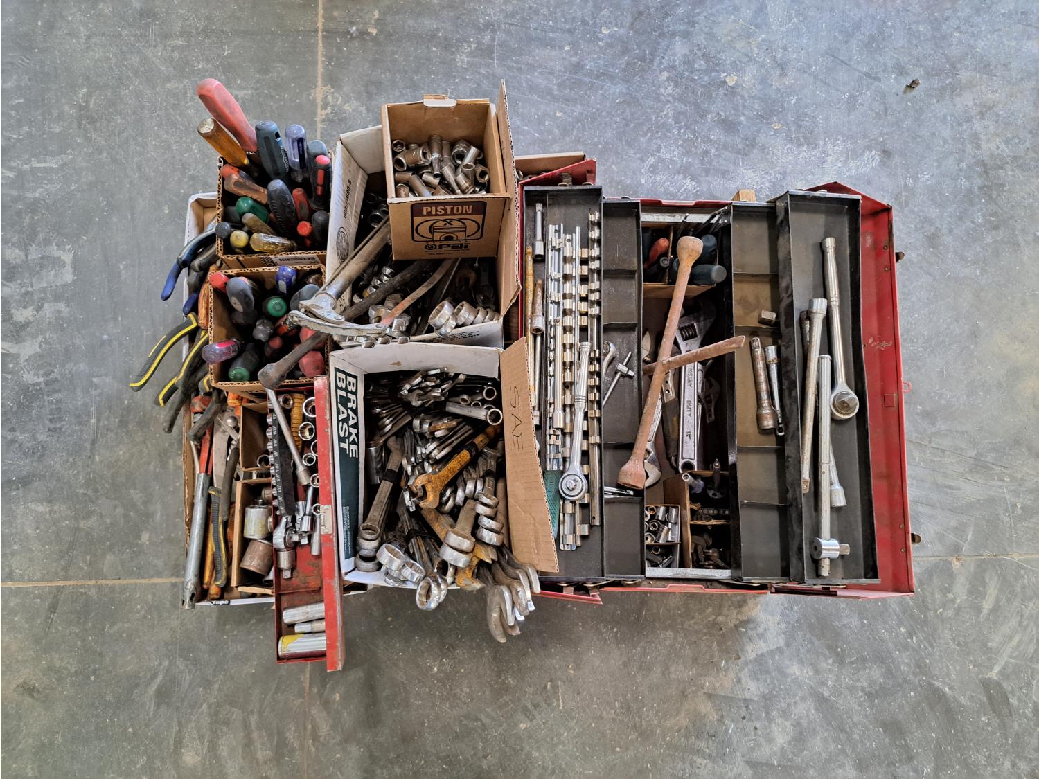 screwdrivers, wrenches, pliers, socket sets.